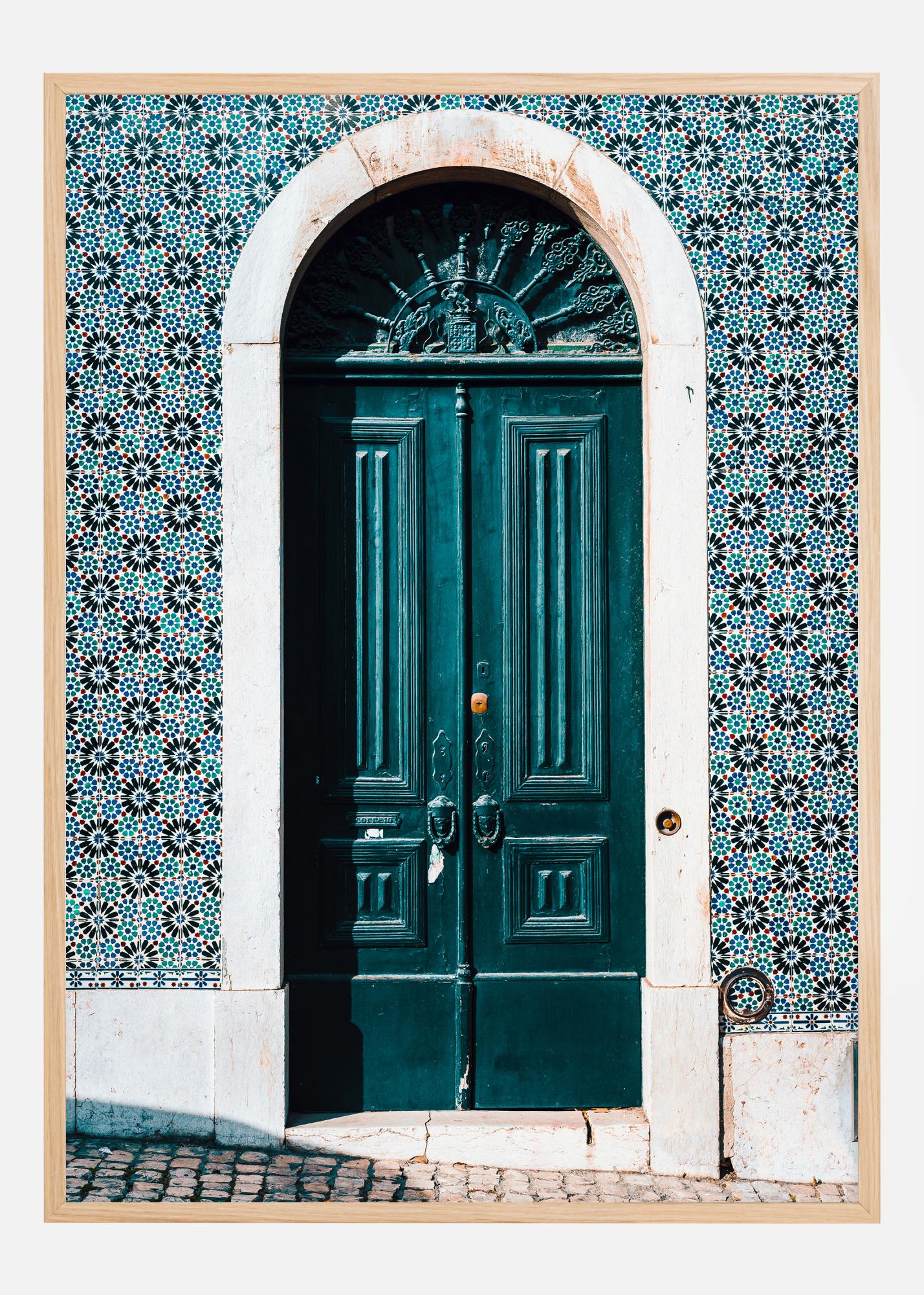 Este elegante póster muestra una majestuosa puerta verde, hermosamente enmarcada por azulejos tradicionales y detallados en azul y blanco. El diseño clásico y el atrevido color de la puerta contrastan con los intrincados patrones, creando una sensación de bienvenida y riqueza cultural. La imagen transmite la sensación de una entrada acogedora a un hogar lleno de historia y carácter.