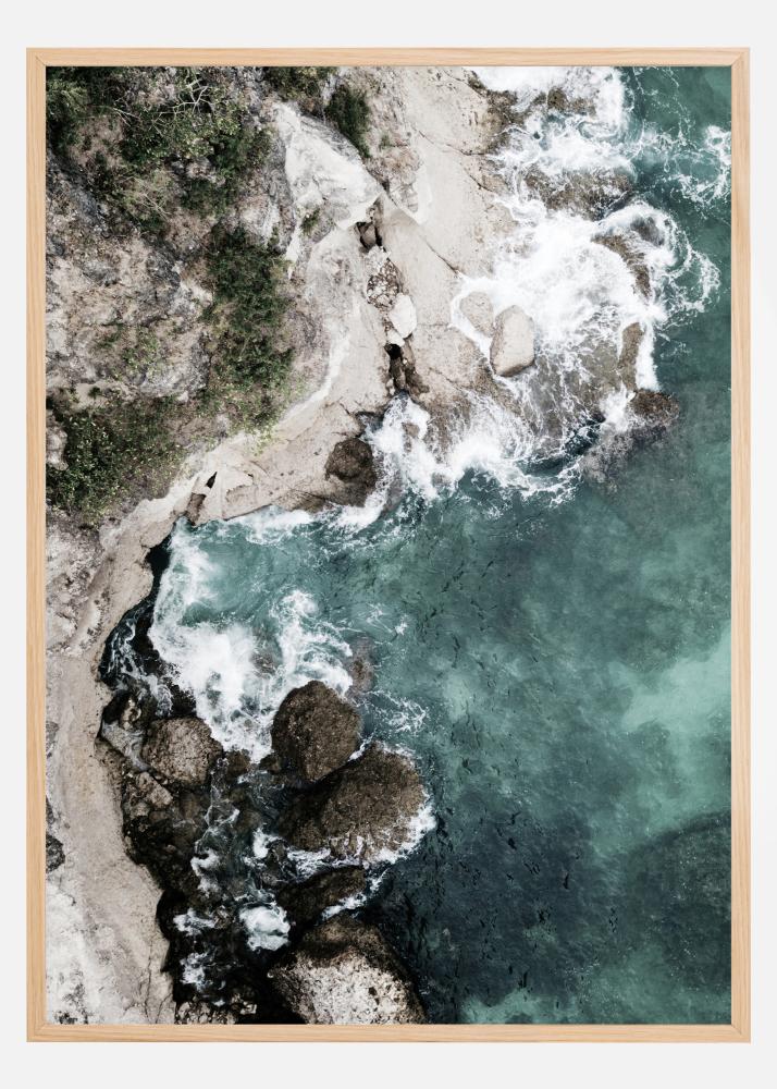 Un póster aéreo del mar con las olas golpeando contra las rocas. Disfruta de la belleza de esta imagen mientras admiras el mar cristalino que chapotea contra las rocas cubiertas de algas. Esta imagen casi te hace sentir el elegante aroma en el aire.