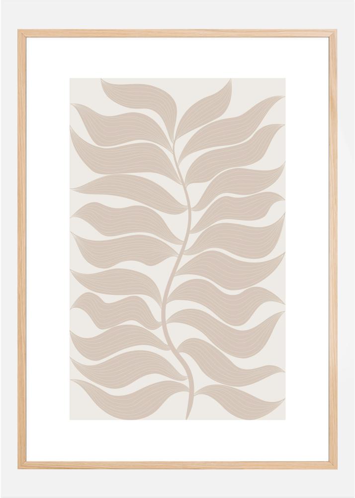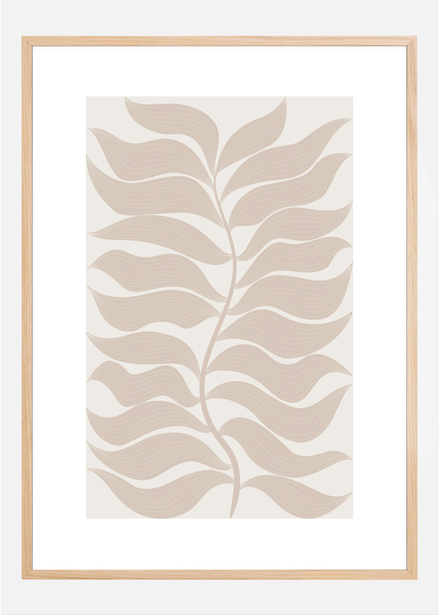 Un póster botánico con hojas. Esta delicada pintura muestra una imagen suave y sencilla de once hojas a cada lado de un tallo. Con un fondo blanco, esta es la impresión perfecta para todos los amantes de la naturaleza o aquellos interesados en las hojas.