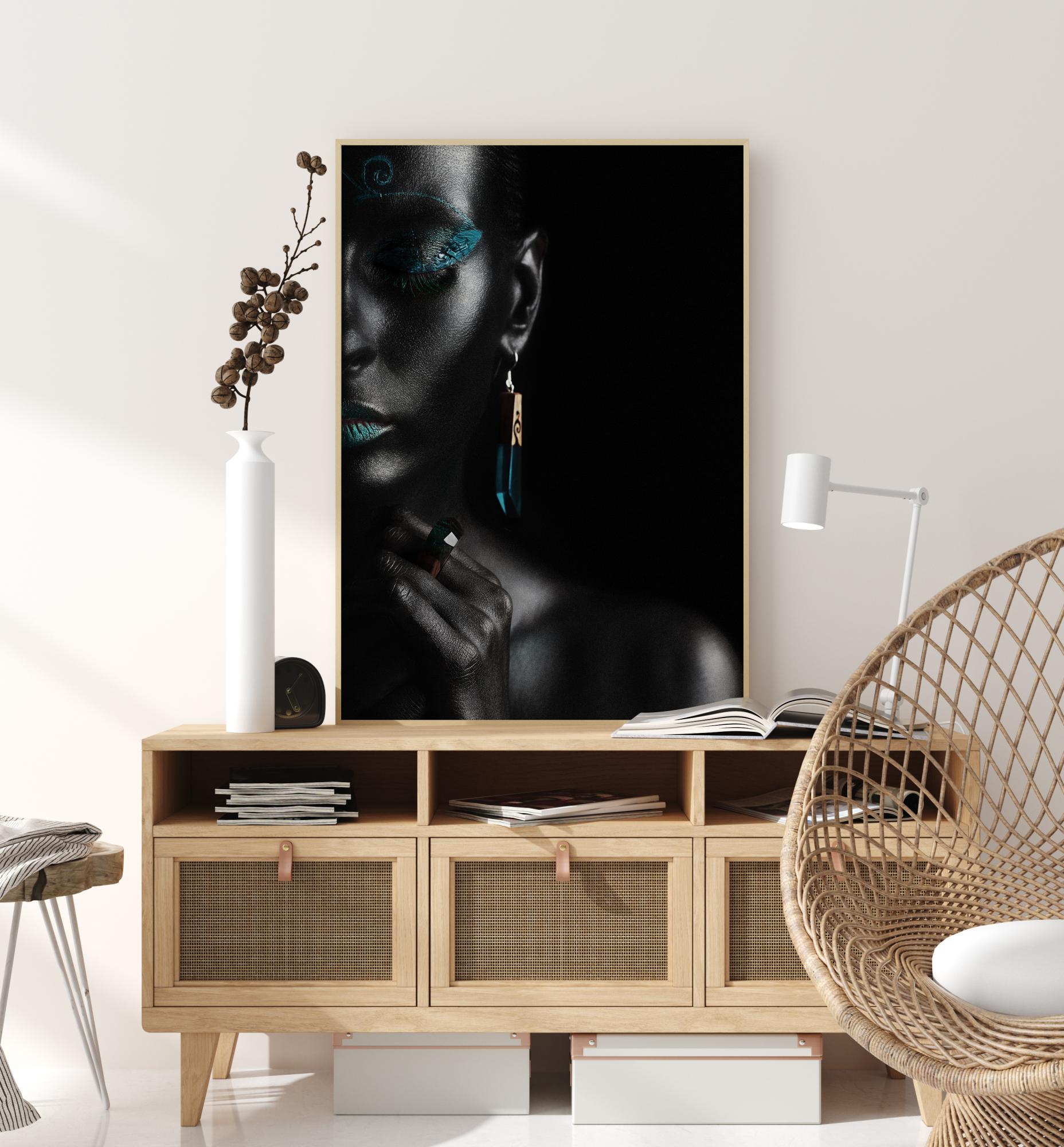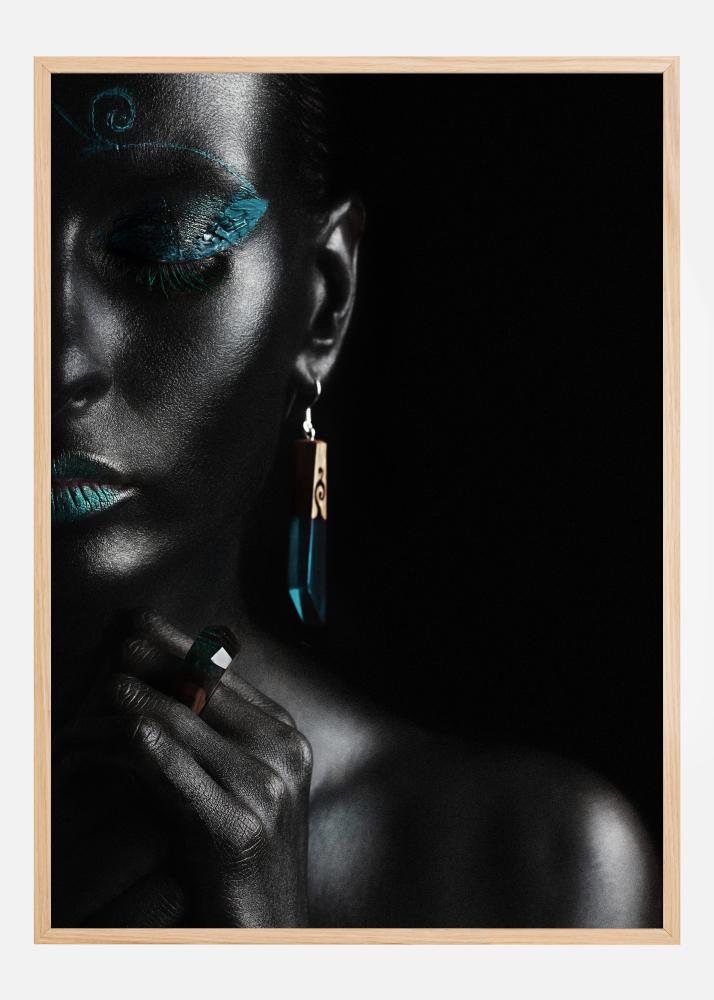 Un fascinante póster que representa a una hermosa mujer profundamente absorta en sus pensamientos. Pintado sobre un fondo negro, los ojos y la boca de la mujer se destacan en un profundo color verde turquesa. La luz de la ventana ilumina su rostro. La luz resalta todos los detalles, lo que hace de esto un retrato perfecto en una pared blanca y vacía.