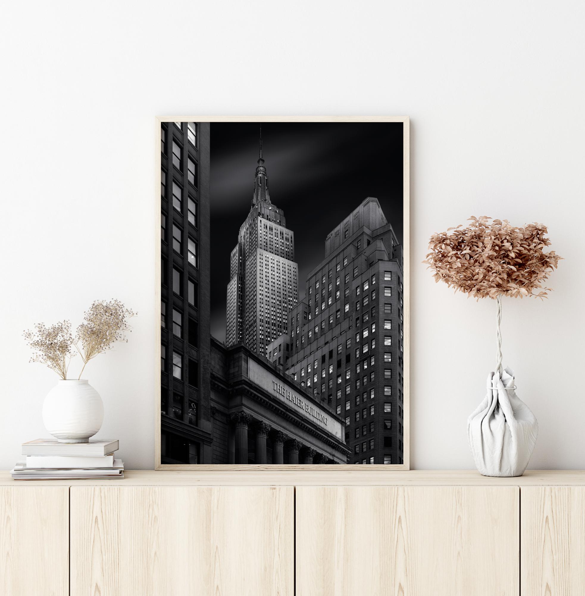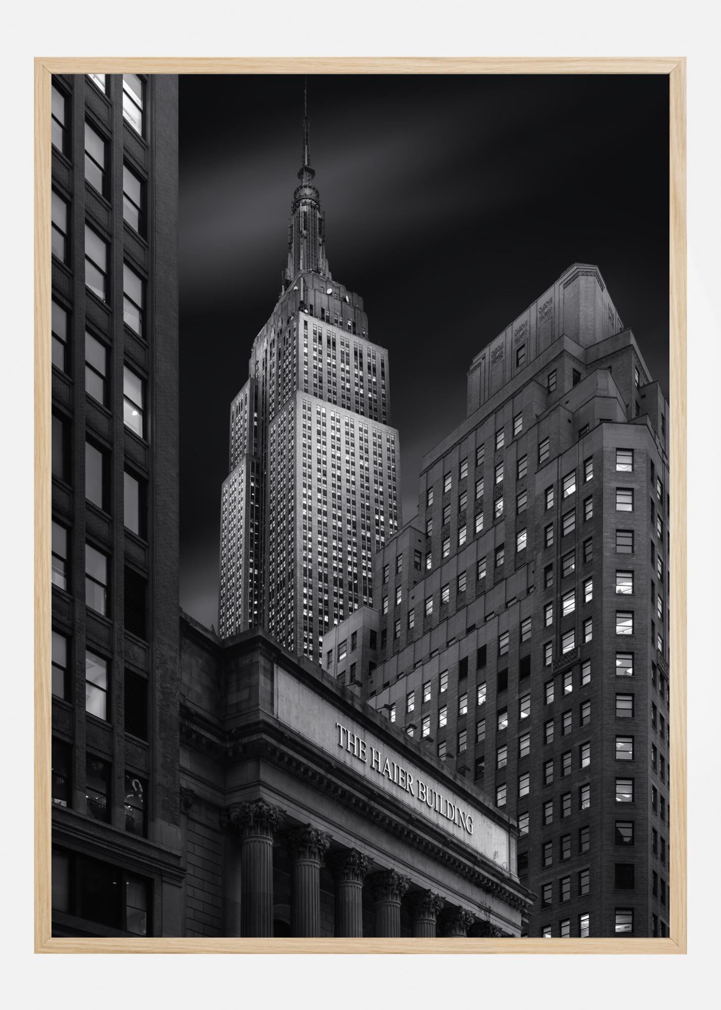 Un póster con el Edificio Haier en Nueva York durante la noche. Las brillantes letras doradas del edificio iluminan y dicen "El Edificio Haier". Con los edificios frente a una vista negra de la ciudad, esta es una imagen muy destacada. Este llamativo póster en blanco y negro del centro de Nueva York es perfecto en una pared blanca.