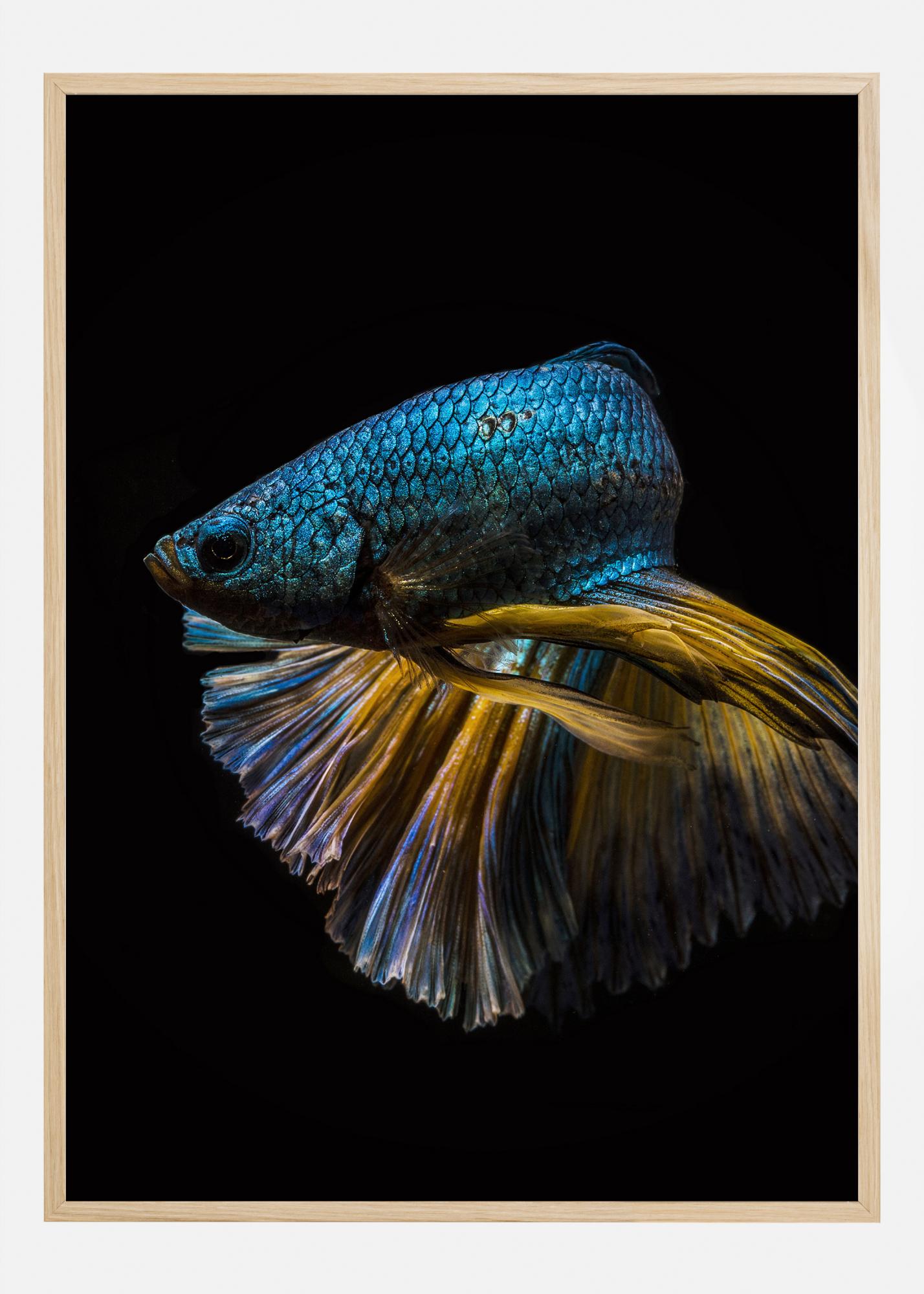 Un magnífico póster de naturaleza con un pez betta siamés multicolor sobre un fondo negro. Cuando se gira hacia la izquierda, muestra su aleta caudal multicolor en una variedad de colores. Cuelga esta hermosa impresión en una pared de color para crear un contraste de colores.
