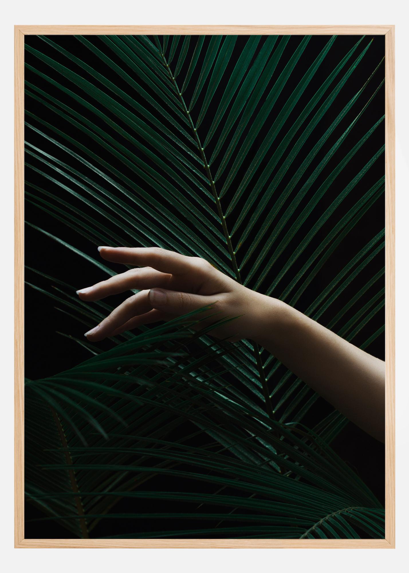 Una fotografía botánica de ramas verdes similares a las palmeras frente a un fondo negro. Una mano extendida aporta un elemento vivo y contrastante. Un póster oscuro que se ve perfecto en una galería de pared más grande.