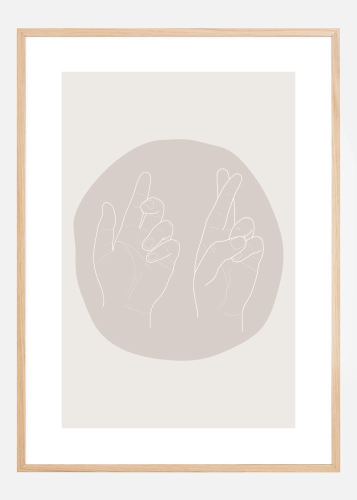 Un sencillo póster de dos manos izquierdas contra una forma redonda de color beige. El círculo ha sido colocado sobre un fondo de color piel con ambas manos apuntando hacia la parte superior del póster. Las manos están relajadas y crean una atmósfera tranquila en tu hogar. Una imagen perfecta para tu estudio.