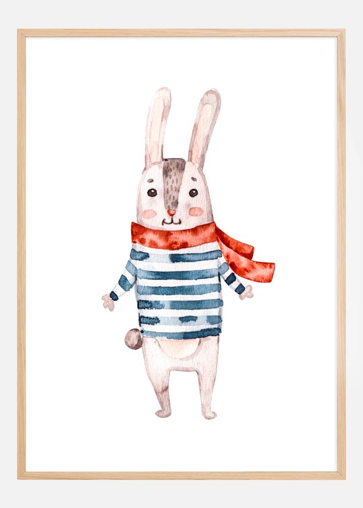 Este encantador póster retrata a un alegre conejo vestido con un suéter a rayas y una bufanda roja ondeante. La cálida sonrisa del conejo y su postura juguetona irradian alegría e inocencia, creando una sensación acogedora e invitadora. La ilustración, realizada en suaves tonos acuarela, tiene una ligereza y sencillez que proporcionan un efecto conmovedor y nostálgico.