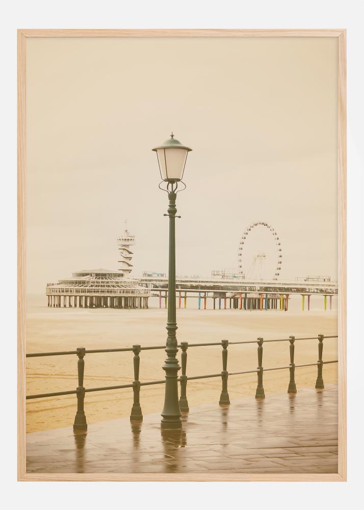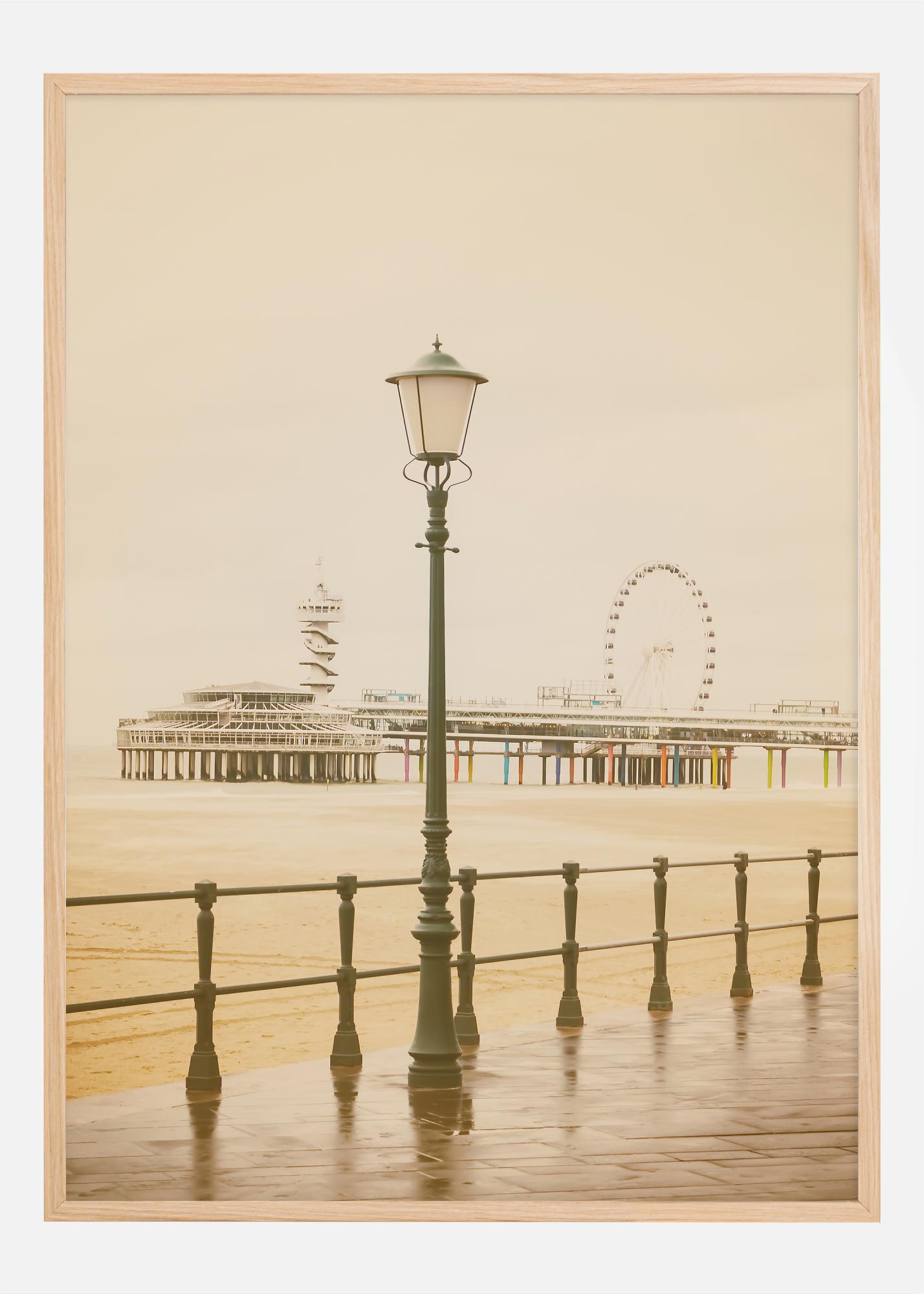 Este póster nostálgico evoca la sensación de un día lento y soñador junto al mar. Una linterna antigua se encuentra en primer plano, un guardián silencioso sobre el paseo marítimo vacío con su balaustrada clásica. En el fondo se ve un muelle con una torre de observación y una gran noria, que añade una sensación de romanticismo atemporal de parque de atracciones. Los suaves tonos sepia y beige refuerzan la sensación de una era pasada e invitan a la reflexión.