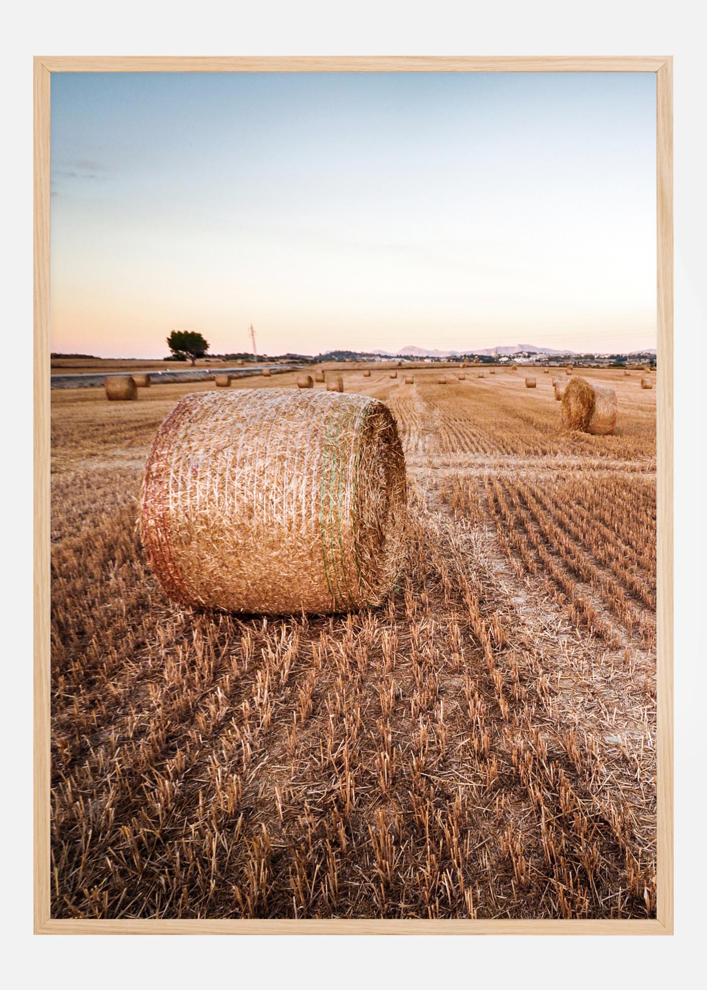 Un póster de naturaleza sencillo pero hermoso. El montón de heno en primer plano ha sido enrollado de manera elegante, mientras que a lo lejos hay otros montones de heno enrollados dispersos por los campos. Un cielo azul claro y los cálidos colores marrones crean una imagen cálida y relajante que se puede colgar en una cocina rural.