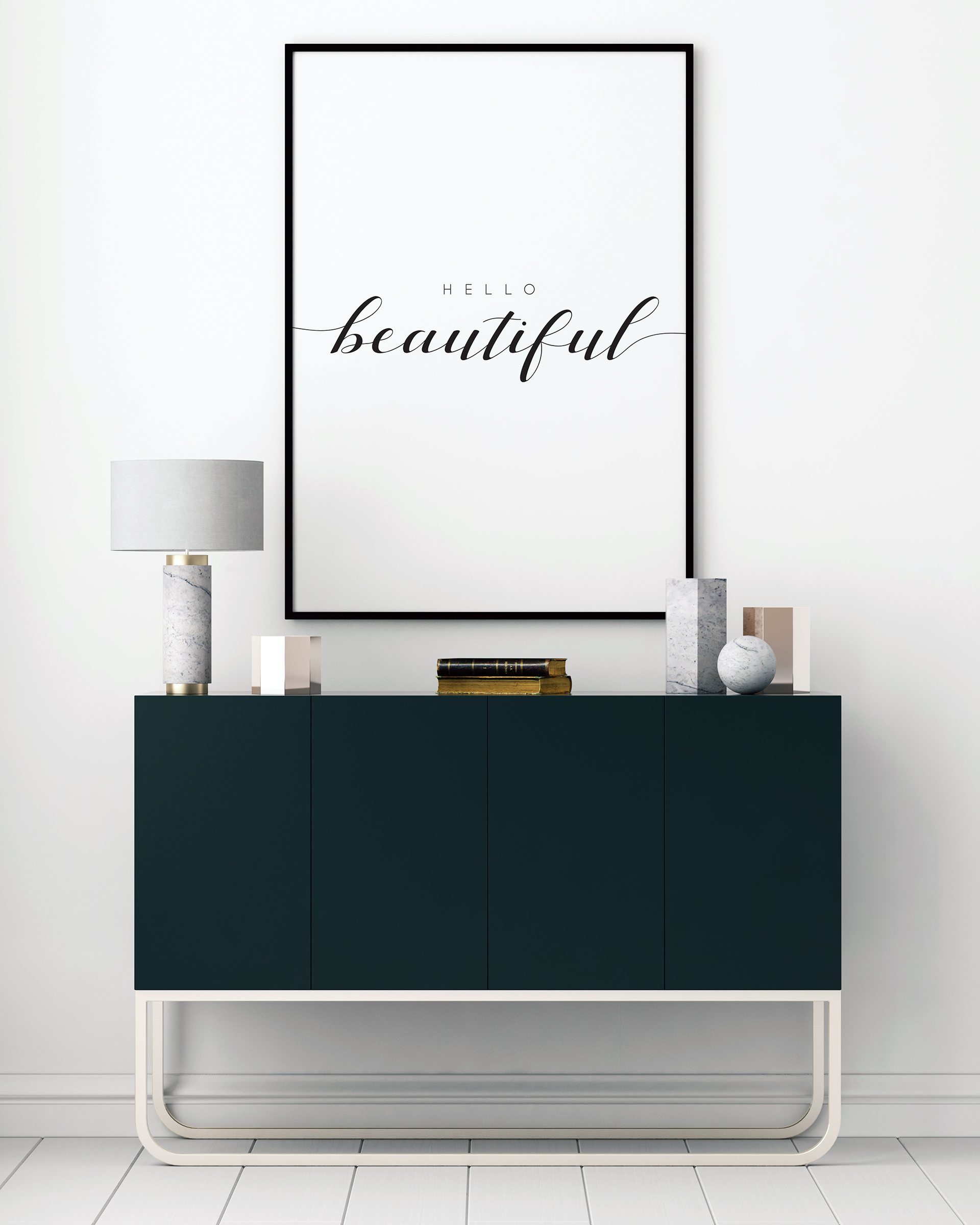 Un póster sencillo en blanco y negro con dos palabras colocadas en el centro de la imagen. La palabra "Hello" está escrita en minúsculas, mientras que la palabra "Beautiful" llama nuestra atención debido a su tamaño y a los elegantes caracteres. Una imagen extremadamente poderosa para colgar en una habitación infantil.