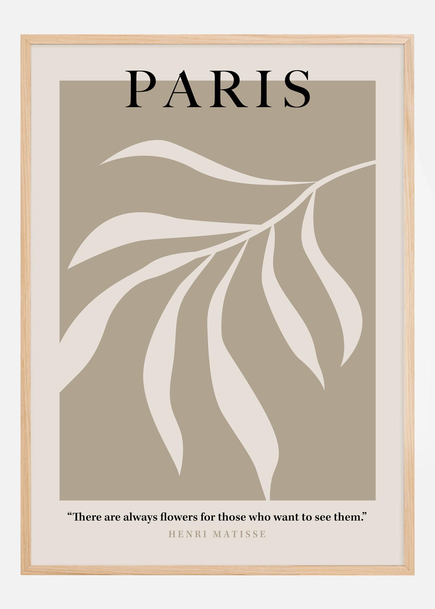 Este póster elegante y estilizado rinde homenaje a París, la ciudad que ha inspirado a tantos artistas y poetas. Su diseño sencillo pero poderoso consiste en líneas blancas que forman una flora abstracta, sobre un fondo beige uniforme. El texto "PARIS" está cuidadosamente colocado en la parte superior, lo que ofrece una asociación directa con la clase y la intemporalidad de la ciudad. En la parte inferior hay una cita de Henri Matisse, "Siempre hay flores para aquellos que quieren verlas", que añade una capa de profundidad y reflexión a este póster ya significativo.