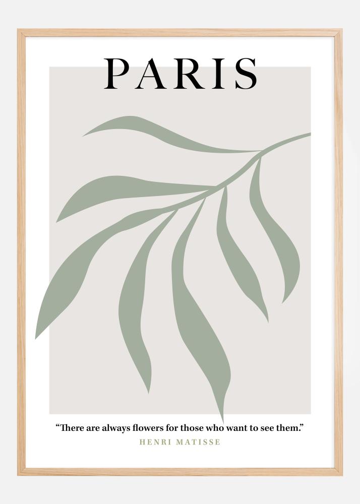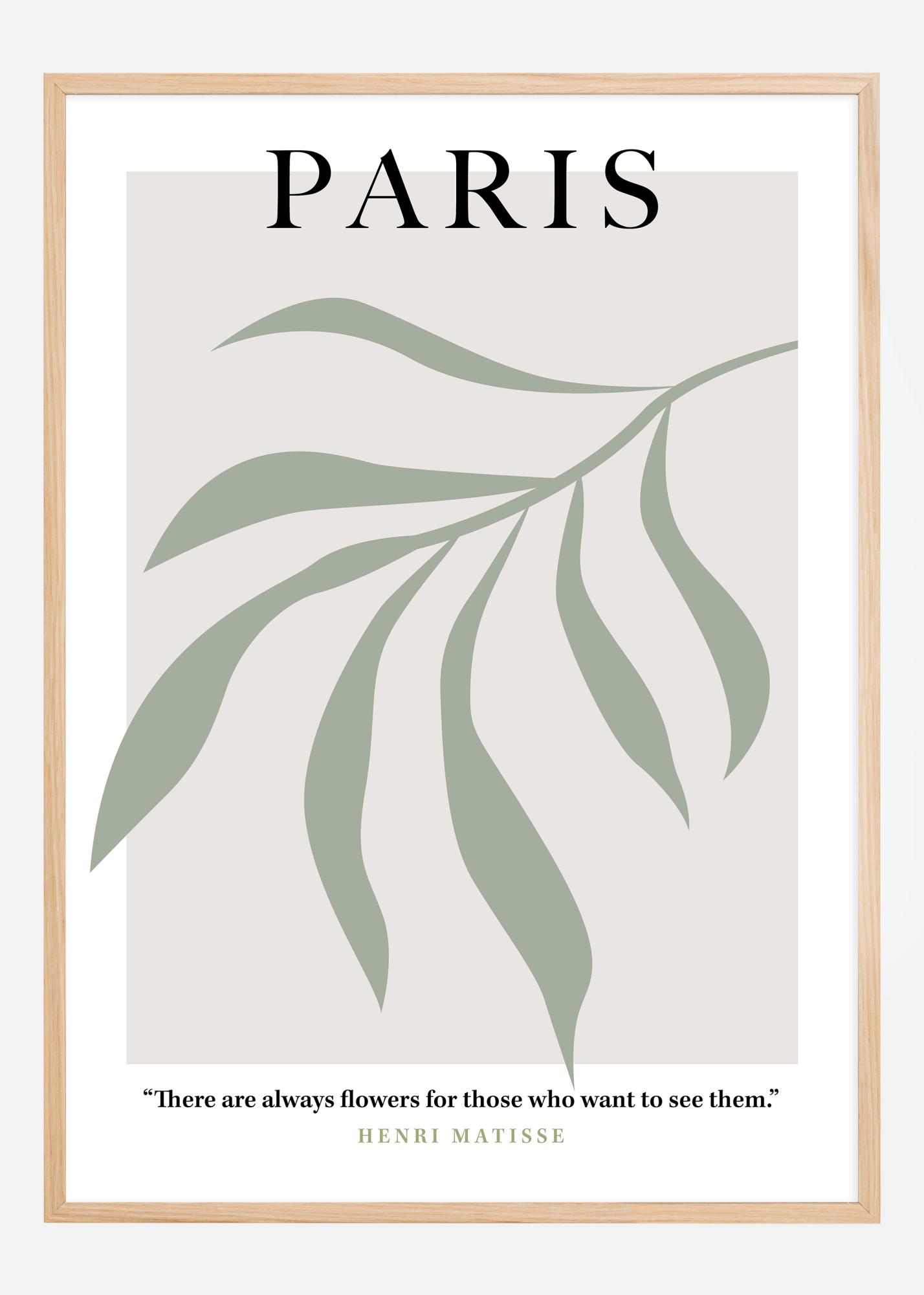 Este póster elegante y estilizado lleva la palabra "PARÍS" en letras grandes, sobre un fondo de líneas verdes suaves que forman una forma abstracta y orgánica, que recuerda a jardines tranquilos y frescos. Su paleta atenuada proporciona una sensación de paz y elegancia sutil, lo que refleja la reputación de la ciudad como un centro de belleza y cultura. Se complementa con una cita inspiradora de Henri Matisse, que le da al póster un toque de sabiduría artística: "Siempre hay flores para aquellos que quieren verlas".