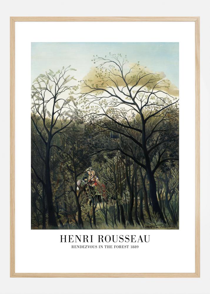 Este cautivador póster, titulado 'Rendezvous en el Bosque' de 1889, es una obra de Henri Rousseau que captura un encuentro secreto en el frondoso bosque. Perfecto para aquellos que buscan una impresión artística que sea a la vez clásica y misteriosa, la imagen retrata una escena extraordinaria donde una figura vestida de rojo parece fusionarse con la vegetación circundante. Los colores principales en esta pieza son una sinfonía de verde, variando desde musgo profundo hasta tonos suaves y pálidos que se complementan entre sí y brindan una sensación de profundidad y dimensión al entorno forestal. Tonos aireados de beige y azul abren el cielo y dan la impresión de un paisaje extenso, que es tanto pacífico como acogedor.