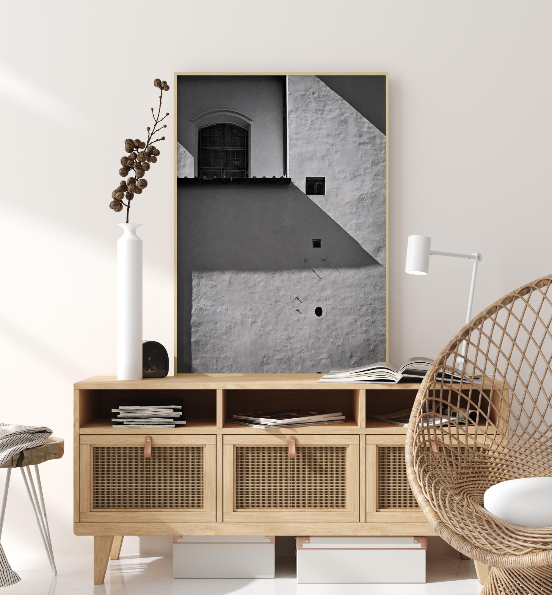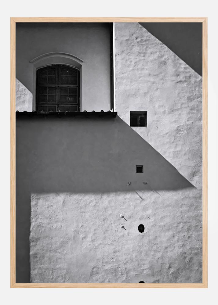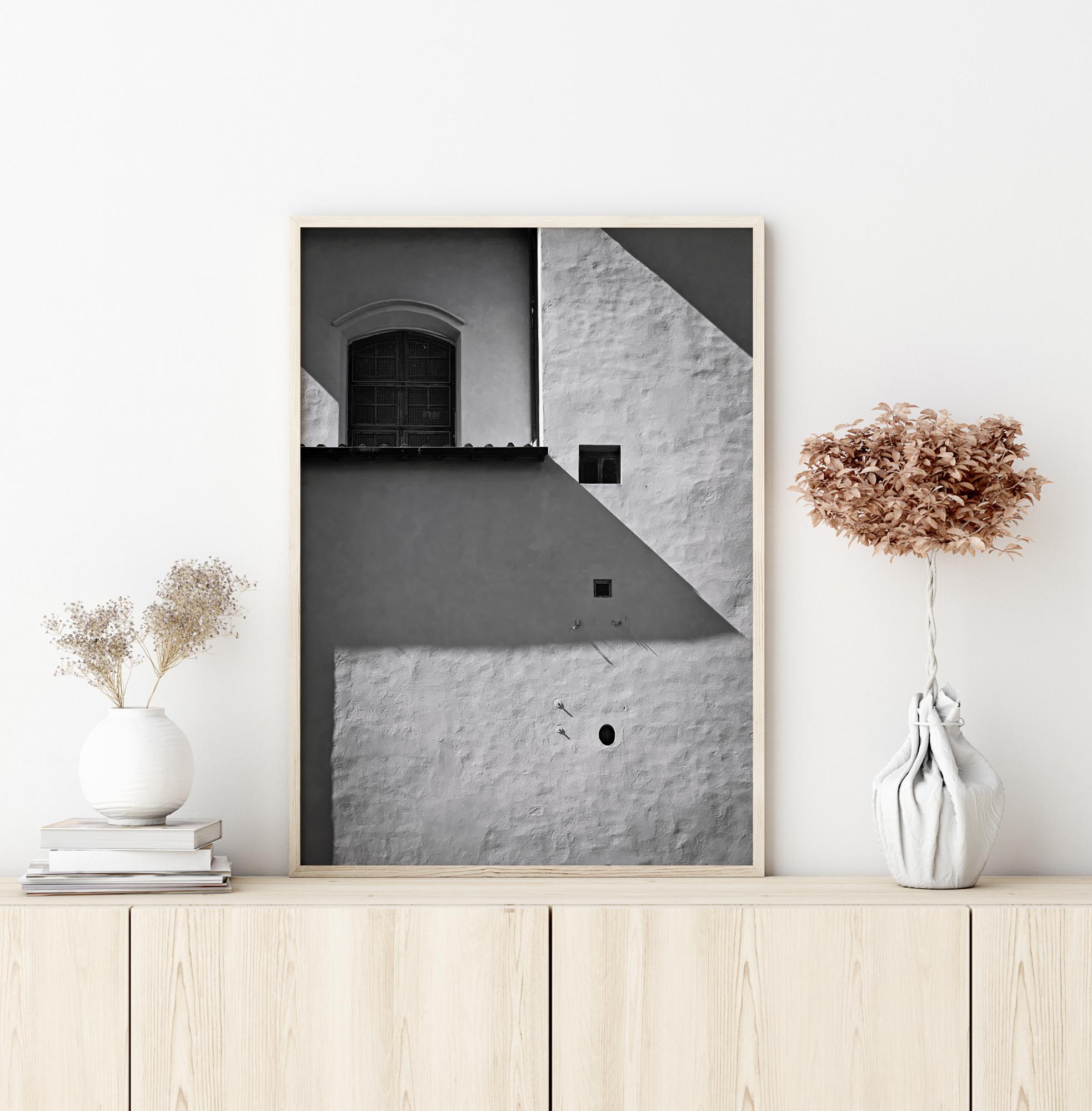 Un póster sencillo pero hermoso en blanco y negro con una puerta de árbol en el centro de la imagen. La luz natural del sol proyecta una sombra en la pared. Cuatro pequeños agujeros están colocados uno debajo del otro a la derecha de la imagen. Usa tu imaginación para descubrir qué hay detrás de la gran puerta de árbol.