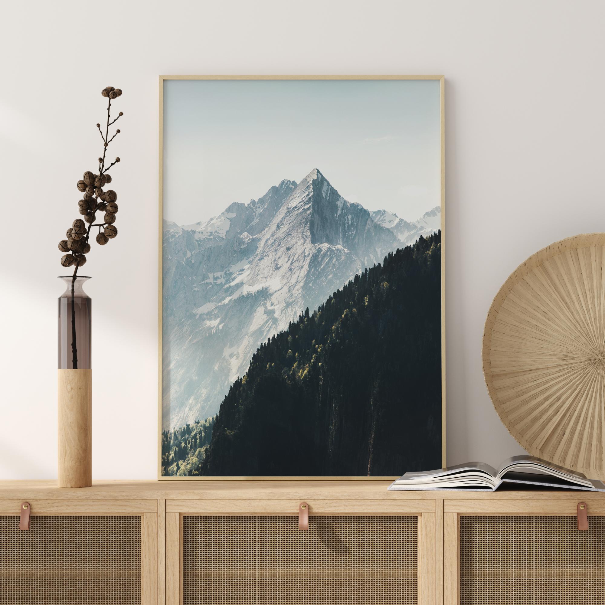 Un entorno paisajístico natural con montañas cubiertas de nieve contra un cielo azul claro. En primer plano, un bosque verde oscuro cubre parcialmente la vista de las montañas y crea una hermosa atmósfera invernal. Un póster perfecto para colgar sobre una chimenea.