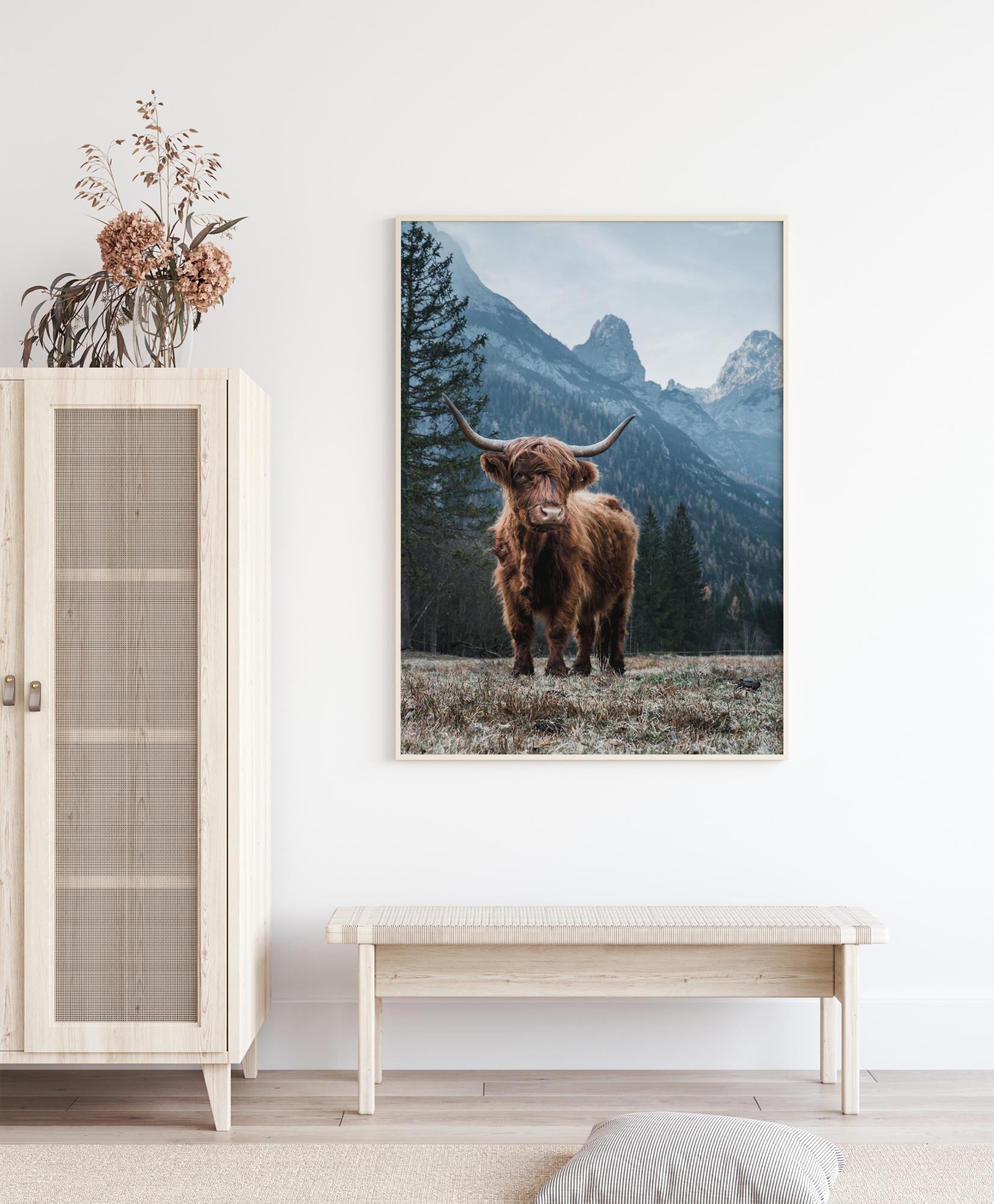 Un póster salvaje de una vaca de las tierras altas de color marrón rojizo que está sola en un campo. Las montañas empinadas cubiertas de nieve enmarcan a este hermoso animal. Con su pelaje corto y peludo que puede resistir condiciones difíciles, el animal parece no verse afectado por nada. Usa tu imaginación y visualízate en las tierras altas escocesas.