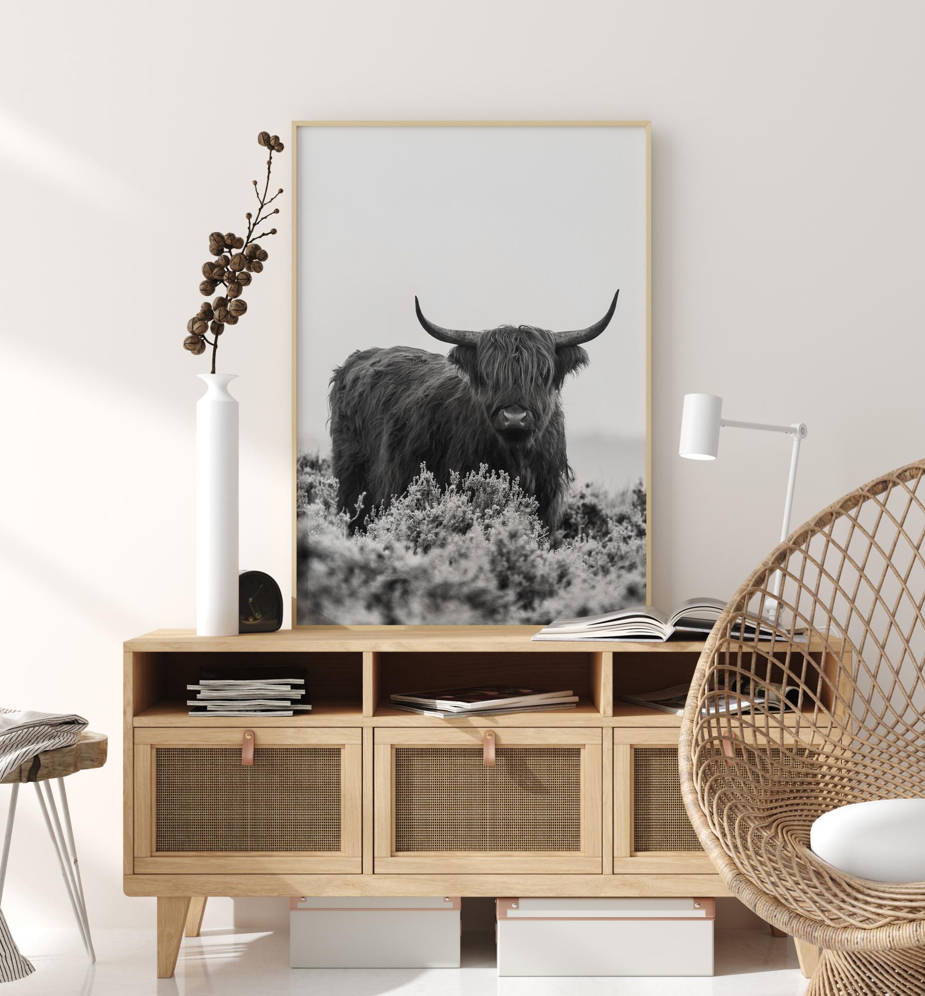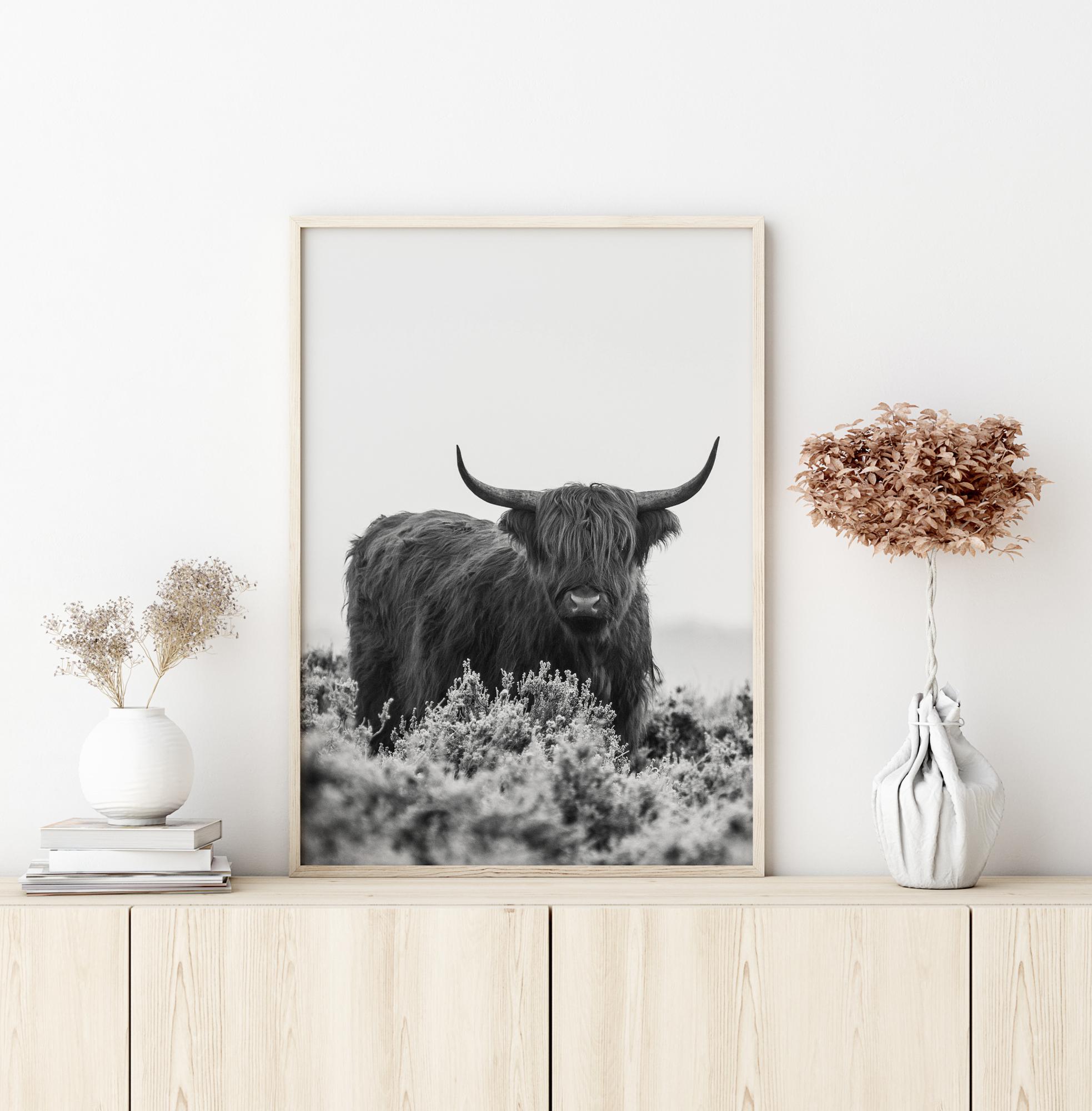 Un hermoso póster de animales que representa a una vaca solitaria en el páramo. Rodeado de hierba alta, este magnífico animal mira directamente a la cámara. Mientras está parado contra un cielo gris y hierba alta, casi puedes sentir el viento frío en tu rostro. Una imagen perfecta para todos los amantes de los animales.