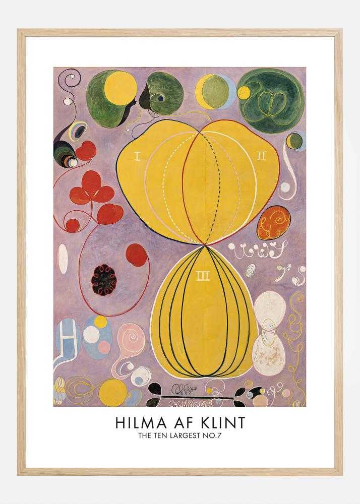 Este póster, que presenta 'Los Diez Más Grandes No.7' de Hilma af Klint, es una verdadera fiesta para los ojos, llena de formas juguetonas y colores audaces. En el centro de la obra hay una gran figura amarilla, dividida en tres secciones, rodeada por una sinfonía de curvas, círculos y espirales en un espectro de rojo, verde y azul. Las formas abstractas y los elementos ocultos sobre un fondo lila hacen de esta obra de arte una experiencia mística y meditativa. Esta impresión artística ofrece una combinación única de estética y filosofía, reflejando la ambición de af Klint de enlazar lo físico con lo espiritual.
