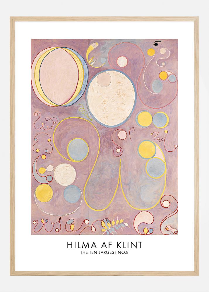 Este póster muestra 'The Ten Largest No.8', una parte de la notable obra de Hilma af Klint que explora dimensiones espirituales a través del arte abstracto. Esta delicada composición utiliza colores pastel suaves y formas fluidas para crear una sensación de armonía y equilibrio universal. Las formas circulares superpuestas y las espirales, destacadas por líneas en rojo cálido y amarillo contra un fondo rosa calmante, irradian una atmósfera envolvente de calma y reflexión. Esta impresión es una representación fantástica de la audaz y atemporal visión de af Klint, y sería una adición inspiradora y meditativa a cualquier espacio.