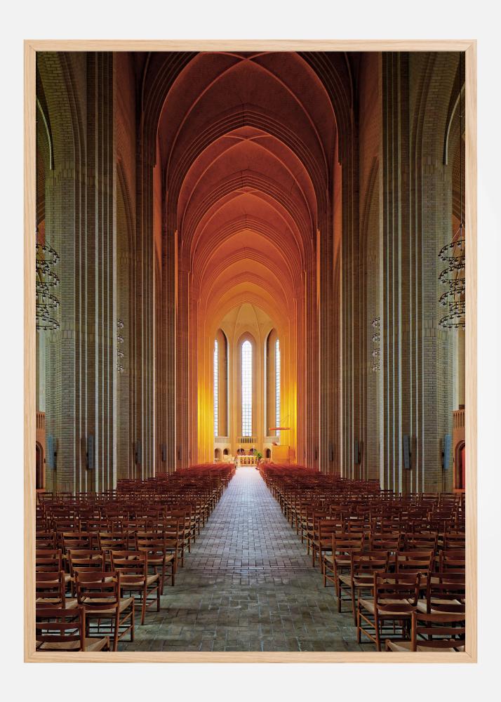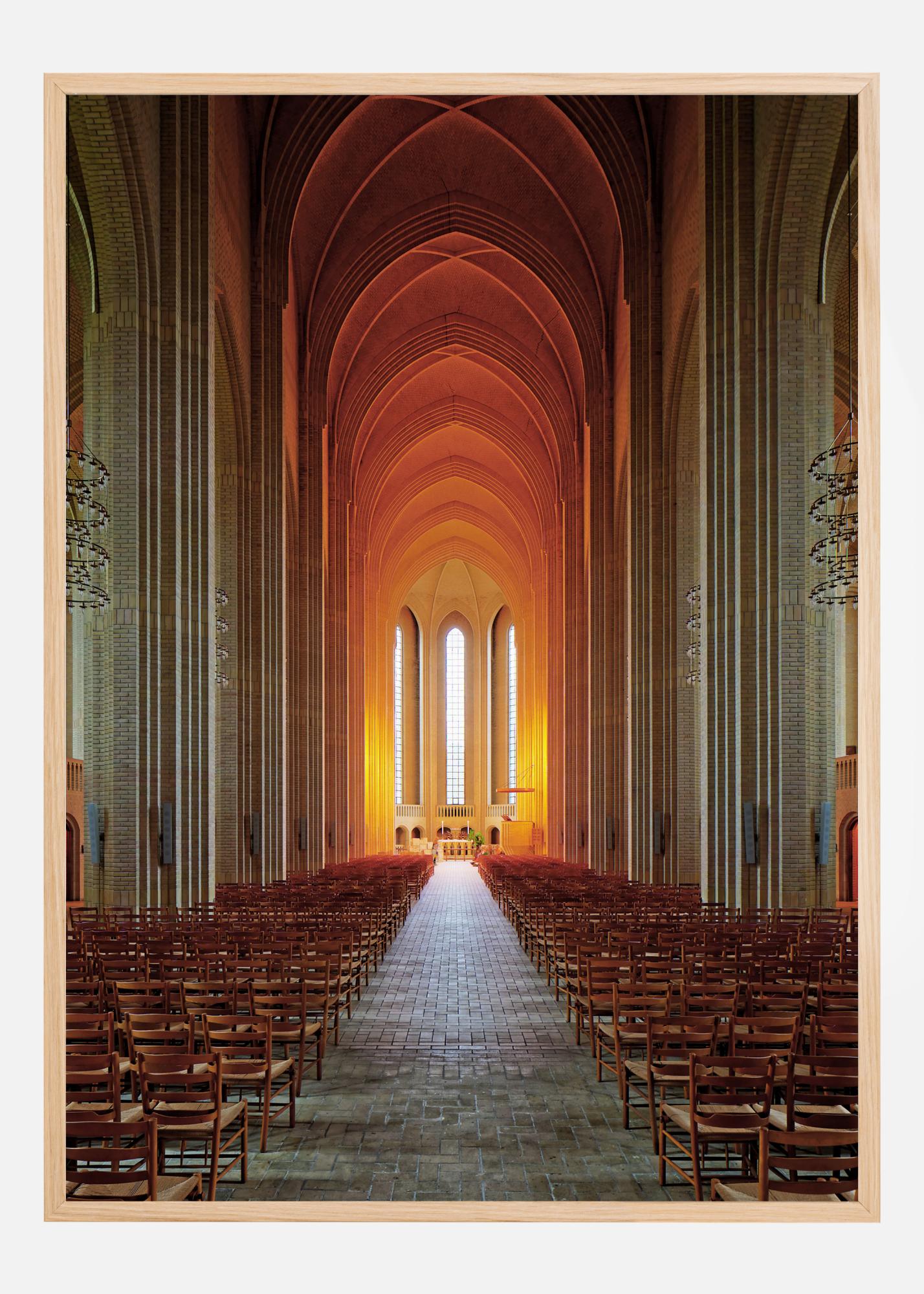 Un fascinante póster arquitectónico dentro de una iglesia. El largo recibidor de la iglesia conduce al altar y el alto techo y las columnas de piedra crean una sensación muy tranquila. La luz naranja se refleja a través de las ventanas y crea una sensación de calidez y armonía. Experimenta la tranquilidad en esta imagen.