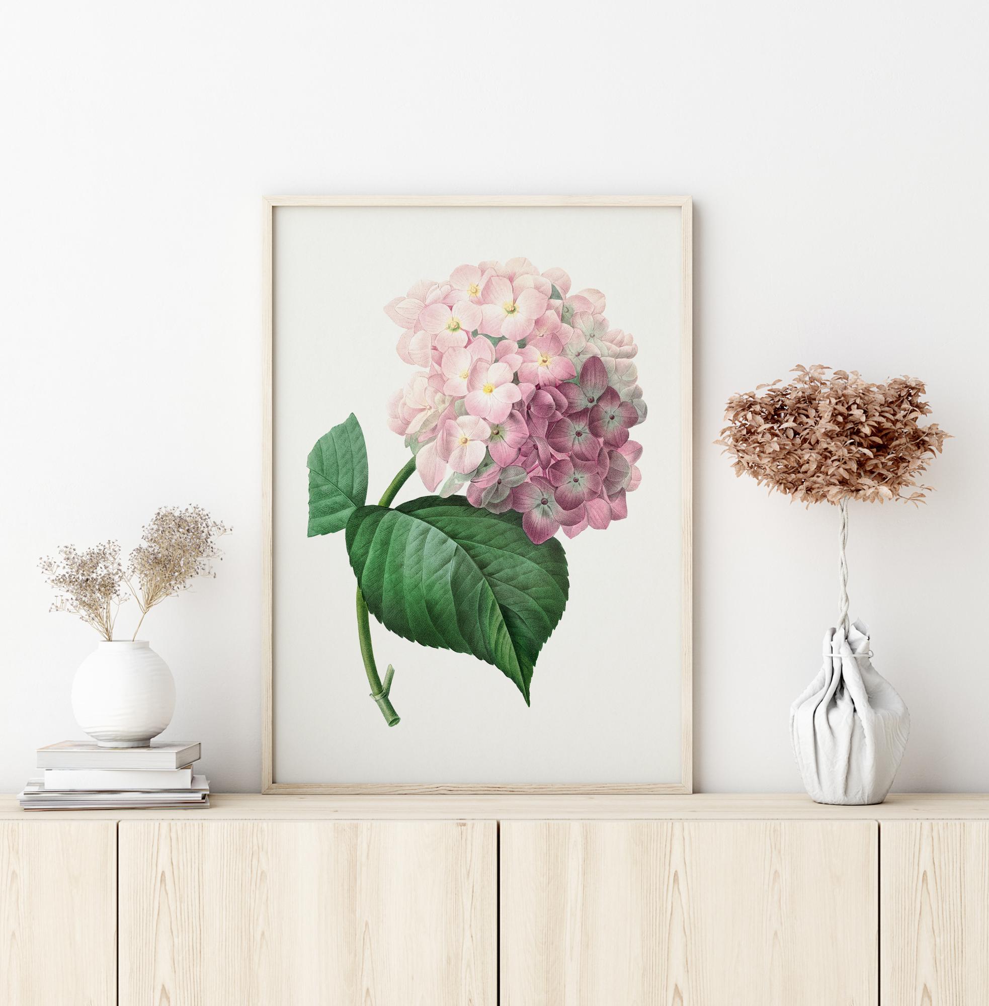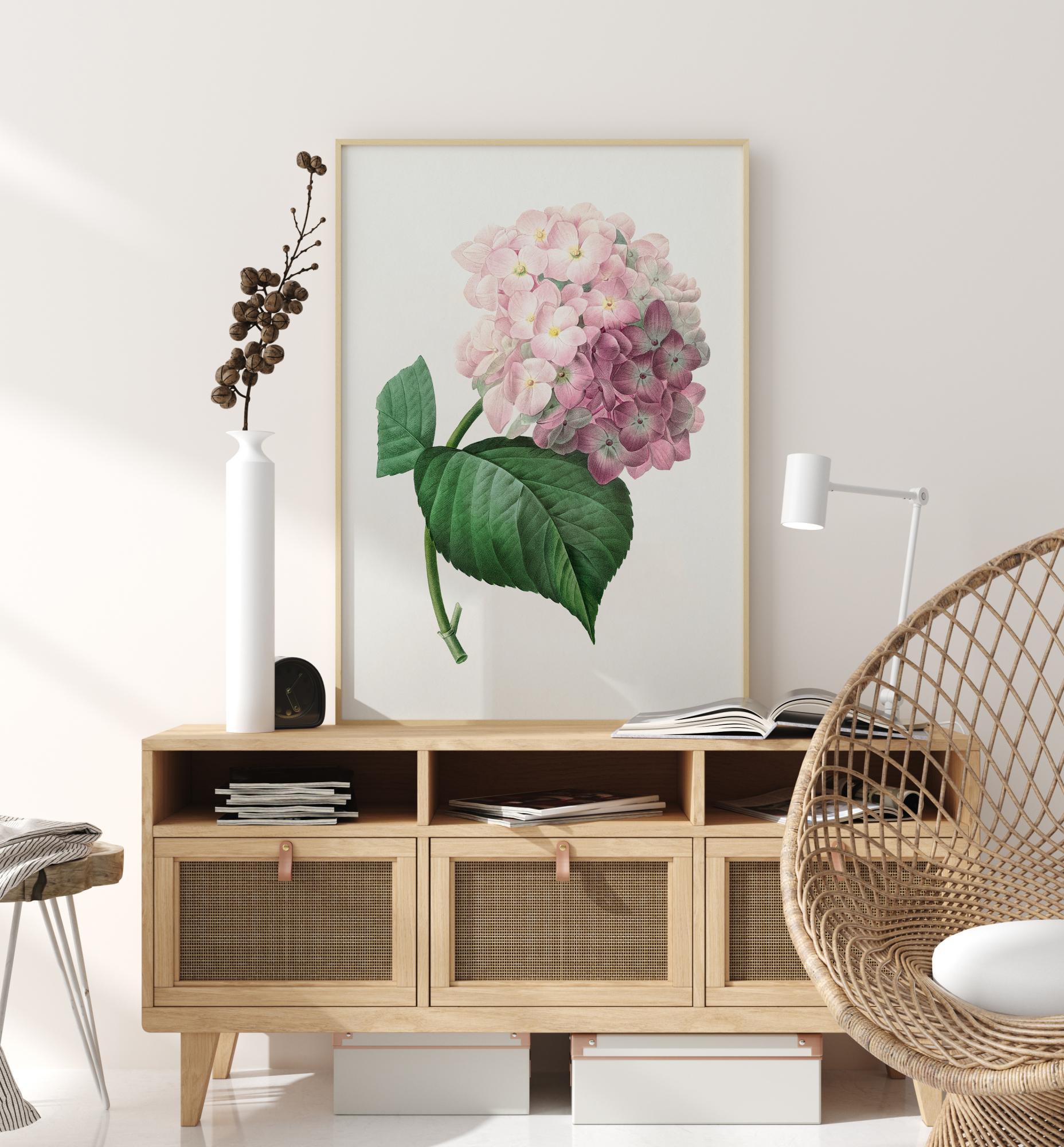 Un póster floral con una hortensia. Pétalos suavemente rosados con un tallo verde suave y una hoja verde dominan en el centro de la imagen. Con un fondo blanco puro, esta hermosa pero delicada flor brinda una sensación de calma y tranquilidad. Cuelga esta imagen en un invernadero de invierno para darle un toque de clase adicional a la habitación.