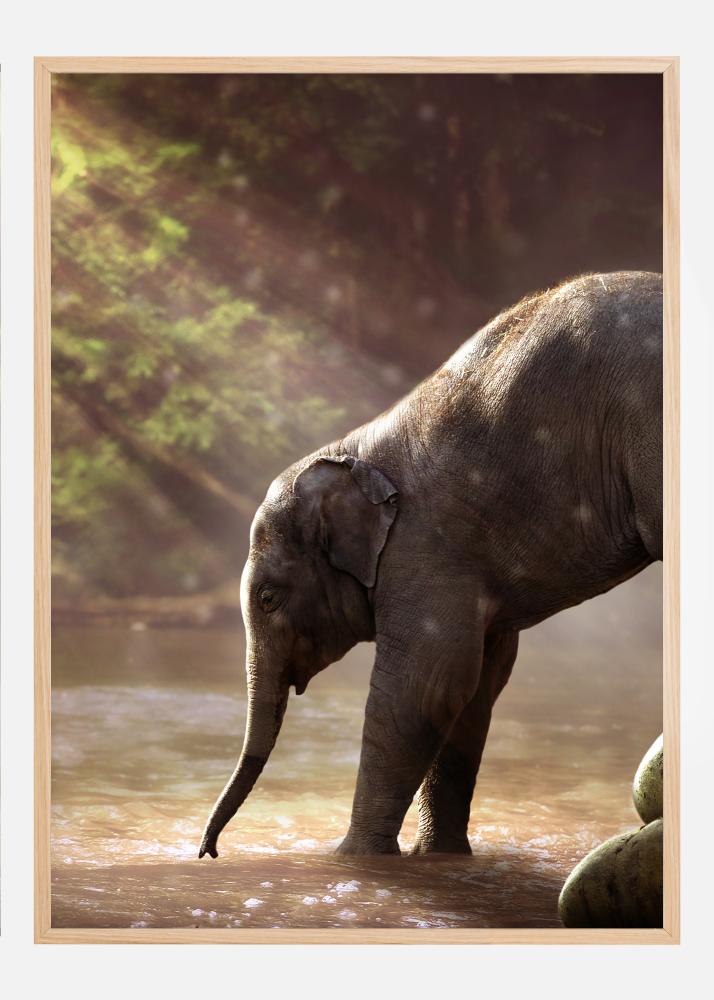Una dulce foto de un elefante bebé que es alegre por su madre a entrar en el río. La luz del día brilla a través de los árboles y se refleja en el agua, creando una sensación de calidez. El elefante bebé duda en entrar en el agua, pero la madre le ayuda suavemente. Este lindo póster refleja el intenso amor entre madre e hijo.