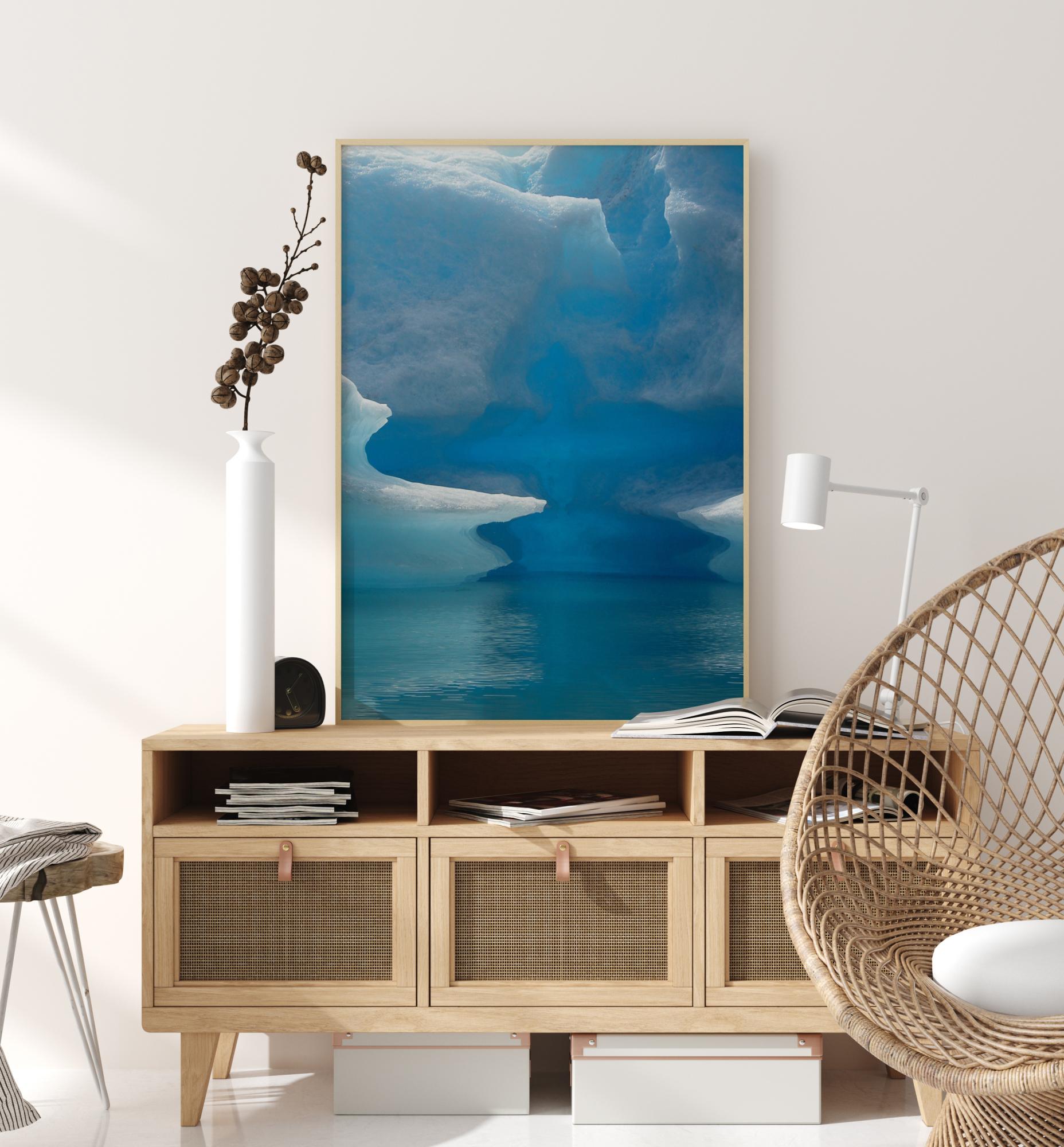 Un apacible póster con un iceberg cristalino azul. Los afilados y blancos icebergs se reflejan en el mar transparente. El cielo azul claro se refleja en el profundo y frío mar, creando una atmósfera fresca. Las diferentes tonalidades de azul iluminarán cualquier habitación.