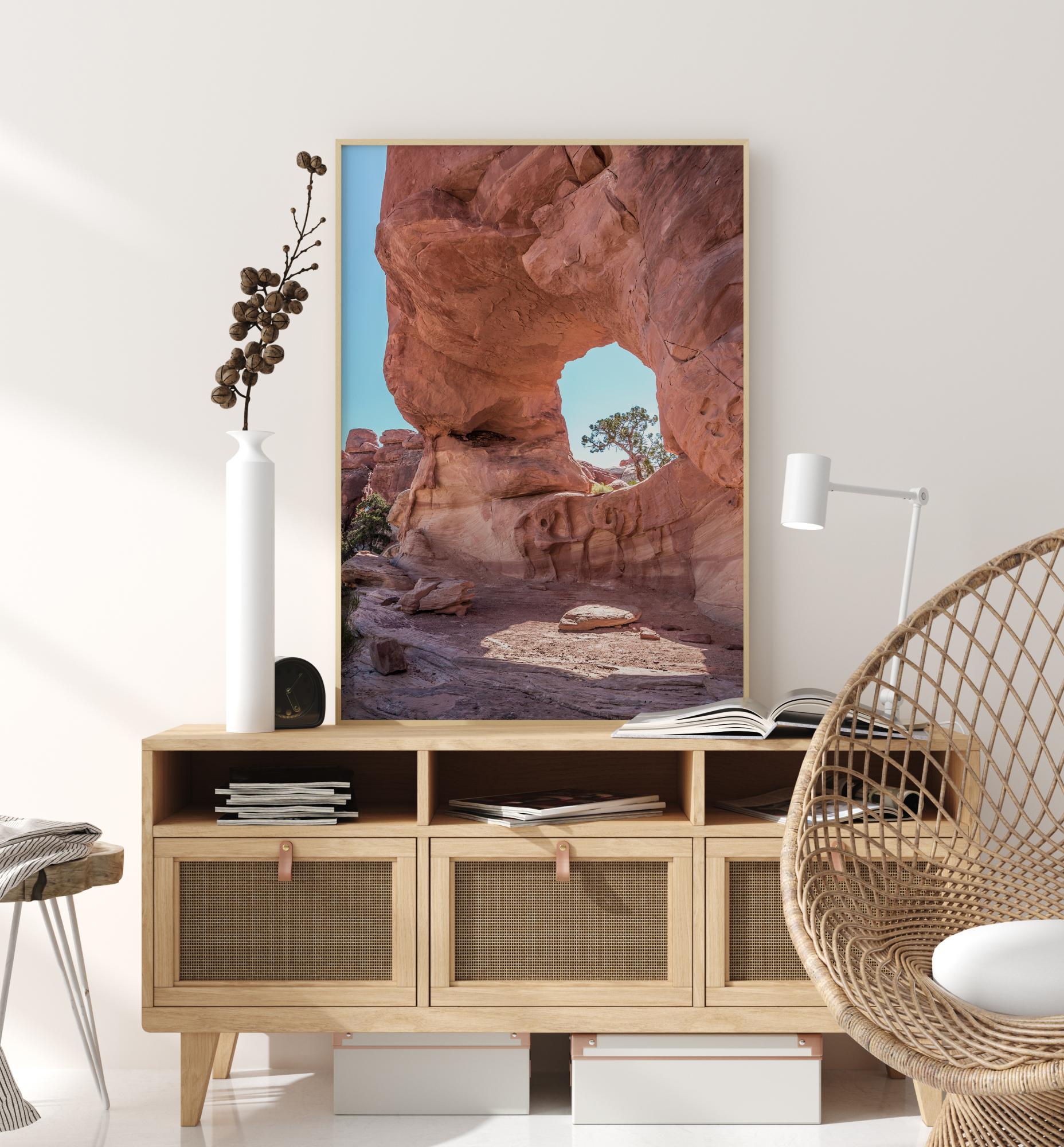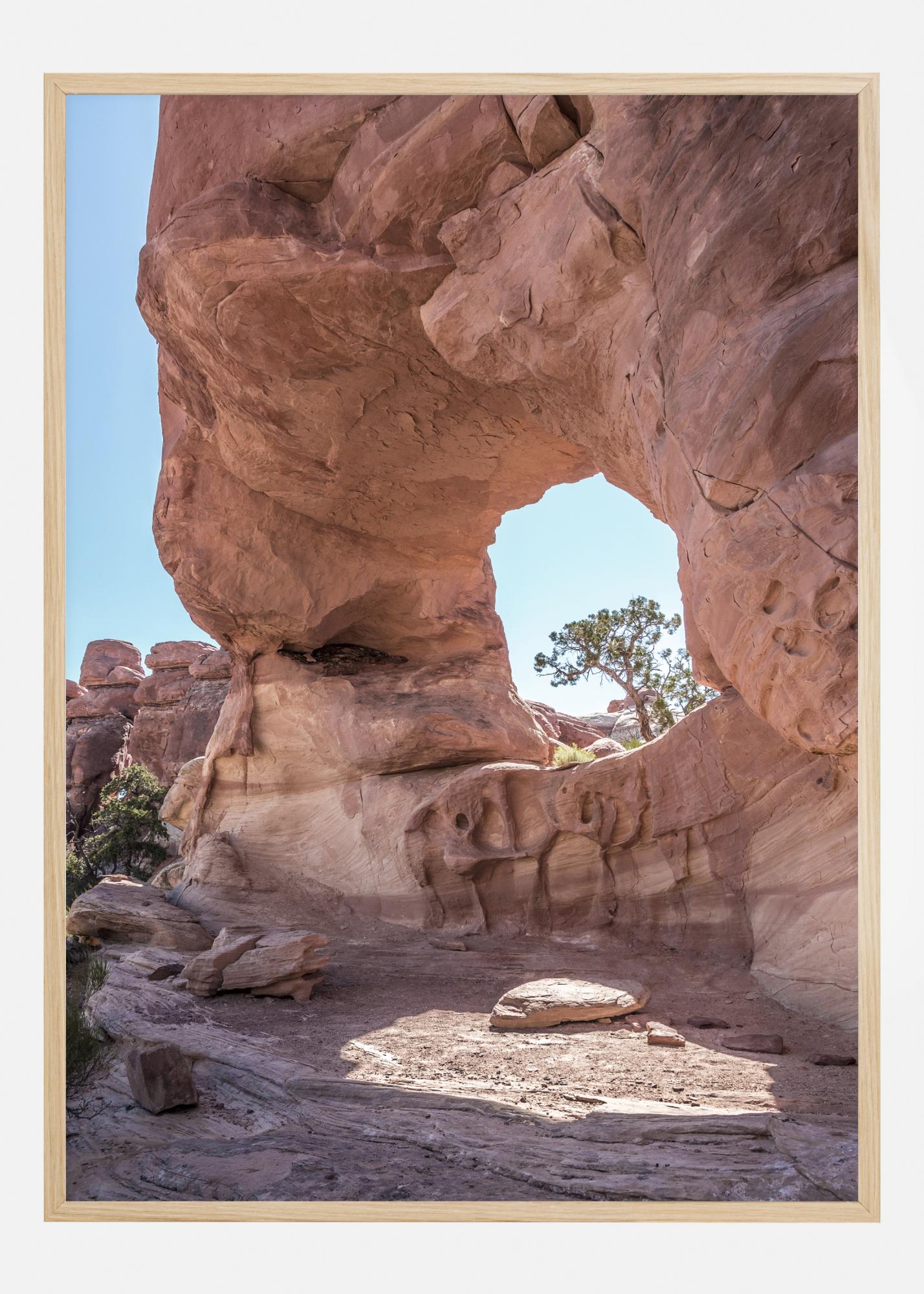Un fascinante póster de naturaleza de una piedra de color naranja con un agujero en el medio. Un pequeño árbol emerge al otro lado del agujero. El sol brilla a través del agujero en la roca y crea un área sombreada frente a la roca. Los hermosos colores fuertes son perfectos para iluminar una habitación aburrida.