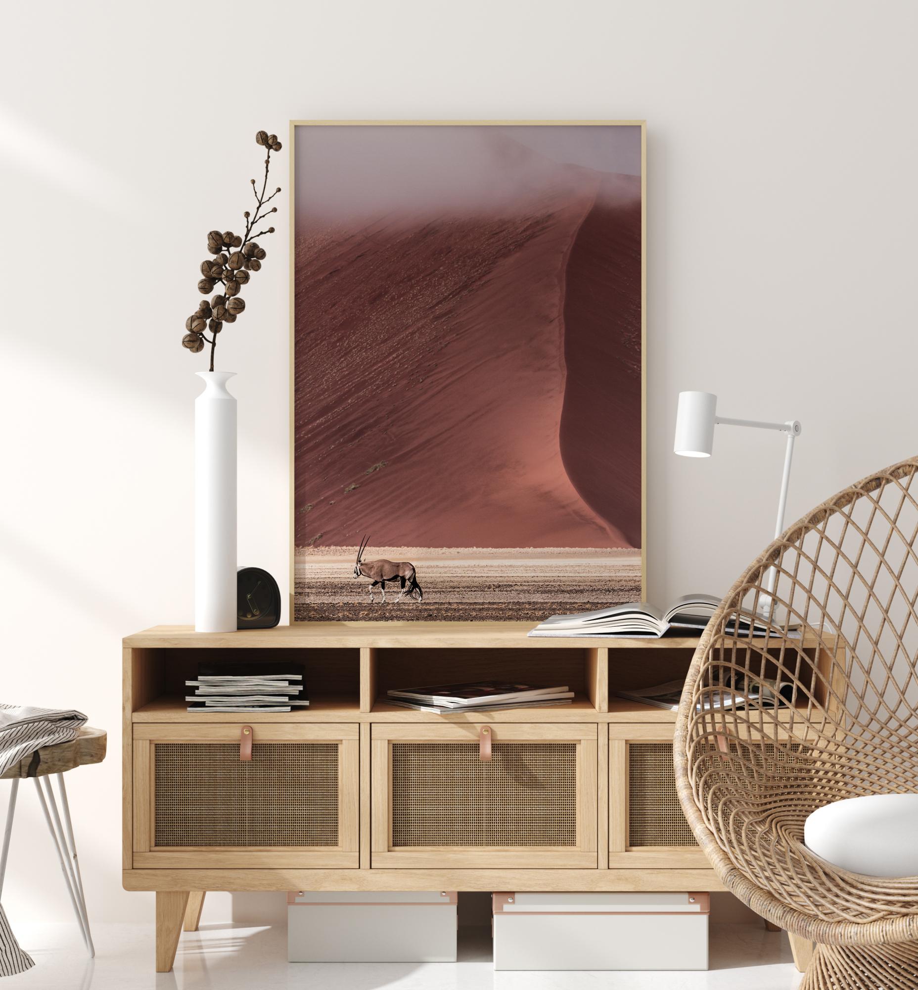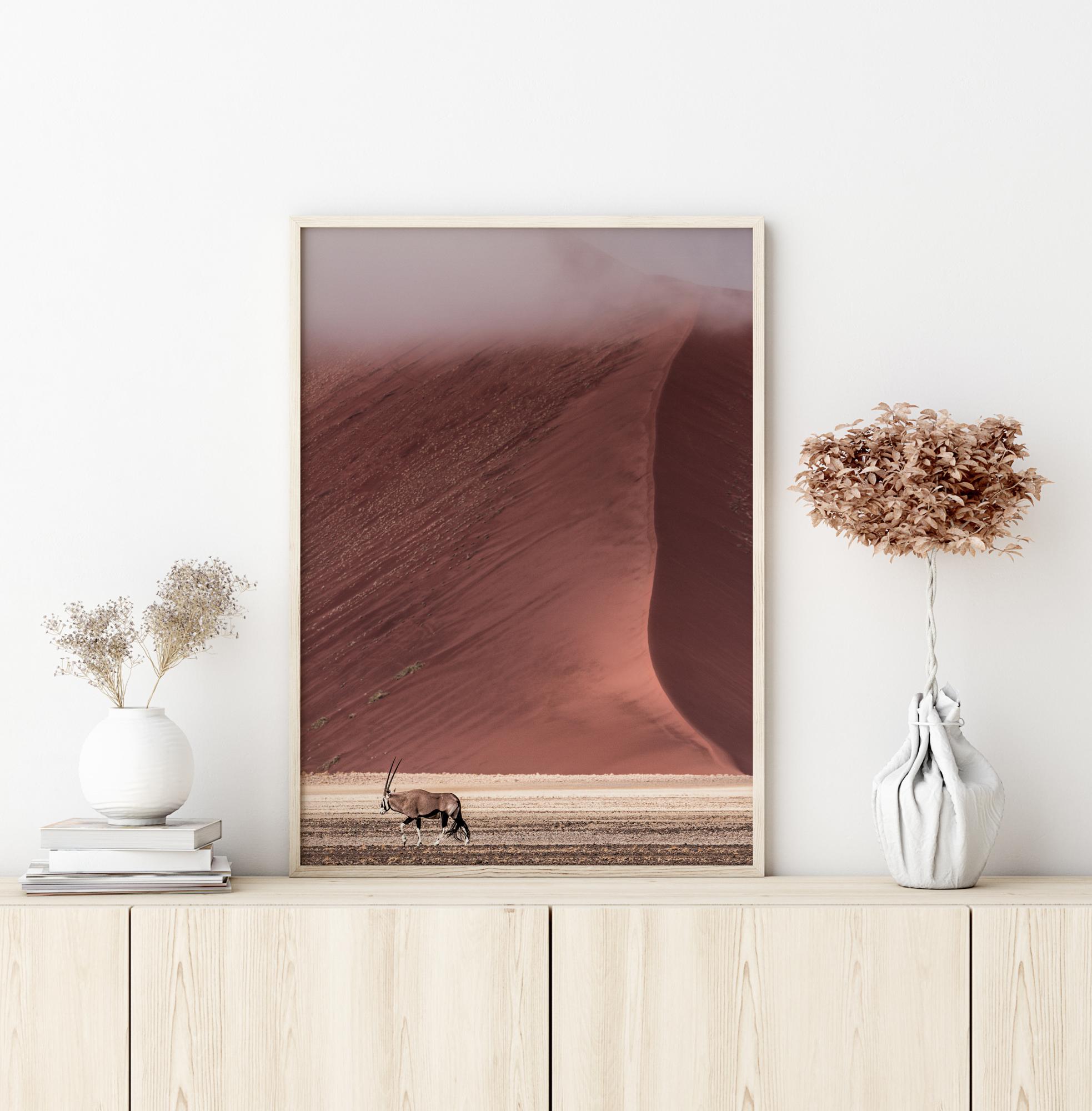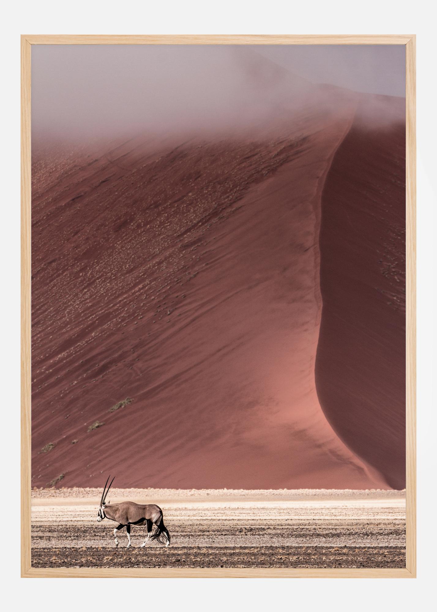 Un sencillo póster de una gacela cansada cruzando el desierto. En el fondo, una fascinante duna de arena roja se encuentra con el suelo arenoso en la parte inferior de la imagen. Los hermosos colores se desvanecen en la niebla del desierto. En un fondo crema, estos colores tranquilizadores crean una hermosa escena natural.