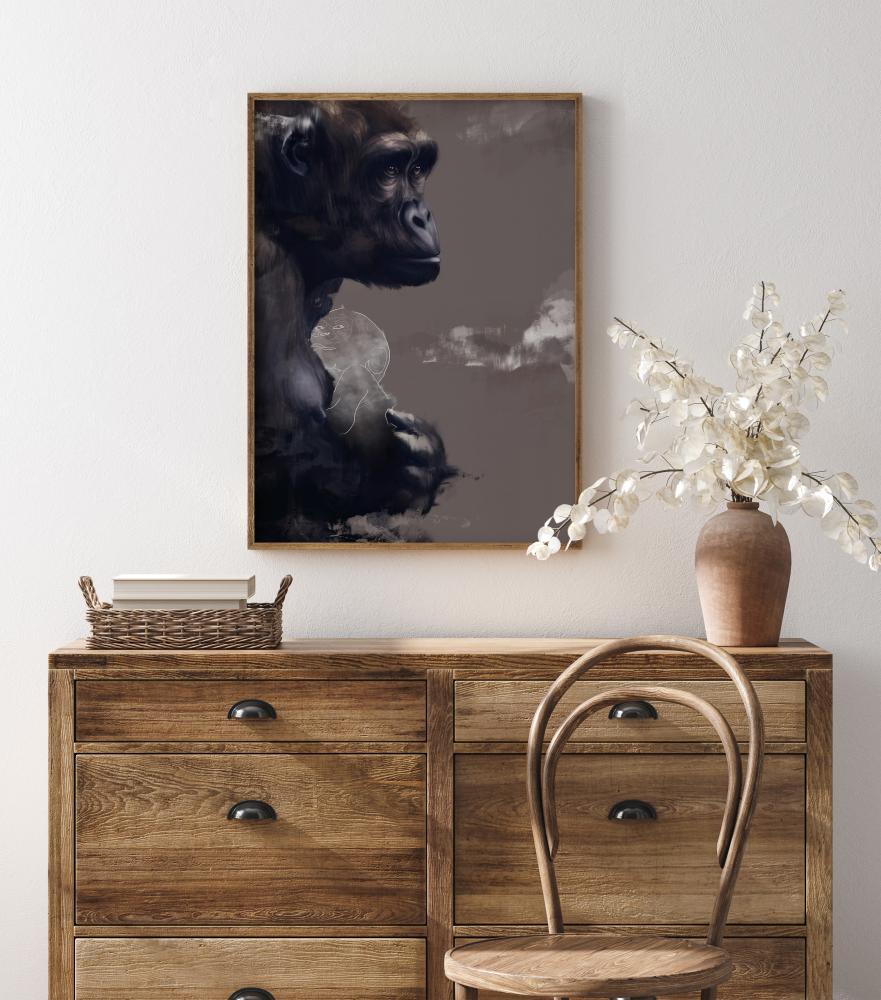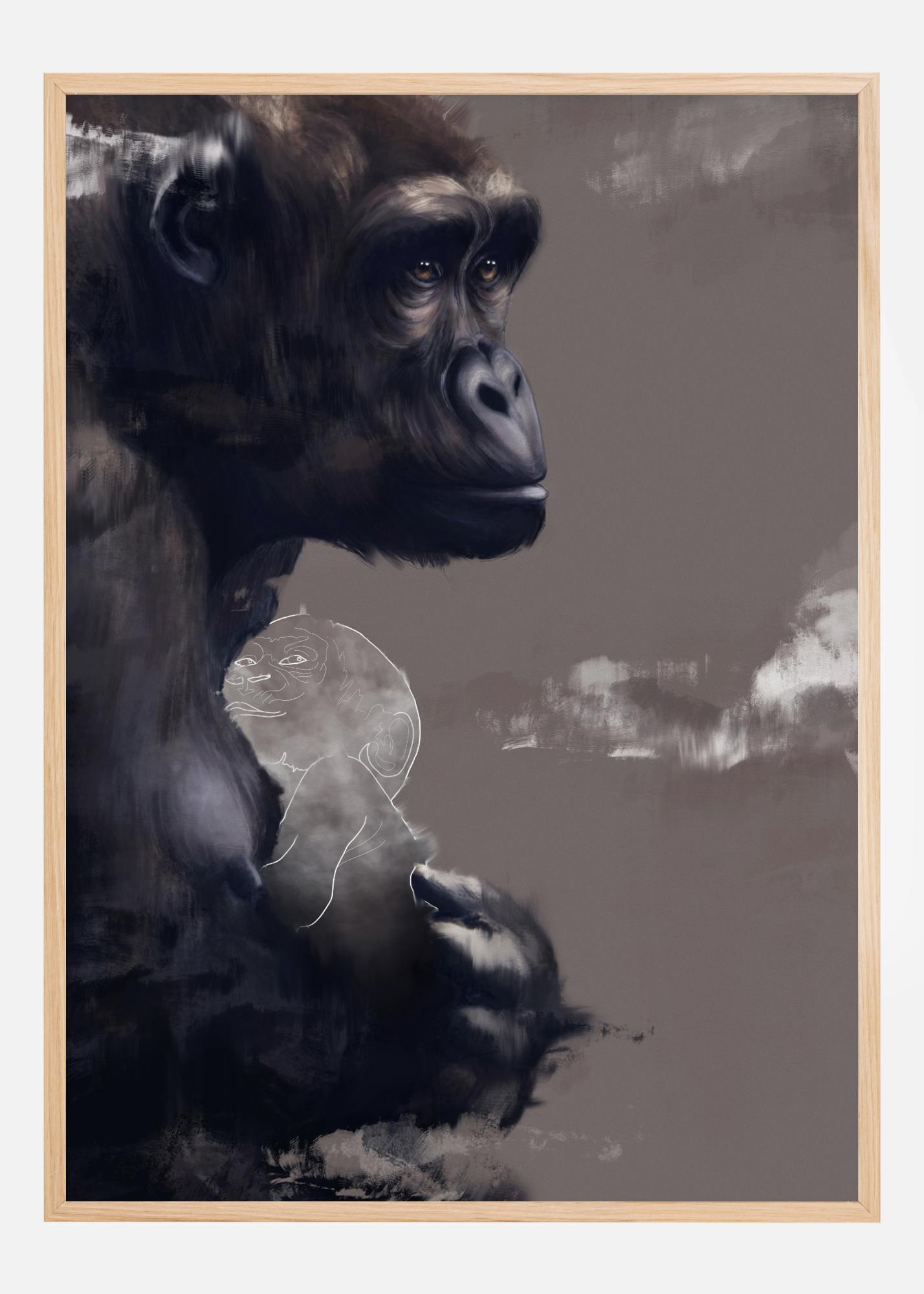 Un fascinante póster de naturaleza con un gorila sosteniendo a su recién nacido. Con un fondo marrón claro, este poderoso primate muestra un instinto maternal fuerte pero suave. Esta imagen de un gorila protegiendo al recién nacido en sus amorosos brazos es una impresión perfecta para todos los amantes de los animales.