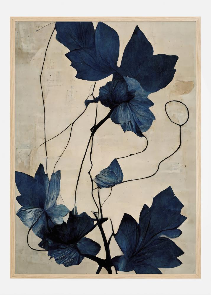 Este póster captura una fascinante belleza botánica con su representación detallada y realista de flores en un profundo color azul índigo. Las hojas y los matices intensos y oscuros de las flores contrastan con un fondo semejante a un papel envejecido, lo que proporciona una sensación antigua y atemporal. Esta impresión es un homenaje a la ilustración botánica clásica y ofrece una impresión elegante y sofisticada en cualquier habitación donde se coloque.