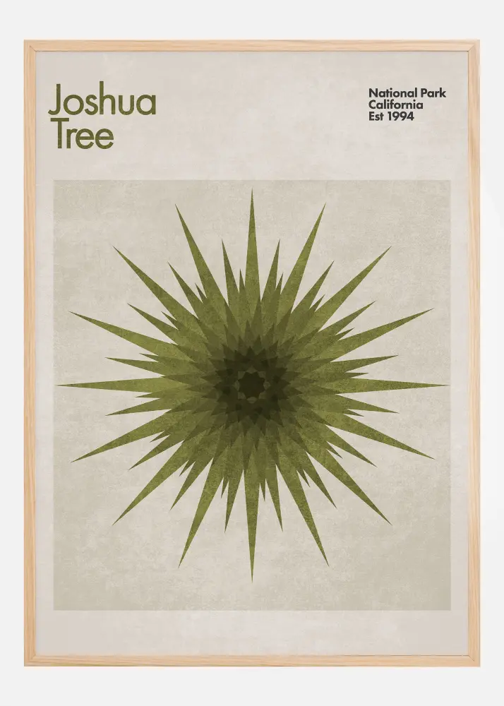 Este cartel atmosférico representa una interpretación abstracta del icónico Árbol de Josué, centrado y destacado en el medio de la imagen. El color verde profundo del motivo evoca la naturaleza calmante y el robusto paisaje desértico que alberga el árbol. La abstracción del árbol, con sus puntas extendidas, crea un patrón casi hipnótico que es tanto contemporáneo como atemporal.