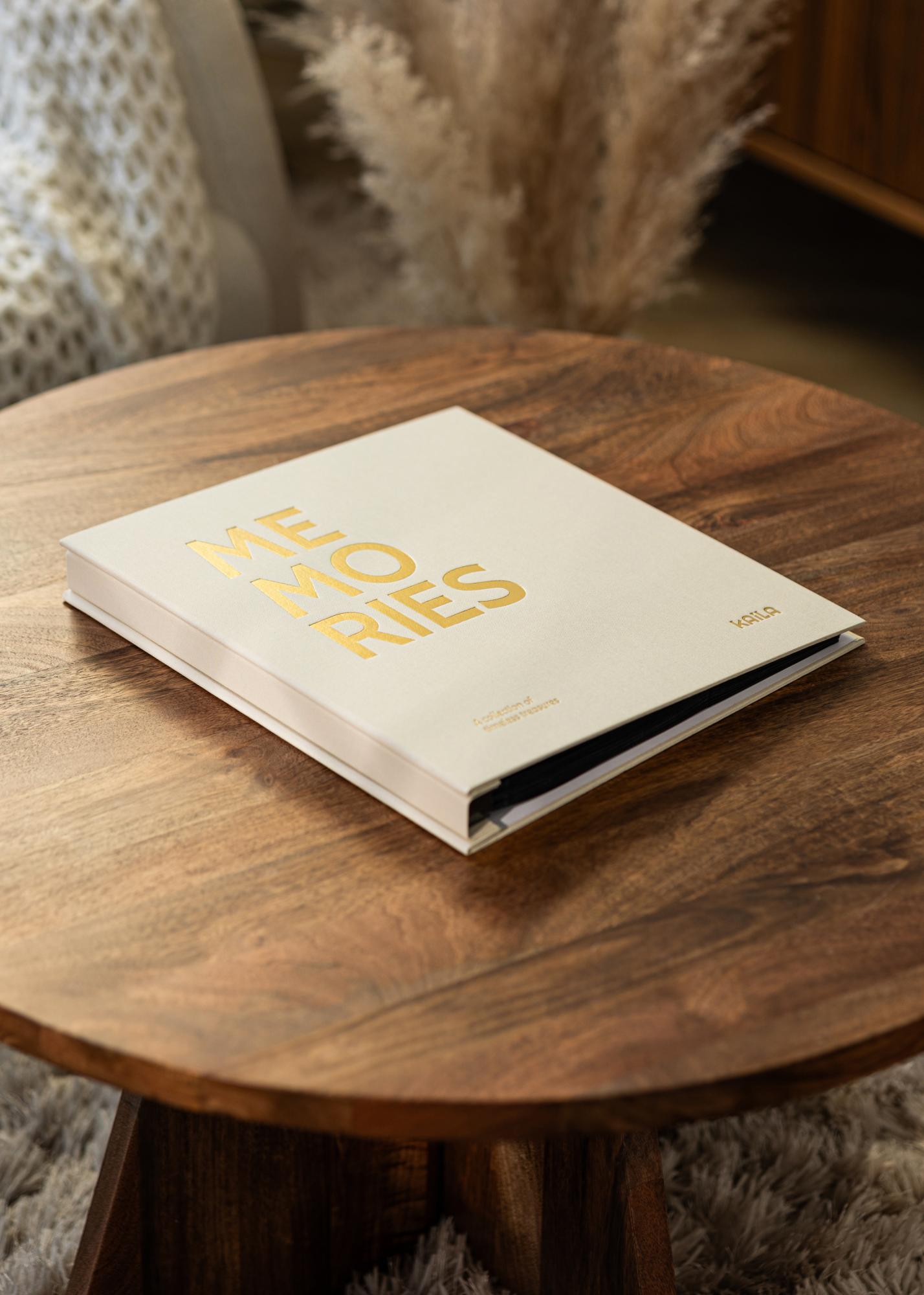 Este es un álbum de fotos elegante con un diseño atemporal y prácticos bolsillos para fotos, perfecto para aquellos que deseen preservar sus mejores recuerdos fotográficos de una manera elegante y sencilla. El álbum está cubierto con una tela beige y en la parte delantera se encuentra la palabra "MEMORIES" impresa en color dorado. Para darle un toque especial, el álbum también cuenta con la frase "Una colección de tesoros atemporales" escrita en una esquina. Las cubiertas de tela, junto con el color dorado del texto, convierten este álbum de fotos en un lujoso detalle decorativo que querrás tener a la vista.