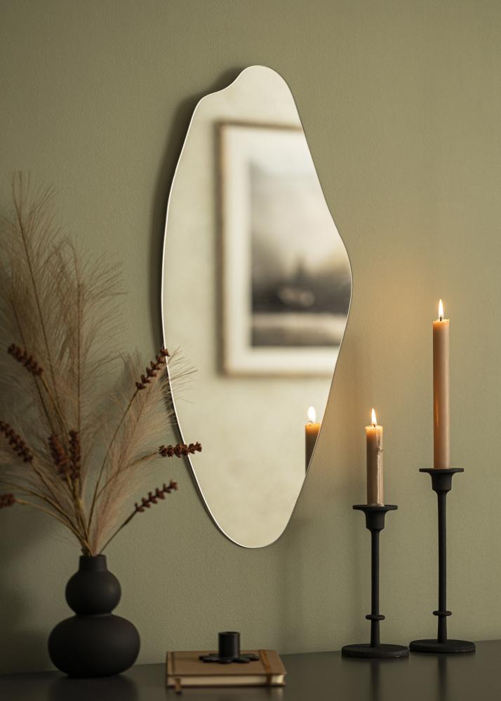 Este es un espejo alargado con una hermosa forma asimétrica, lo que lo convierte en un emocionante detalle de decoración que se adapta perfectamente a la casa moderna. El espejo tiene prácticos soportes de pared en la parte trasera y se cuelga en la pared de la habitación que desees, ¡incluso es adecuado para su uso en el baño!