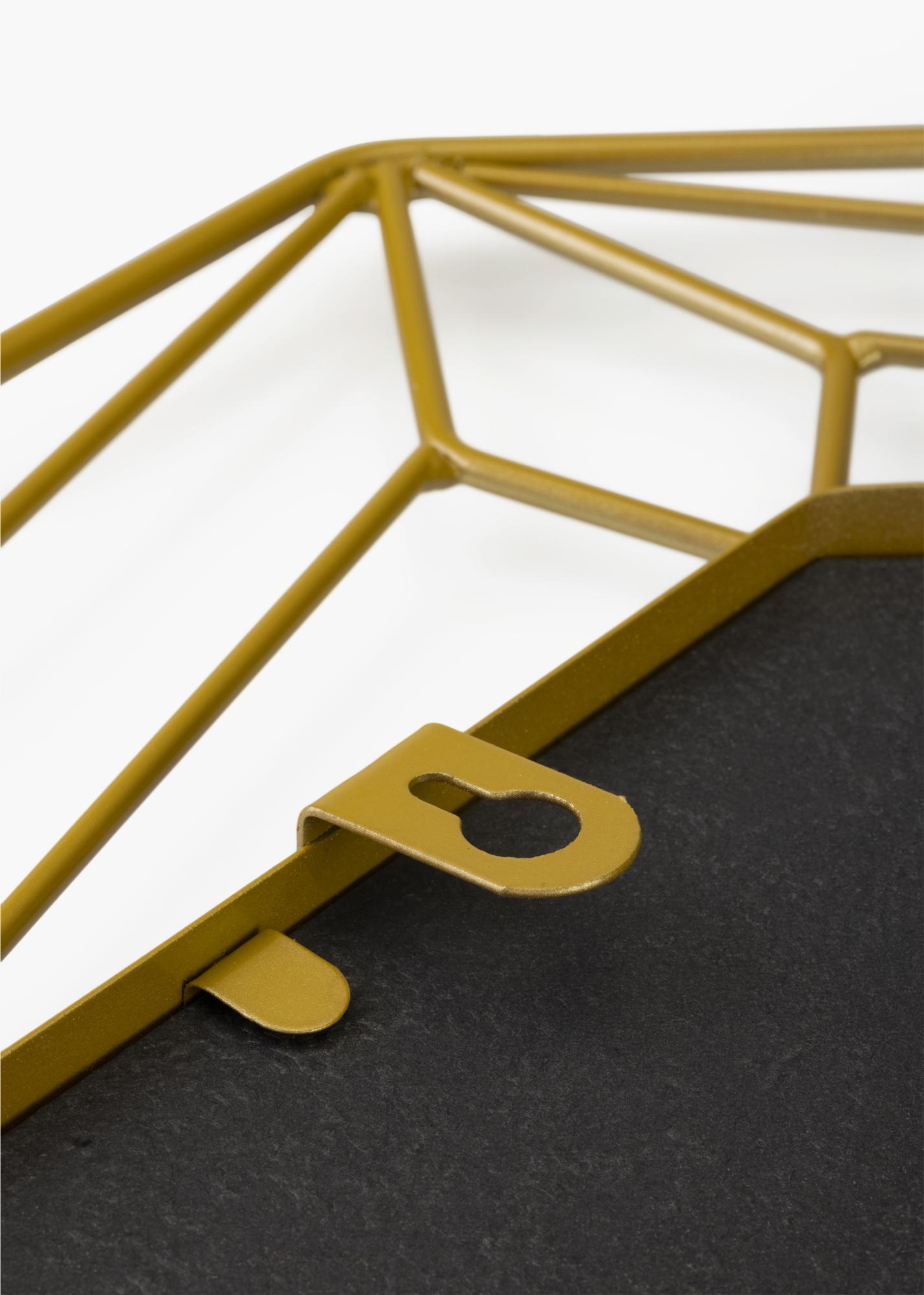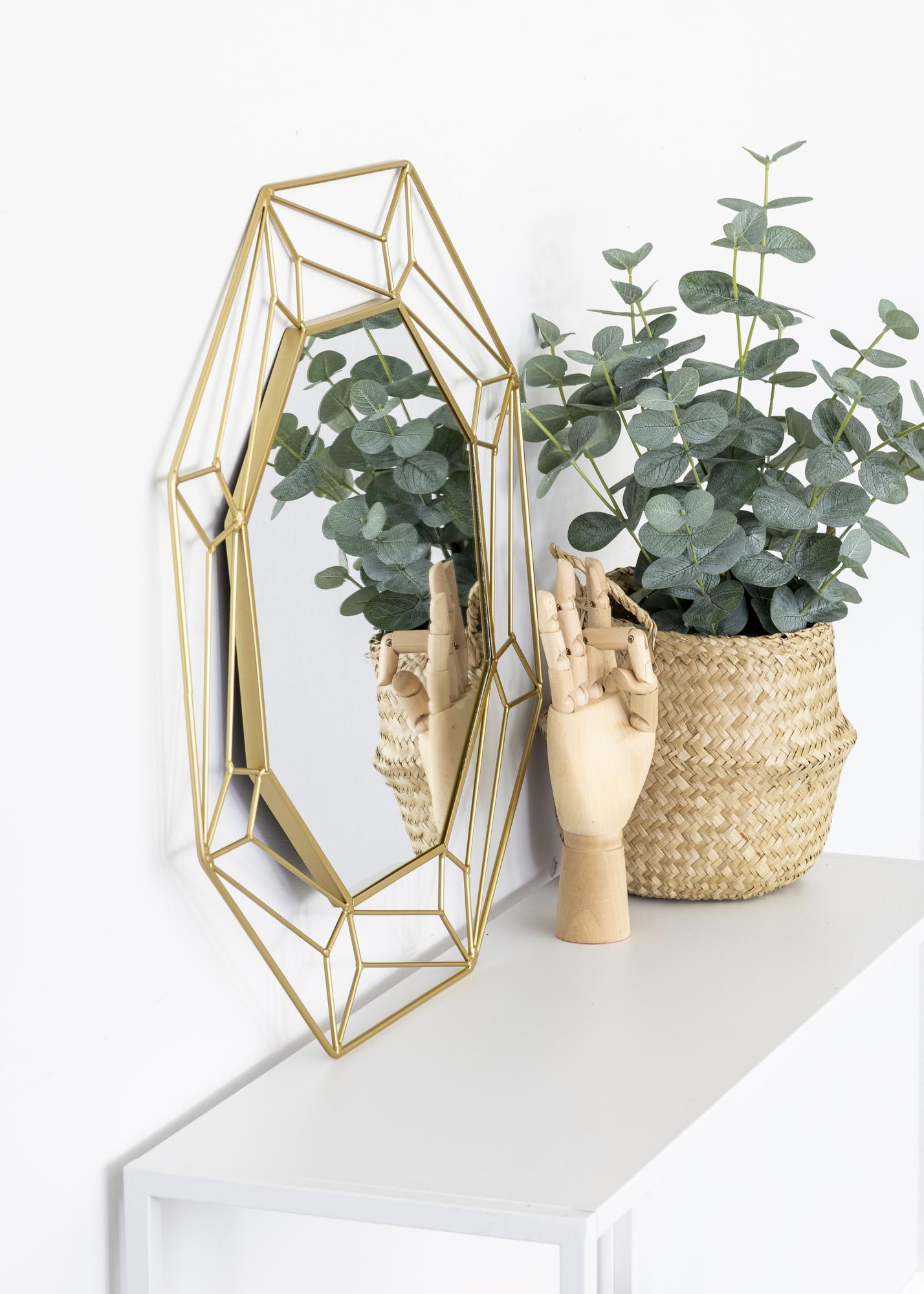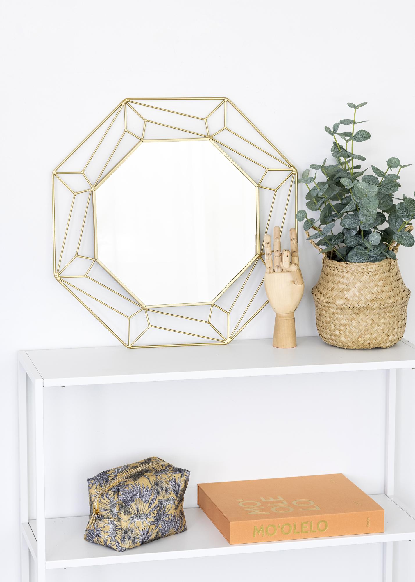 ¡Este es un espejo con un elegante diseño abstracto de KAILA! Alrededor de la superficie del espejo en forma de hexágono en el centro, hay un borde hecho de metal en color latón que forma un diseño elegante. El tono dorado le da a este espejo un toque lujoso y es perfecto para aquellos que deseasn tener un hogar elegante y con estilo. El espejo mide 50x50 cm y está hecho de metal. En la parte trasera del espejo hay soportes de pared.