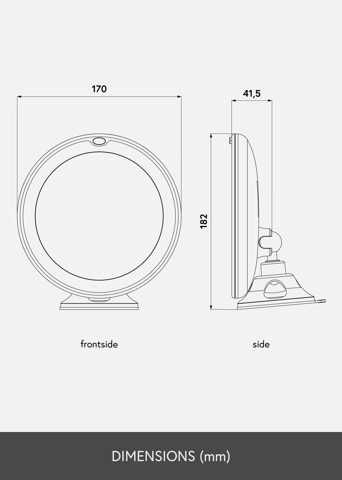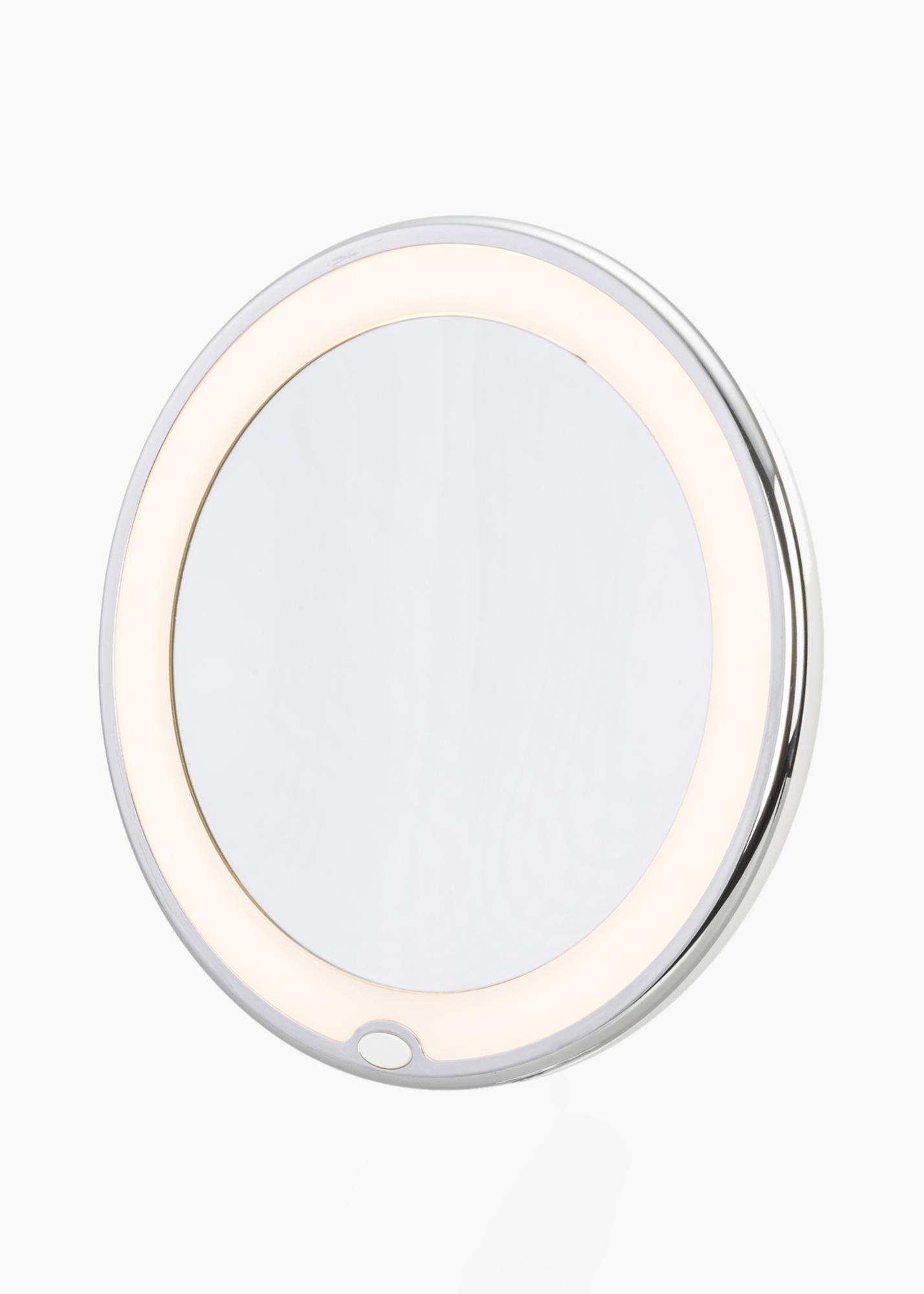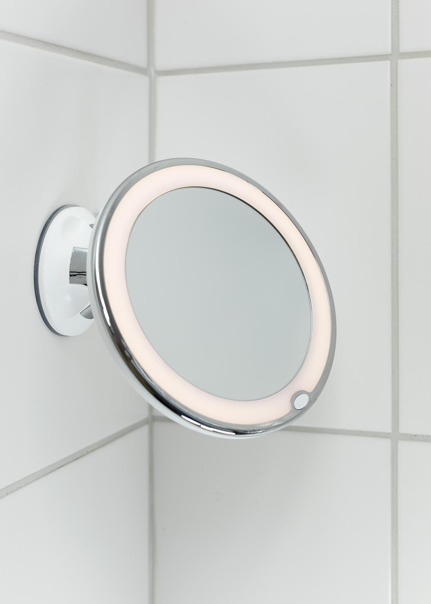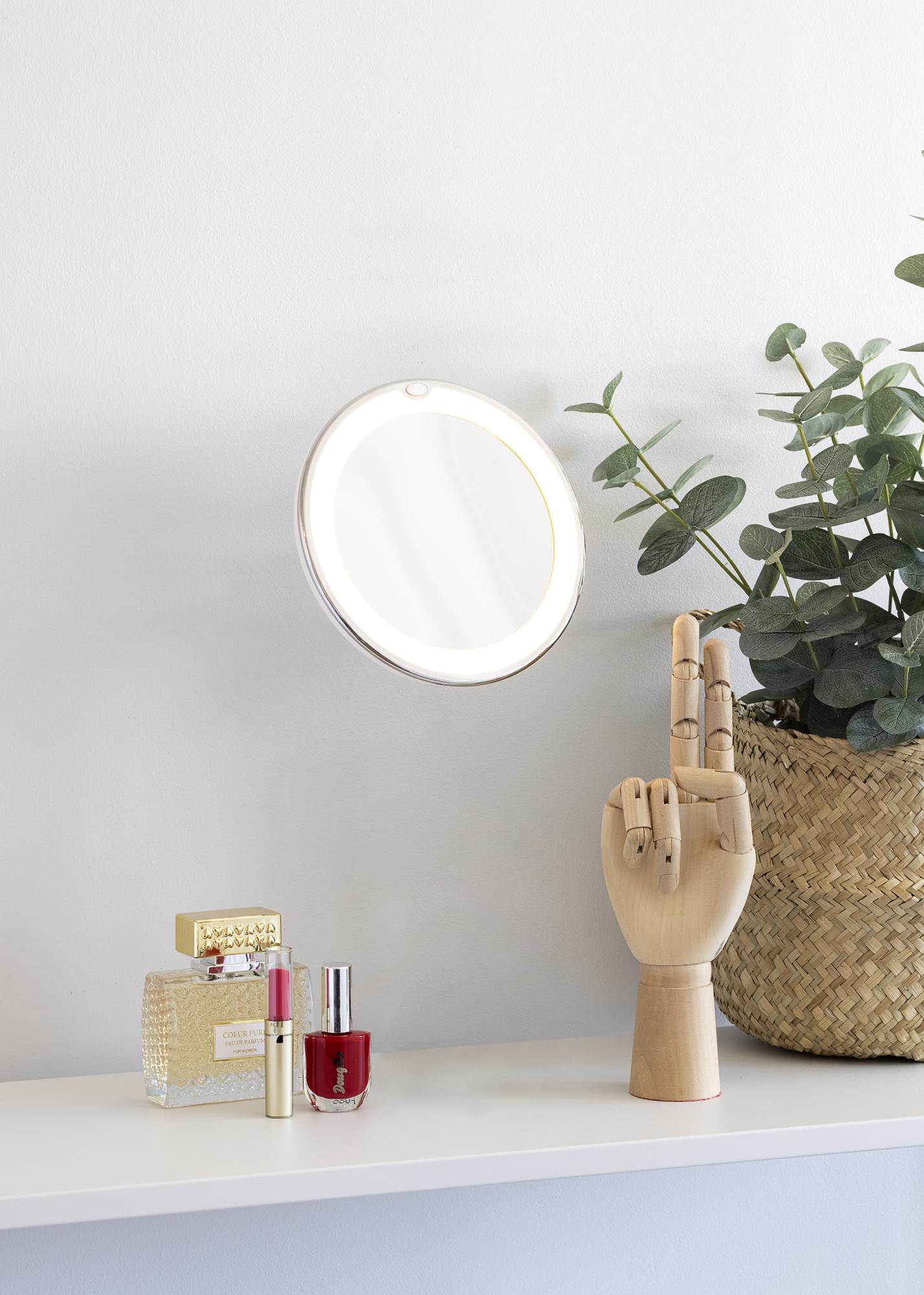 Este es un espejo de baño clásico de KAILA con un diseño elegante. El elegante espejo tiene iluminación LED integrada que enmarca el vidrio del espejo. El espejo de baño tiene un diámetro de 17 cm y tiene un vidrio de aumento con aumento de 5x. En otras palabras, ¡este espejo es excelente para ver una imagen nítida de tu rostro de cerca! El espejo queda bien como detalle de decoración, pero su diseño compacto también permite guardarlo fácilmente cuando no se utiliza. El espejo se fija a la pared, azulejos o mesa con la ventosa incluida. La ventosa es bloqueable y asegura que el espejo se mantenga estable. Se entrega sin montar.