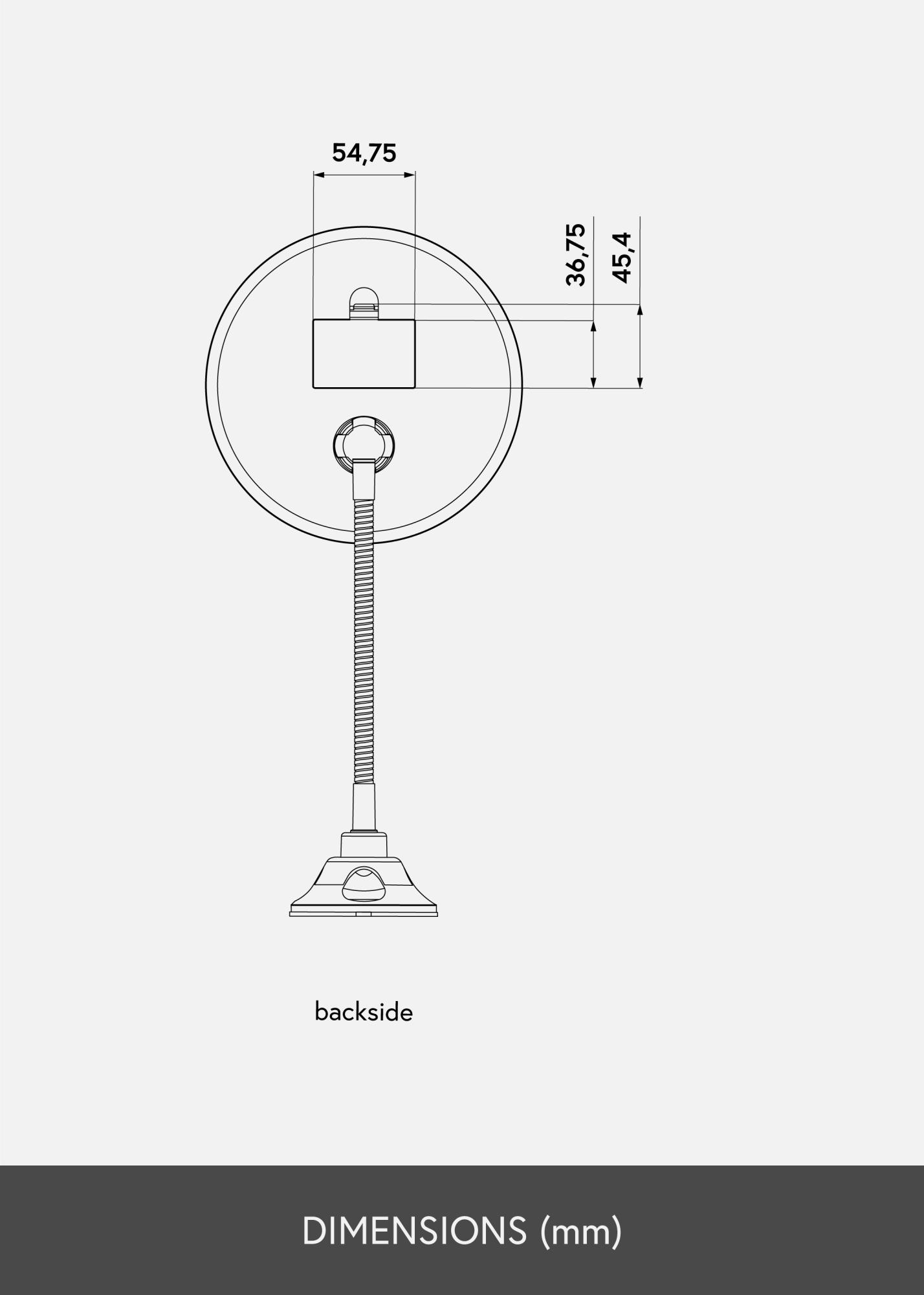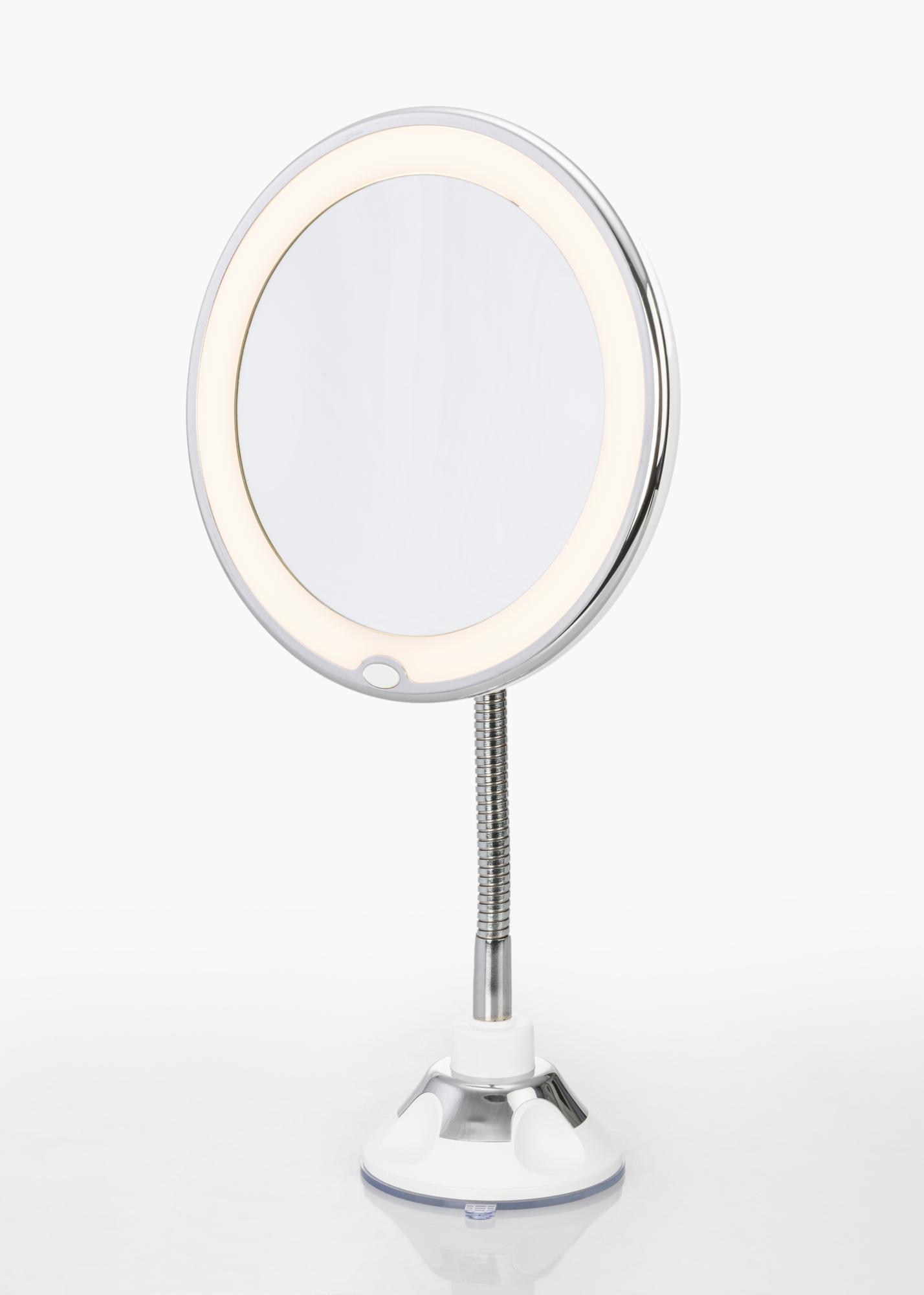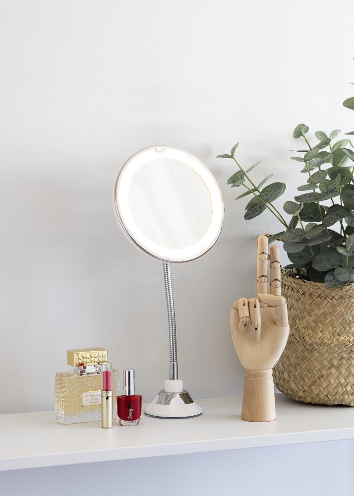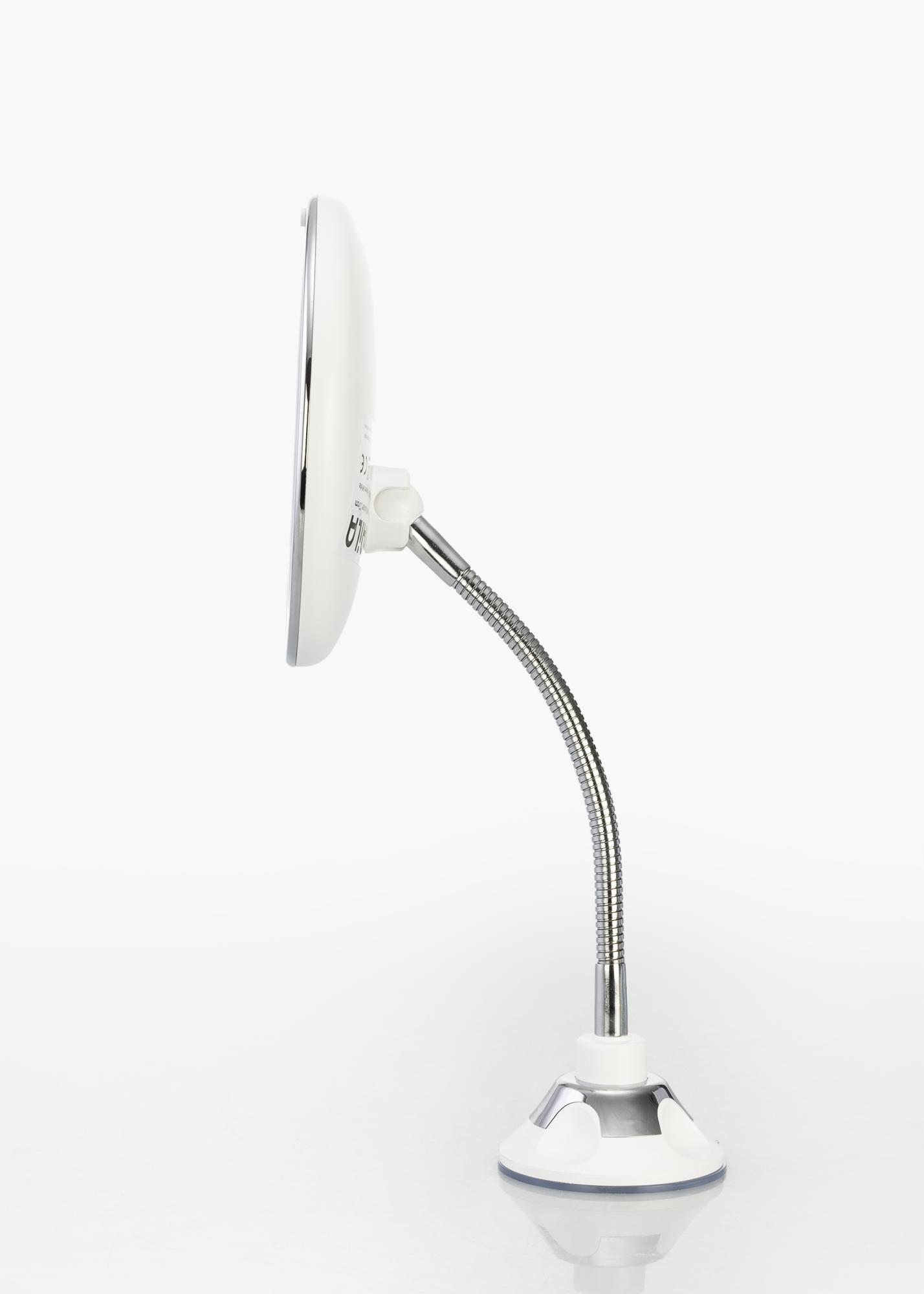 El soporte del espejo es ajustable, lo que significa que puedes inclinar el espejo en el ángulo que desees. El espejo está aprobado para baños. Se fija a la pared, azulejos o mesa con la ventosa incluida. La ventosa es bloqueable y asegura que el espejo se mantenga estable. Se entrega desmontado.