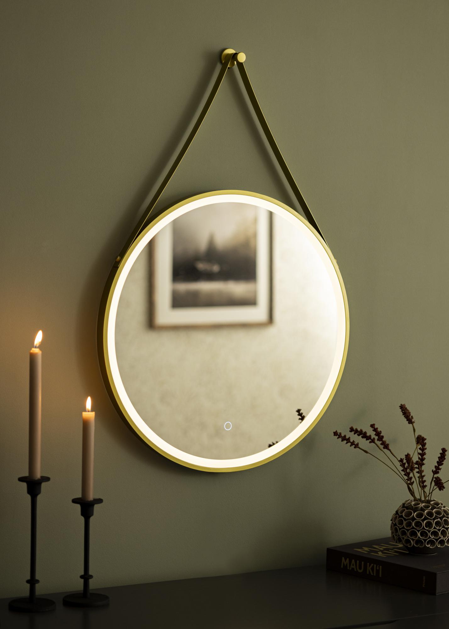 Este es el espejo de baño para aquellos que deseasn tener un espejo único que añada un toque de lujo a su baño. Tiene un diseño moderno con forma redonda, marco dorado y colgador de pared dorado. Para que el espejo cuelgue de manera estable, se monta en soportes de pared en la parte trasera y en el colgador de pared superior. El espejo está diseñado para una instalación fija y se conecta a un interruptor de luz. Para que el espejo funcione correctamente, debe conectarse a un interruptor de luz normal, no a un interruptor de luz regulable.