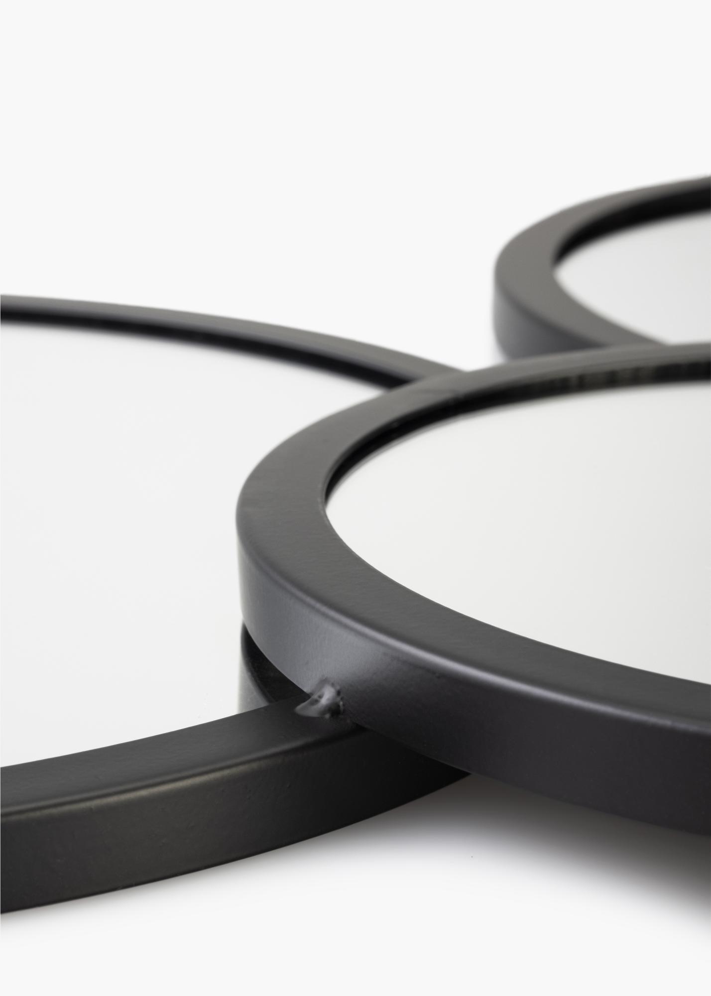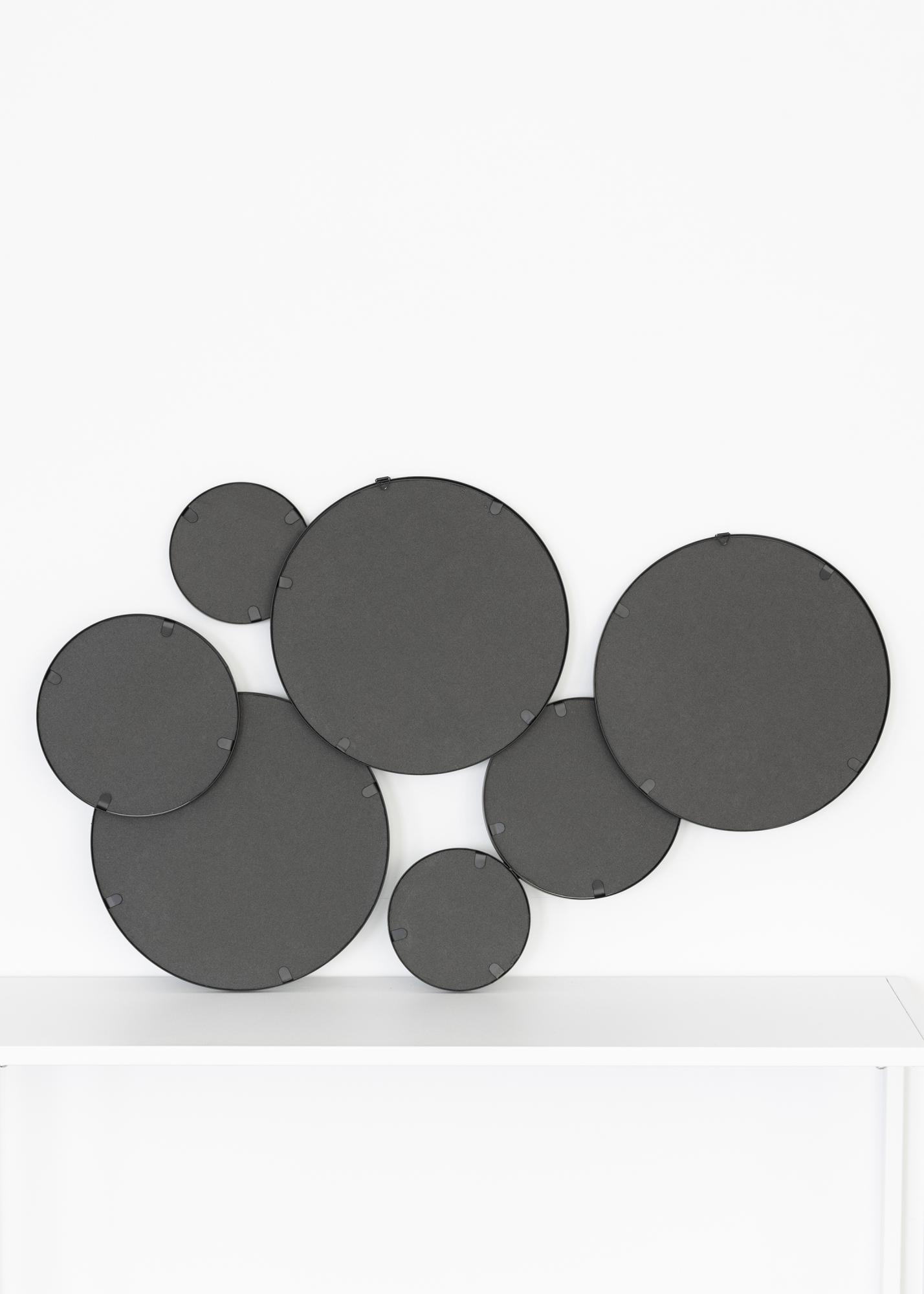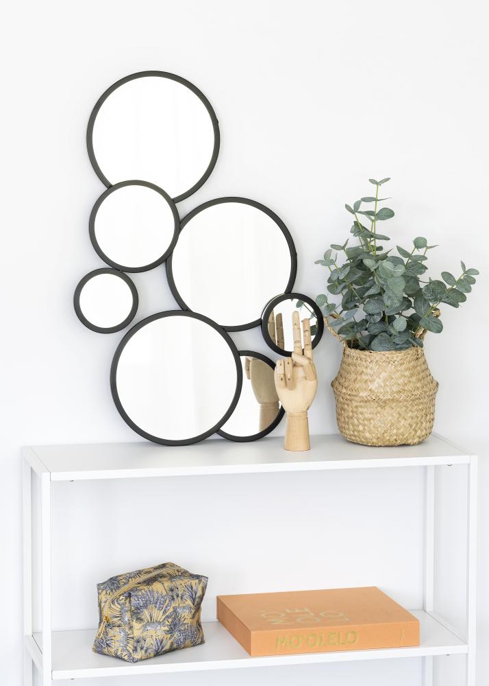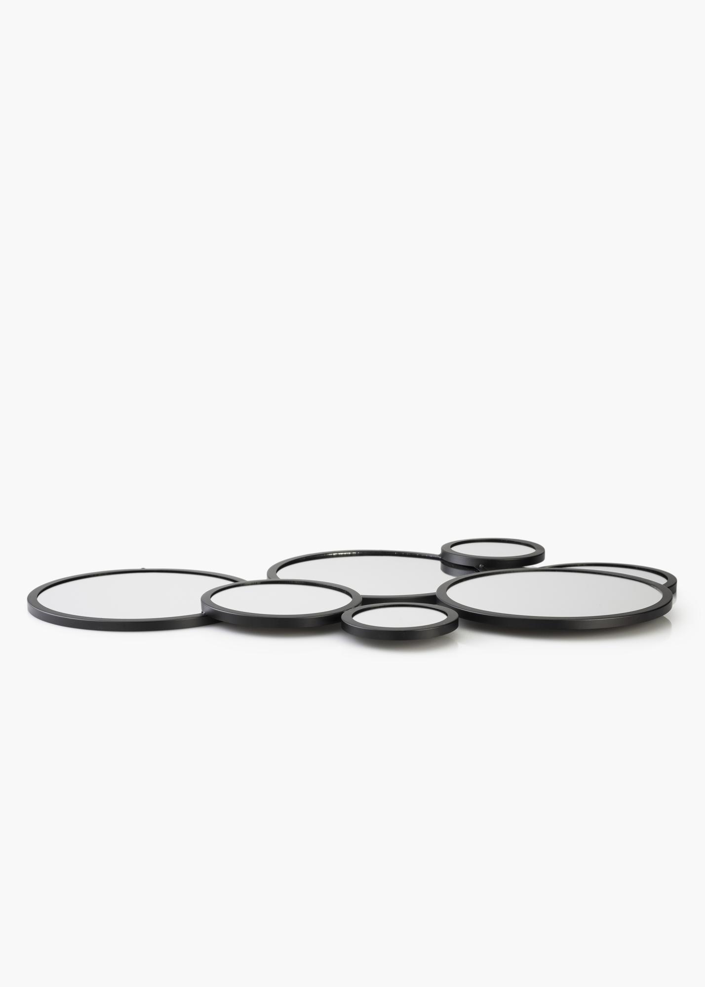 Bubbles es un hermoso espejo con un diseño único compuesto por varios espejos circulares más pequeños unidos. El espejo mide 72x43 cm y tiene un elegante tono negro. Viene con soportes de pared para colgarlo horizontalmente, pero el espejo también se puede inclinar contra la pared en vertical. El espejo está hecho de metal.
