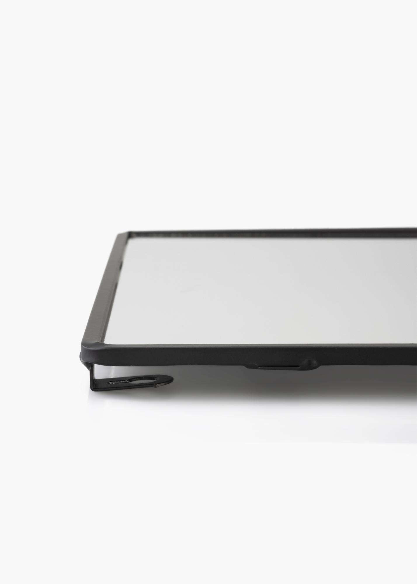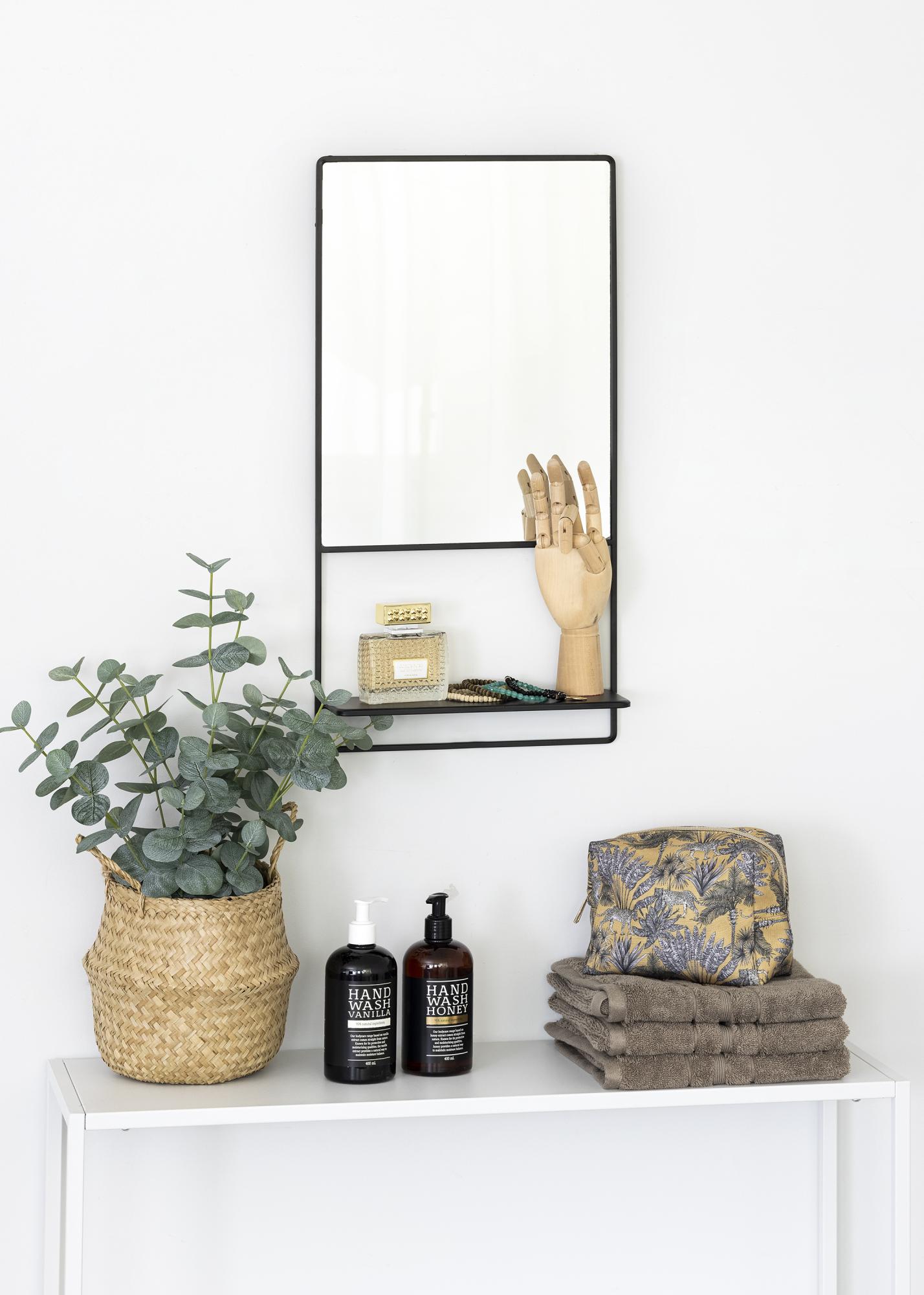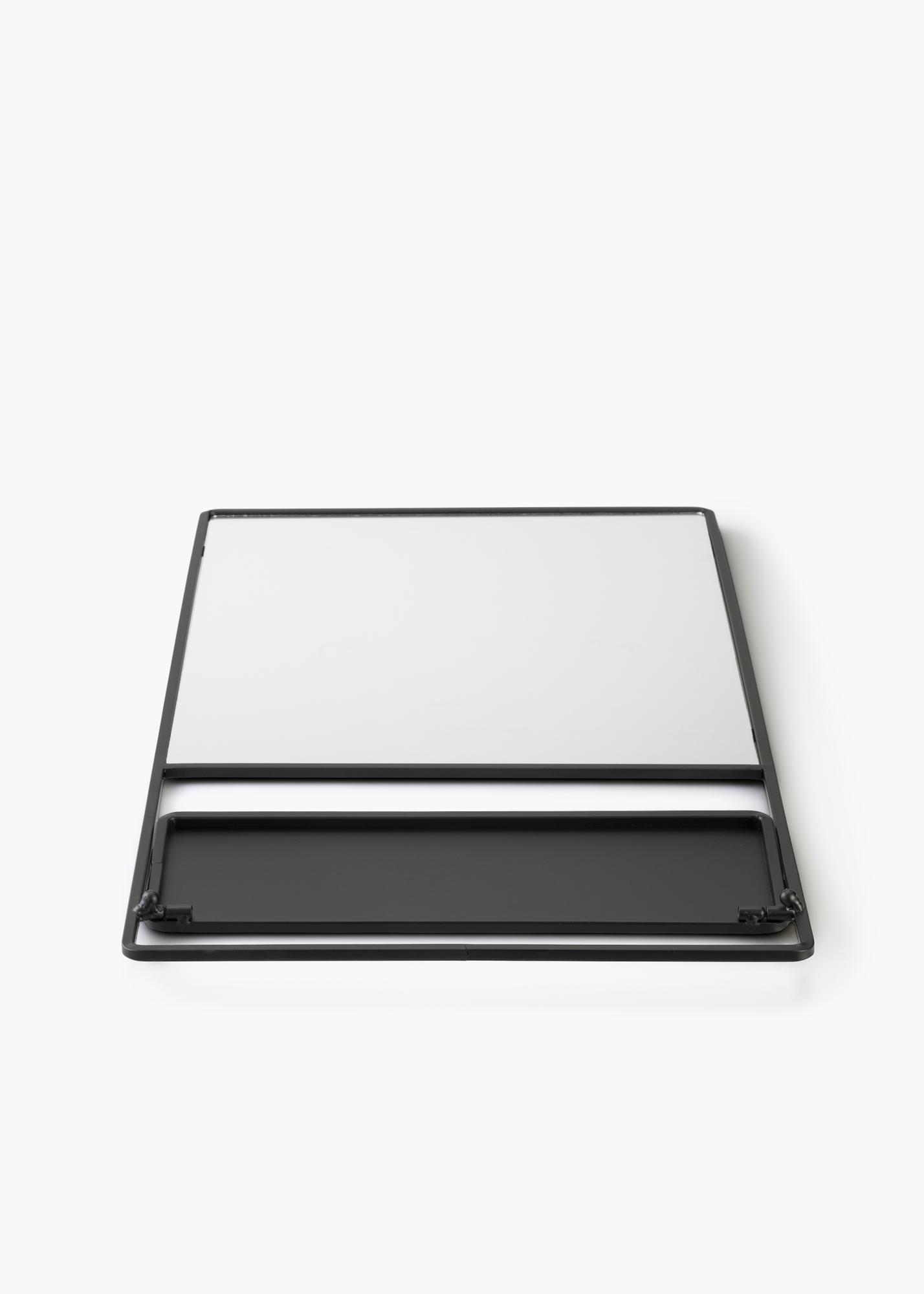 Este elegante espejo de pared con estante es un diseño sueco de KAILA. El espejo tiene un tono negro y está hecho de metal. La superficie del espejo tiene forma rectangular y está enmarcada por un borde de metal negro. En la parte inferior hay un estante, ¡perfecto para colocar decoraciones bonitas o guardar un poco para tocador! El espejo mide 31x60 cm y tiene soporte para colgar en la pared.