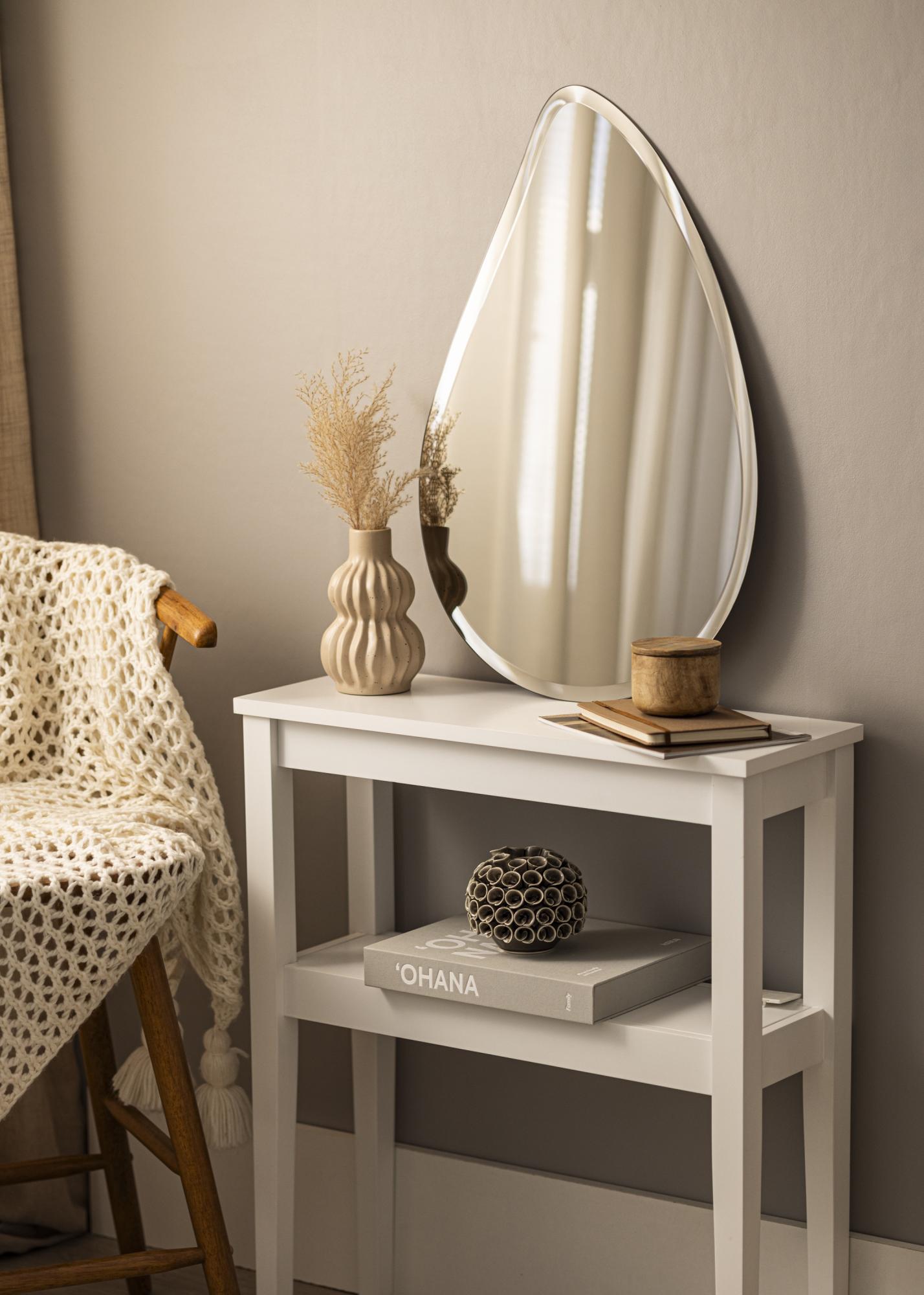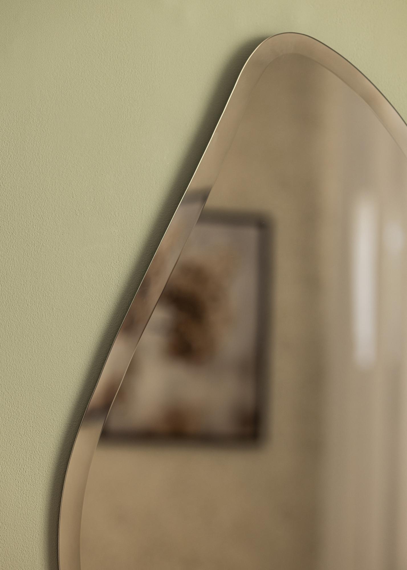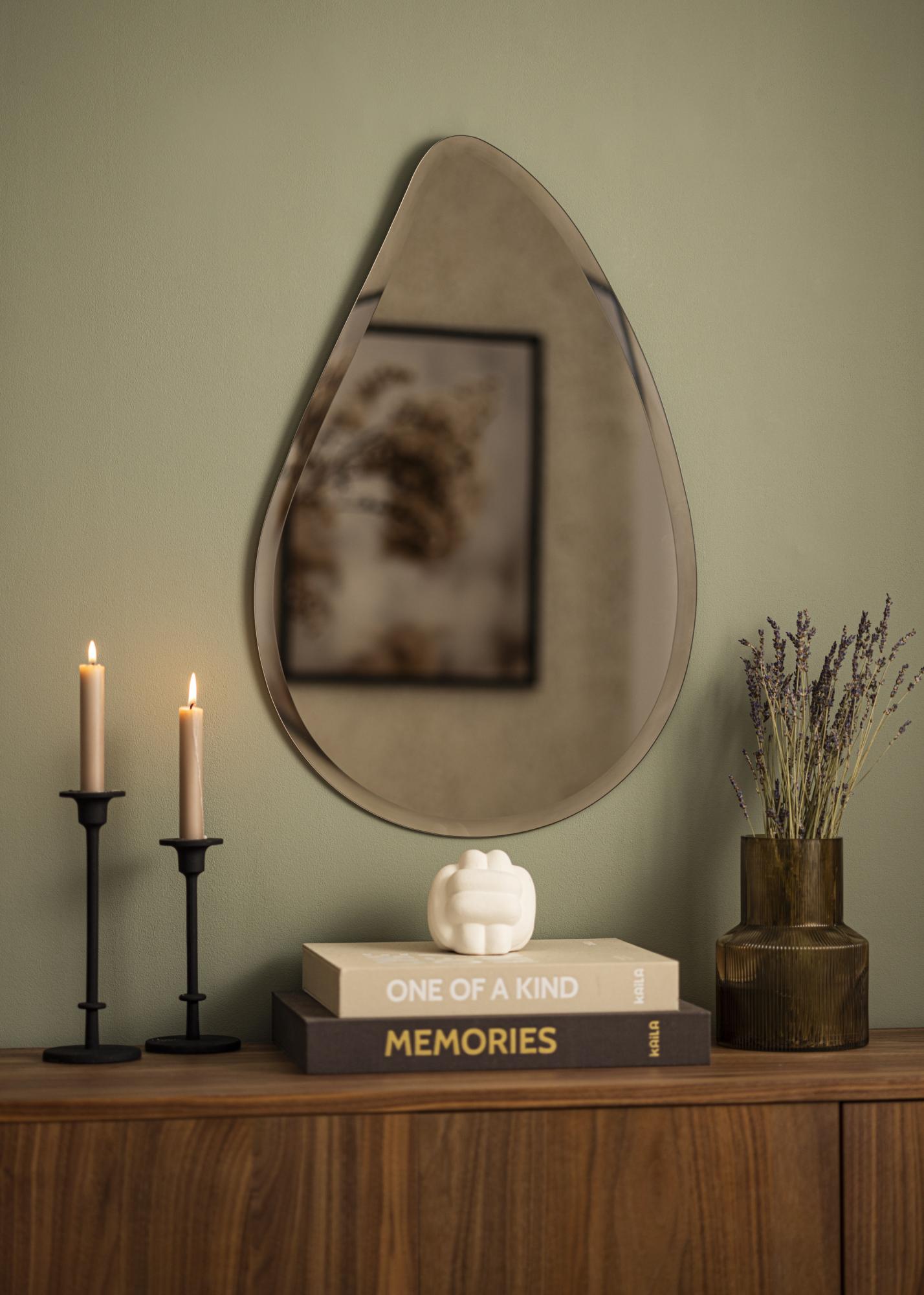 Este es un espejo con forma de gota moderno con un vidrio de espejo aún más moderno, coloreado en un elegante tono de bronce oscuro. El vidrio de espejo coloreado tiene un gran efecto y el hermoso color bronce es fácil de combinar con muchos esquemas de colores diferentes en la decoración. El espejo es muy fino y no tiene marco, lo que, en combinación con el borde lujosamente facetado, refuerza aún más la apariencia elegante y moderna. Es un espejo de pared decorativo que seguramente atraerá miradas independientemente de en qué habitación se Coloca, ya sea en la sala de estar, el recibidor o el dormitorio.