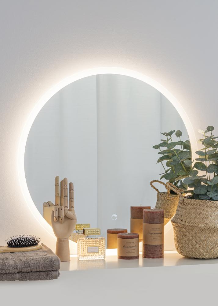 LED es una bombilla de bajo consumo que proporciona una luz uniforme y natural, lo que hace que este espejo sea perfecto como espejo de baño y como espejo para tocador, ¡o incluso como espejo de entrada! El elegante espejo tiene un diámetro de 60 cm y solo tiene 3 cm de grosor.
