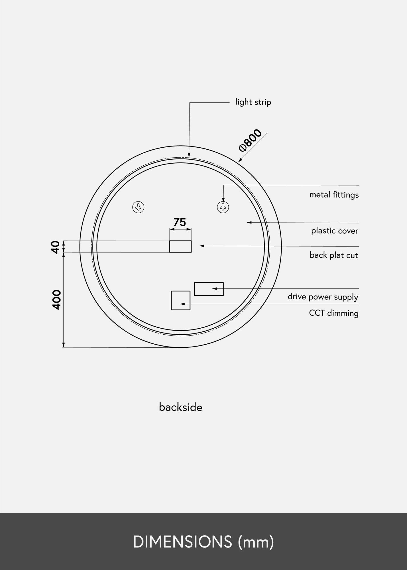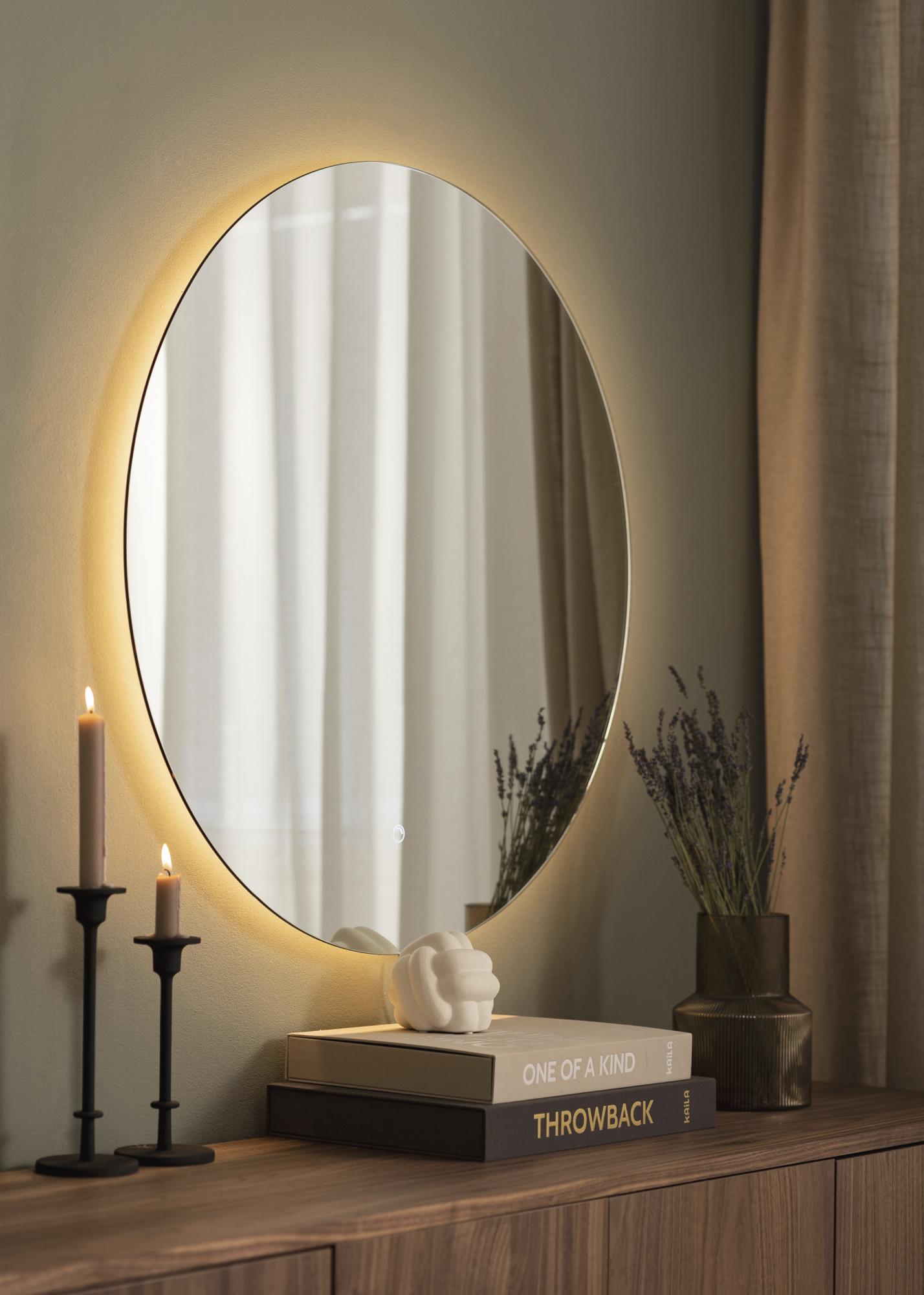 El espejo está aprobado para baños, pero su diseño atemporal y elegante también se ve bien en otras paredes de la casa. El espejo tiene un diámetro de 80 cm, solo tiene 3 cm de profundidad y cuenta con soportes de pared. El espejo está diseñado para instalación fija y se conecta a un interruptor de luz. Para que el espejo funcione correctamente, debe estar conectado a un interruptor de luz normal, no a un regulador de luz.