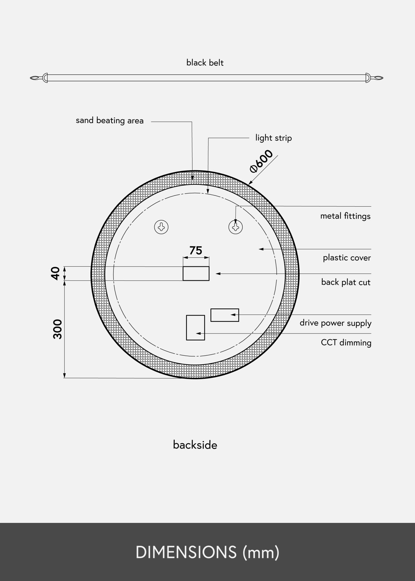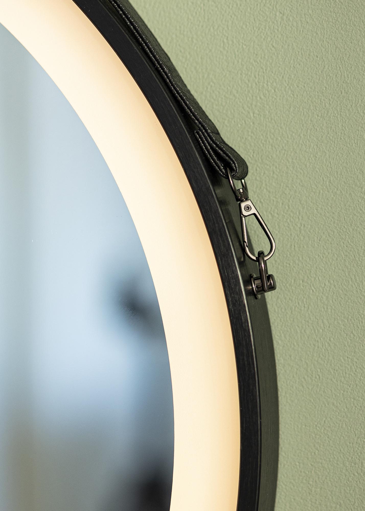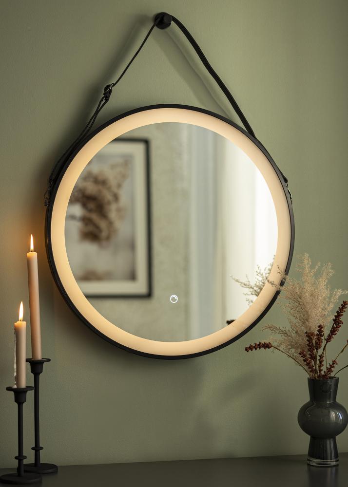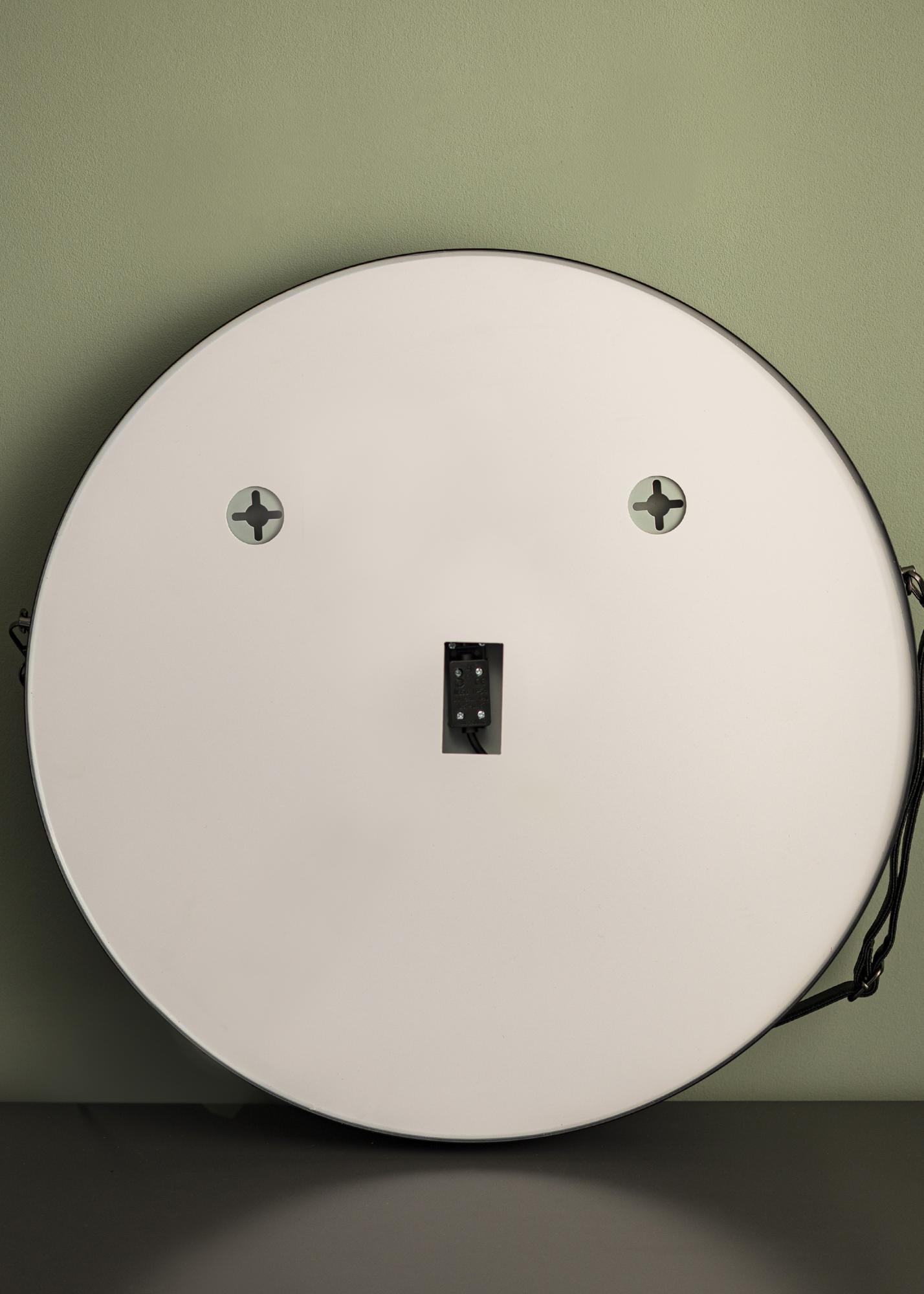 Este espejo de baño tiene un diseño industrial con su tono negro y su moderno diseño redondo. El espejo tiene un diámetro de 60 cm y viene con una correa de cuero en color marrón oscuro para colgarlo. Alrededor del cristal del espejo hay una iluminación LED integrada que proporciona una luz blanca cálida a 3000K. La iluminación es regulable y puedes ajustar fácilmente la intensidad manteniendo presionado el botón táctil en la pantalla durante unos segundos. El espejo recordará la última configuración de luz la próxima vez que lo enciendas. ¡Esto te permite siempre reflejarte en una buena luz! El espejo está aprobado para baños pero también se convierte en un elegante detalle decorativo en las paredes del resto de la casa. El espejo está diseñado para una instalación fija y se conecta a un interruptor de luz. Para que el espejo funcione correctamente, debe estar conectado a un interruptor de luz normal, no a un regulador de luz.