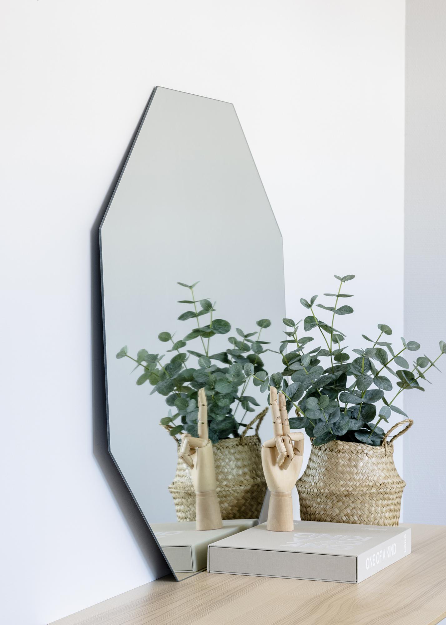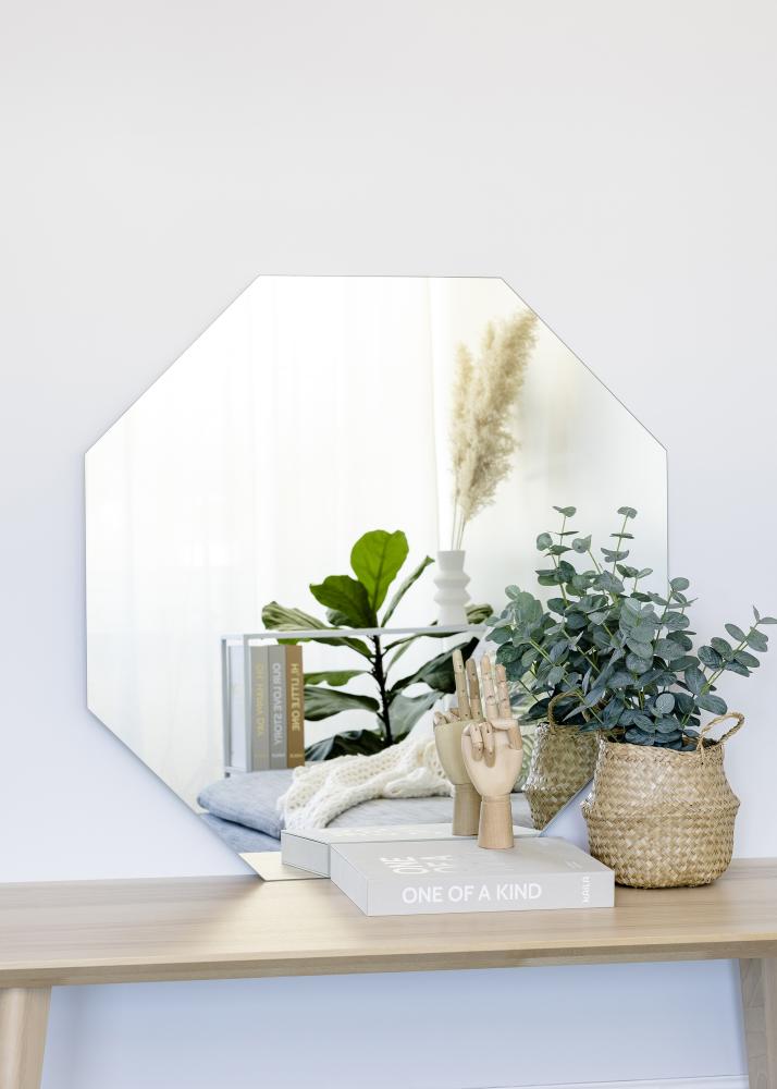 Este elegante espejo de KAILA es perfecto para la sala de estar, el recibidor o el dormitorio. Su forma octogonal sin marco ofrece un equilibrio perfecto entre minimalismo y glamour. Al decorar con diferentes formas y materiales, puedes crear dinamismo en el hogar, y este espejo angular ofrece un bonito contraste con otros muebles y detalles de decoración. El espejo viene con soporte de pared y es fácil de colgar.