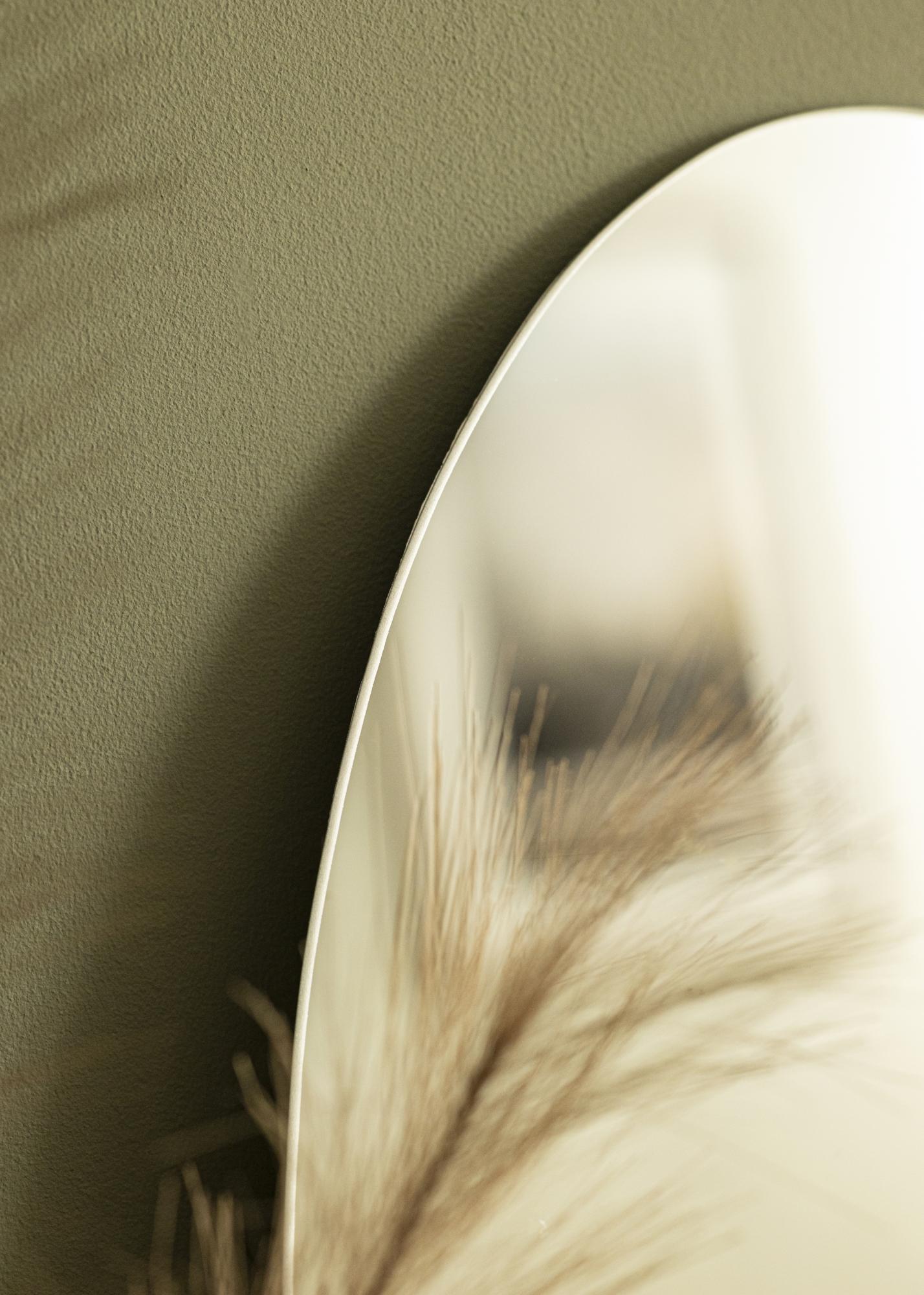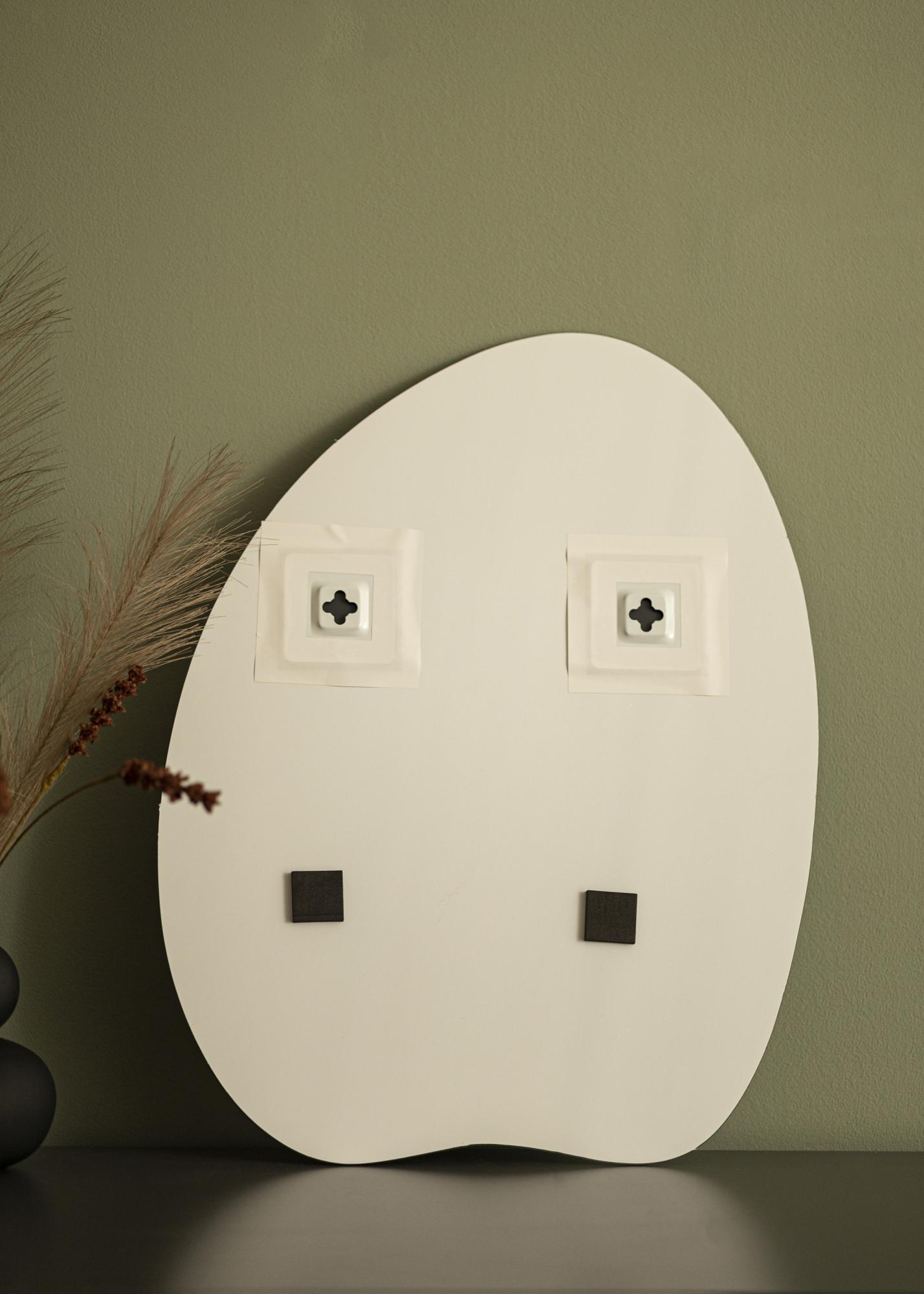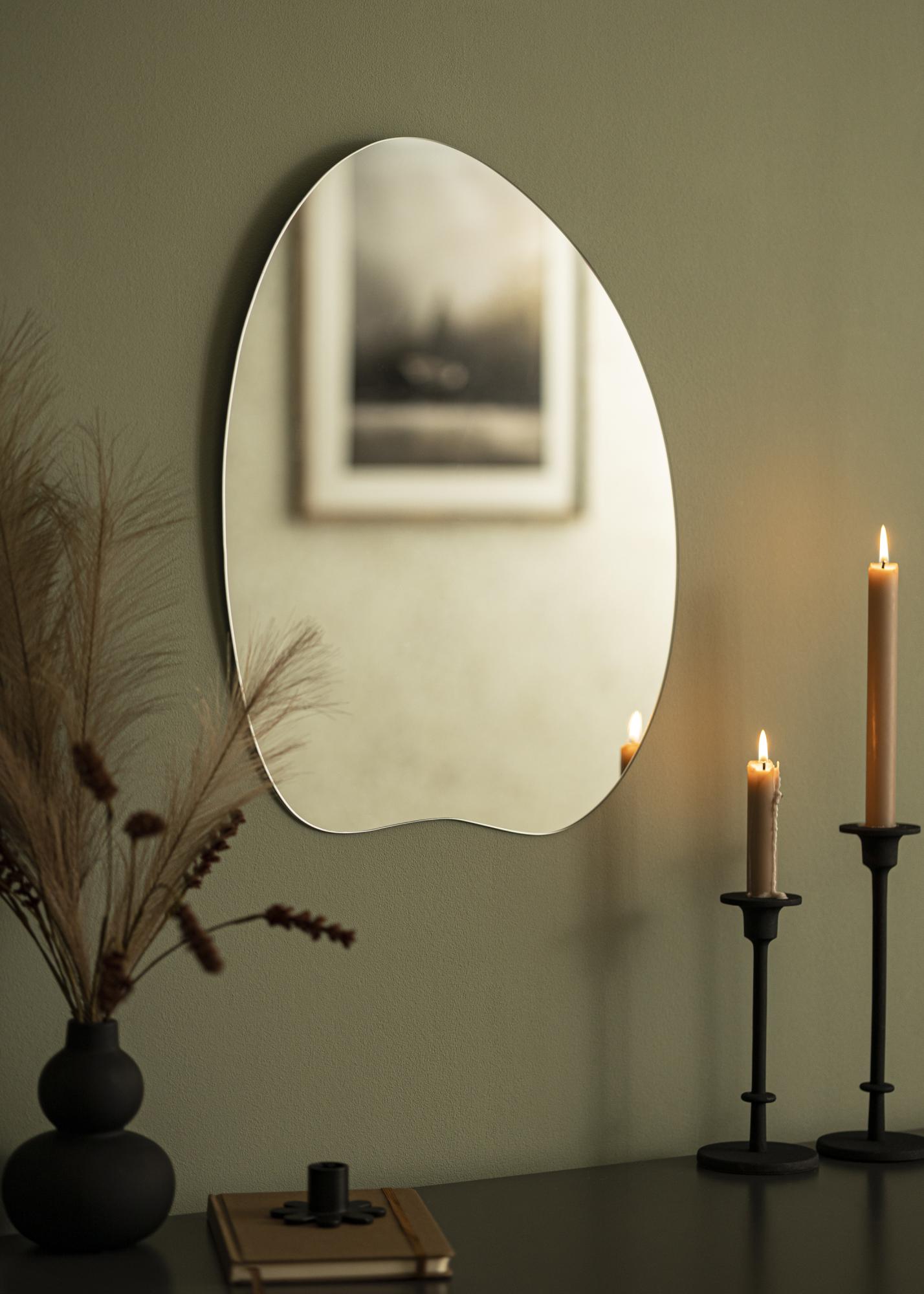 Si estás buscando un espejo de pared en una forma emocionante, este es el espejo para ti. El diseño único, con una forma redondeada y un borde inferior ligeramente ondulado, combina perfectamente con el fino vidrio del espejo de 4 mm. El espejo no tiene marco, lo que le da un aspecto minimalista. Gracias a los inteligentes soportes de pared en la parte trasera, puedes colgar fácilmente el espejo en la pared en posición vertical.