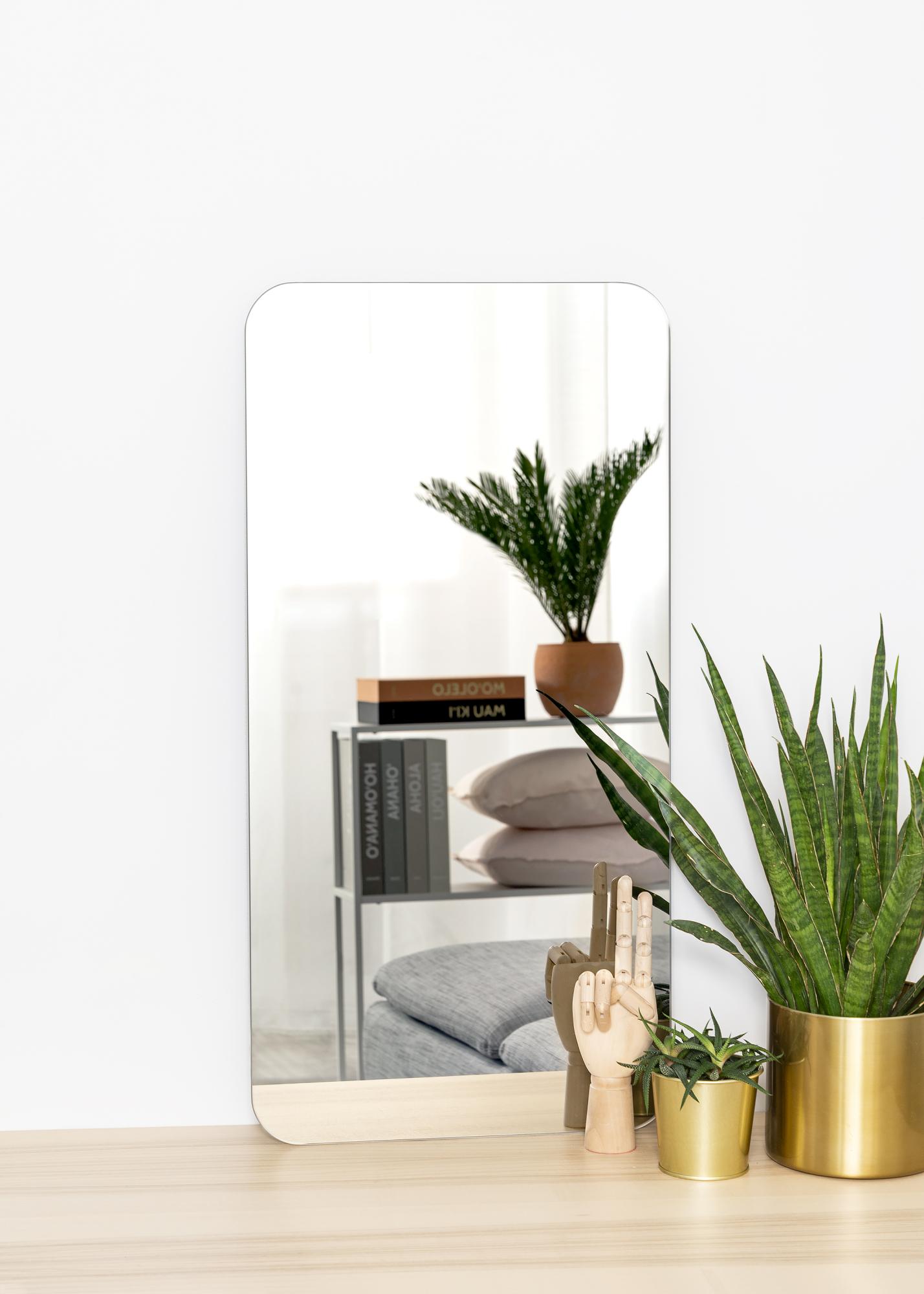 Este es un espejo rectangular con un toque especial: esquinas redondeadas que le aportan suavidad y elegancia en general. Además, el espejo es muy fino y no tiene marco, lo que le da una sensación minimalista.
