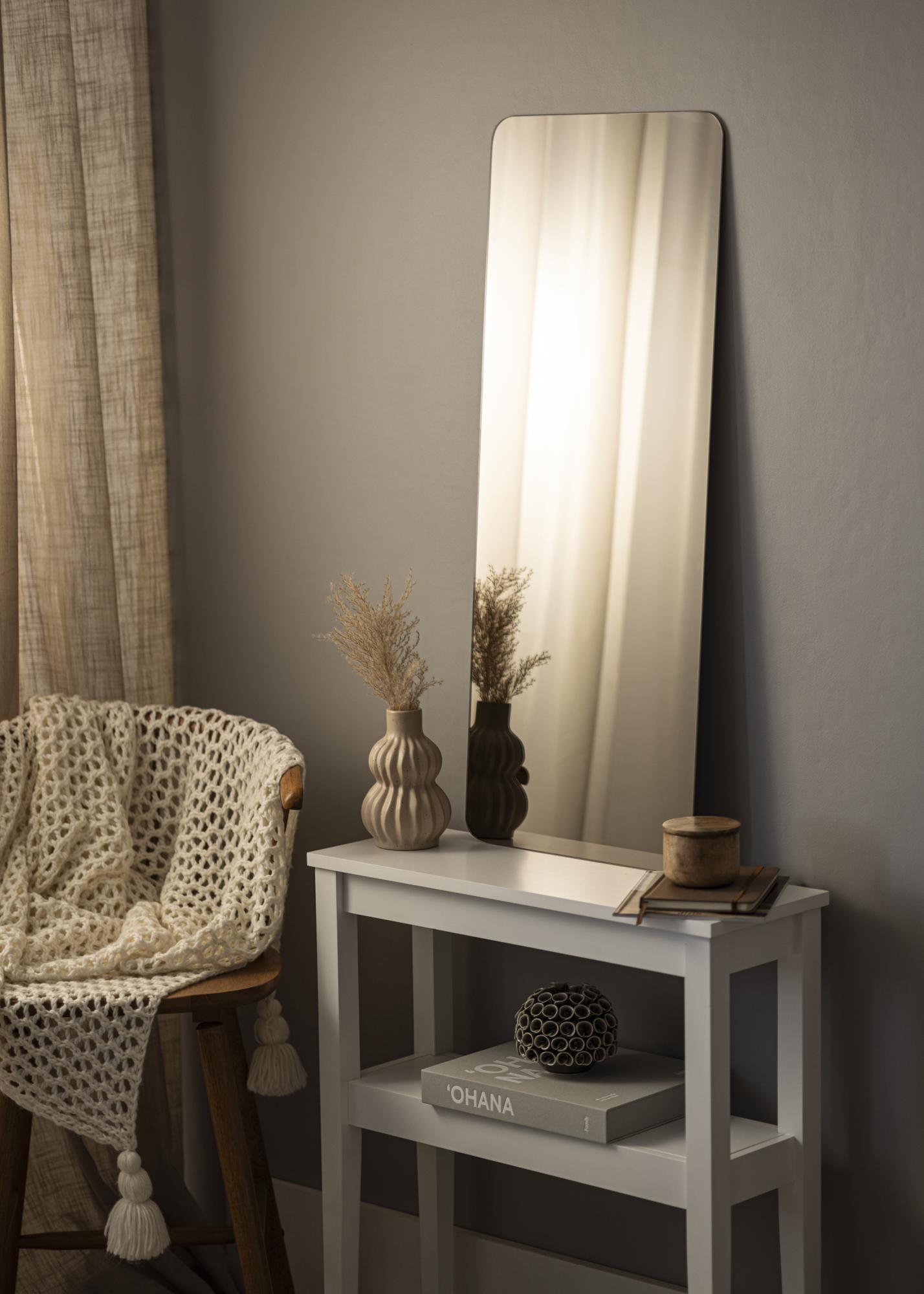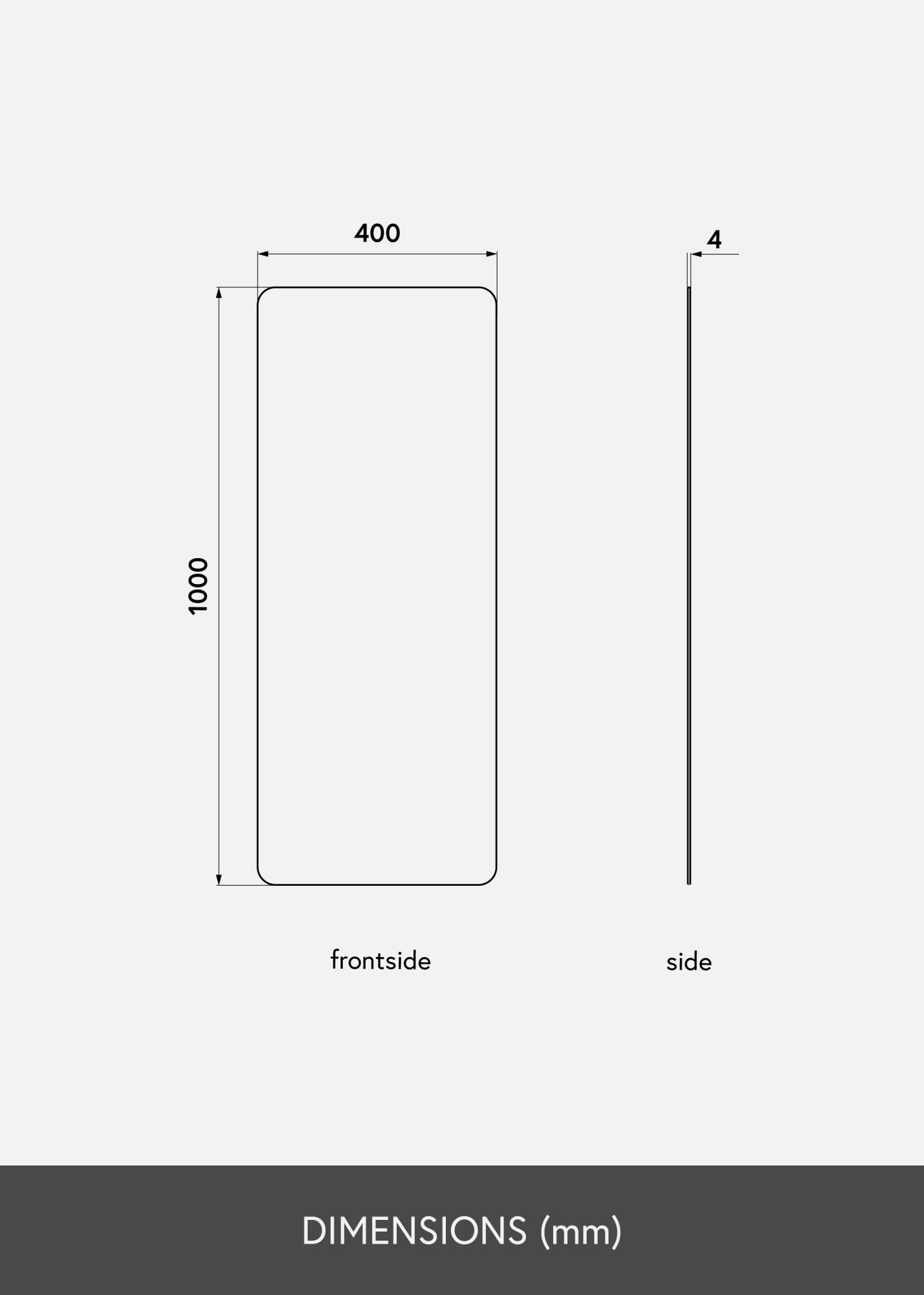 Este es un espejo rectangular con esquinas redondeadas decorativas que le dan una impresión suave y elegante. El vidrio del espejo está teñido en un tono elegante de bronce oscuro, lo que hace que este espejo sea un detalle decorativo y llamativo en tu hogar. Además, el espejo es muy fino y no tiene marco, lo que contribuye aún más a su sensación elegante y limpia.