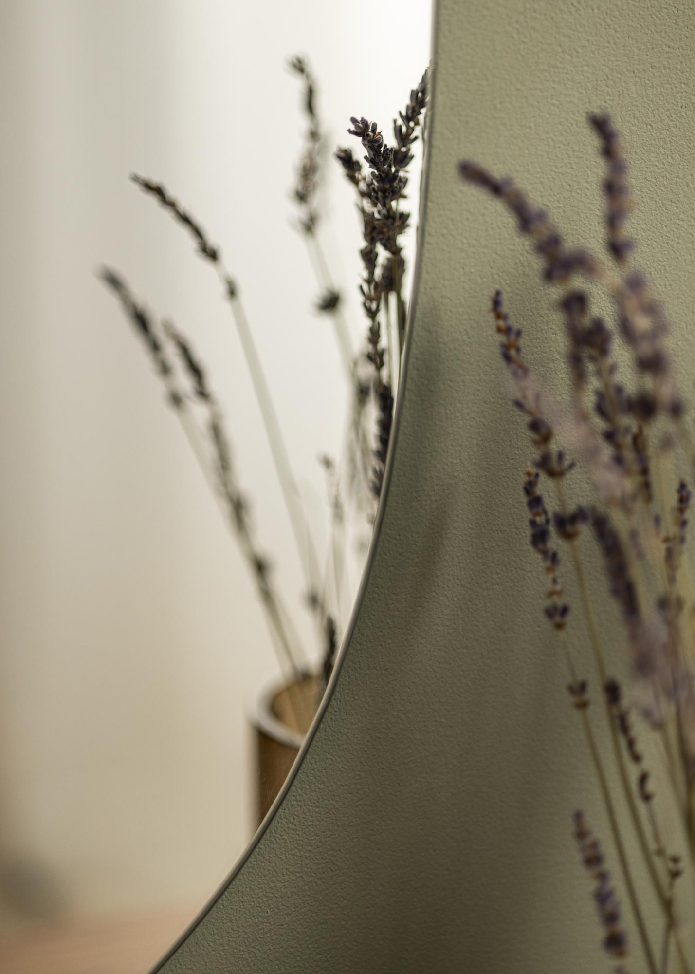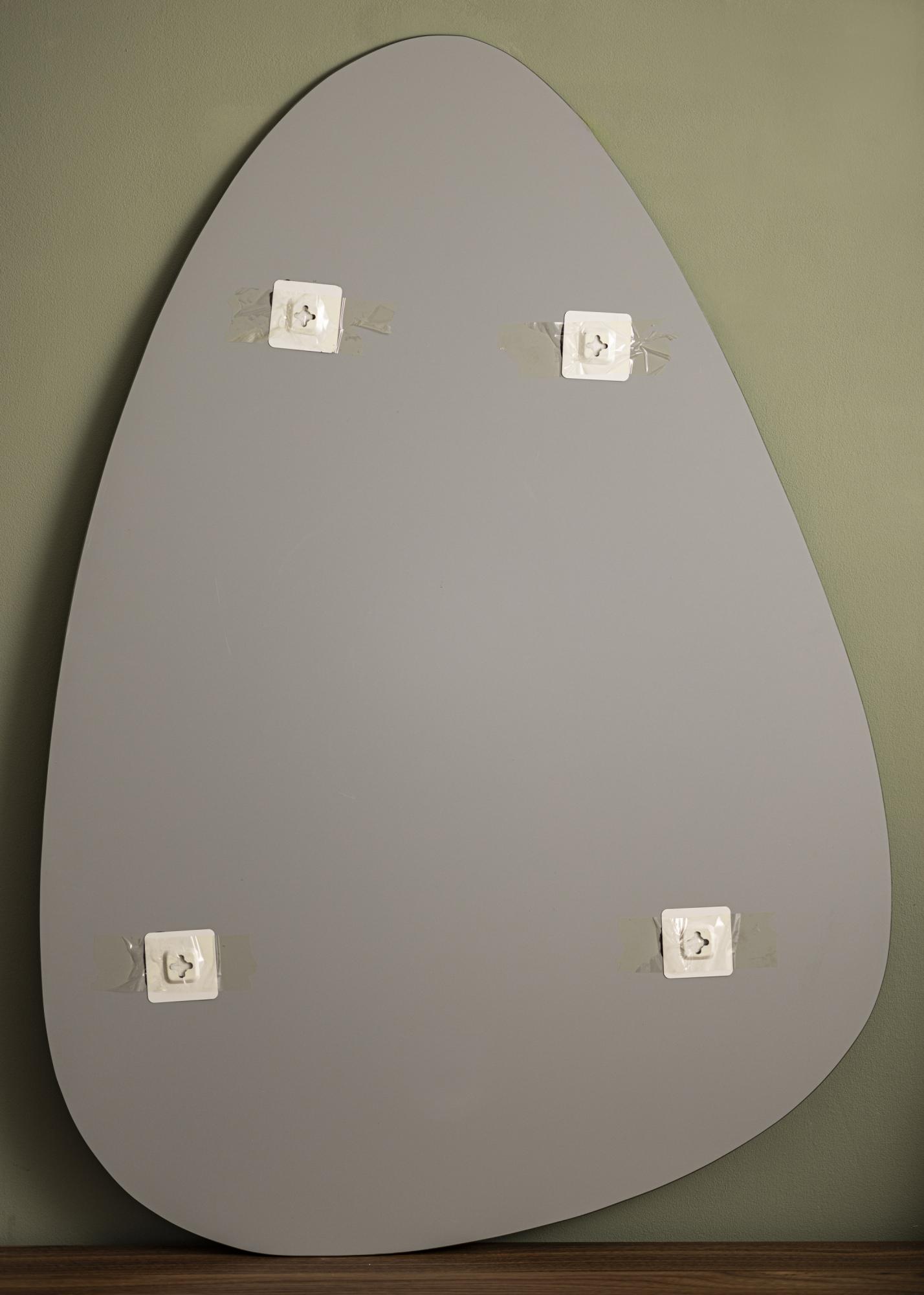 Este espejo tiene una forma moderna y asimétrica, casi como un huevo. Una forma suave y elegante que crea una atmósfera relajada y acogedora en la habitación en la que se encuentra. Además, el espejo es muy fino, lo que realza su aspecto elegante y elegante.