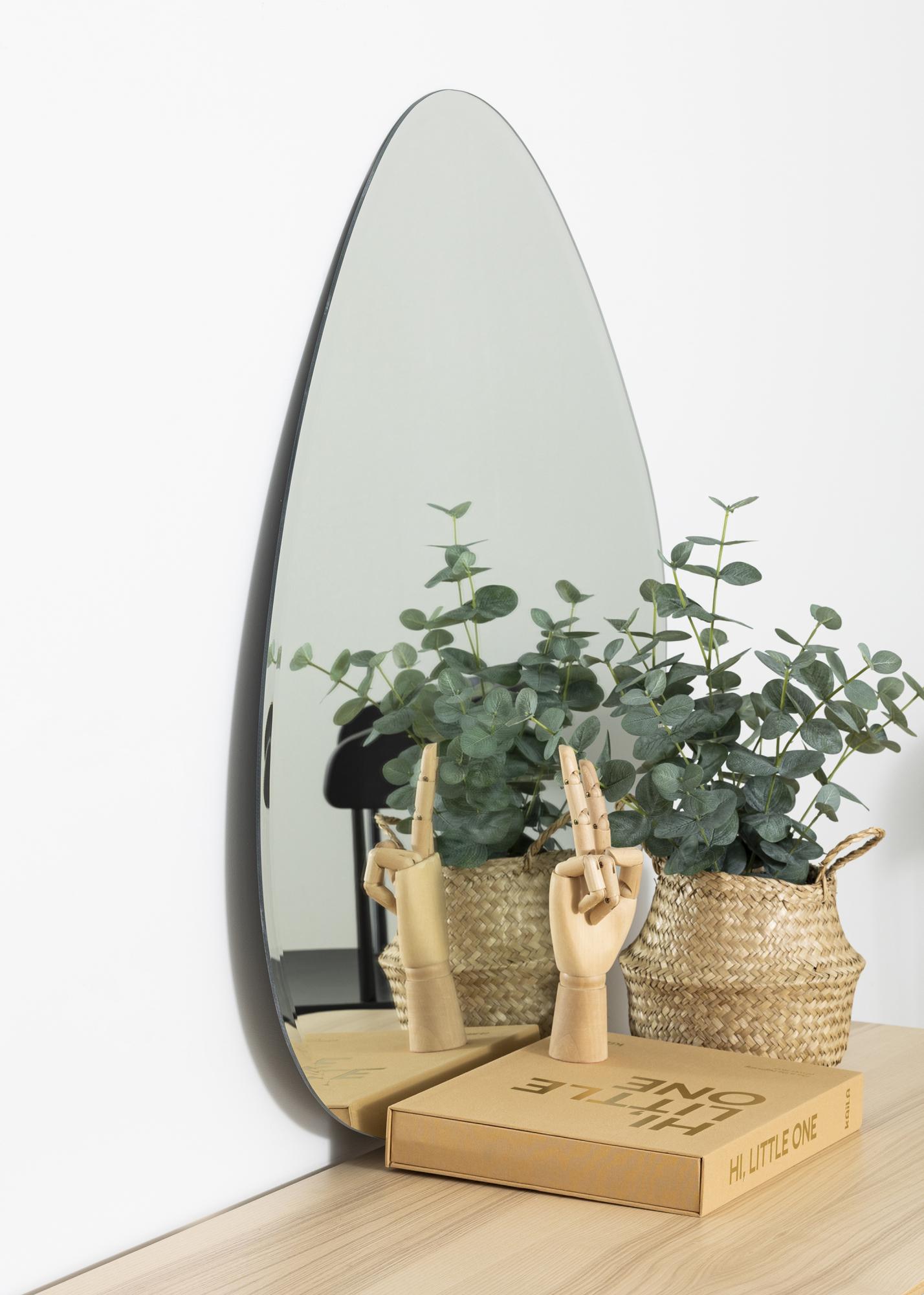 Este espejo de pared de KAILA tiene una elegante forma asimétrica que recuerda a una gota. El espejo es muy fino y no tiene marco, lo que, en combinación con el borde lujosamente facetado, refuerza aún más su aspecto elegante y moderno. Es un espejo de pared decorativo que seguramente llamará la atención en cualquier habitación en la que se Coloca, ya sea en la sala de estar, en el recibidor o en el dormitorio. El espejo tiene un tamaño de 70x81 cm.