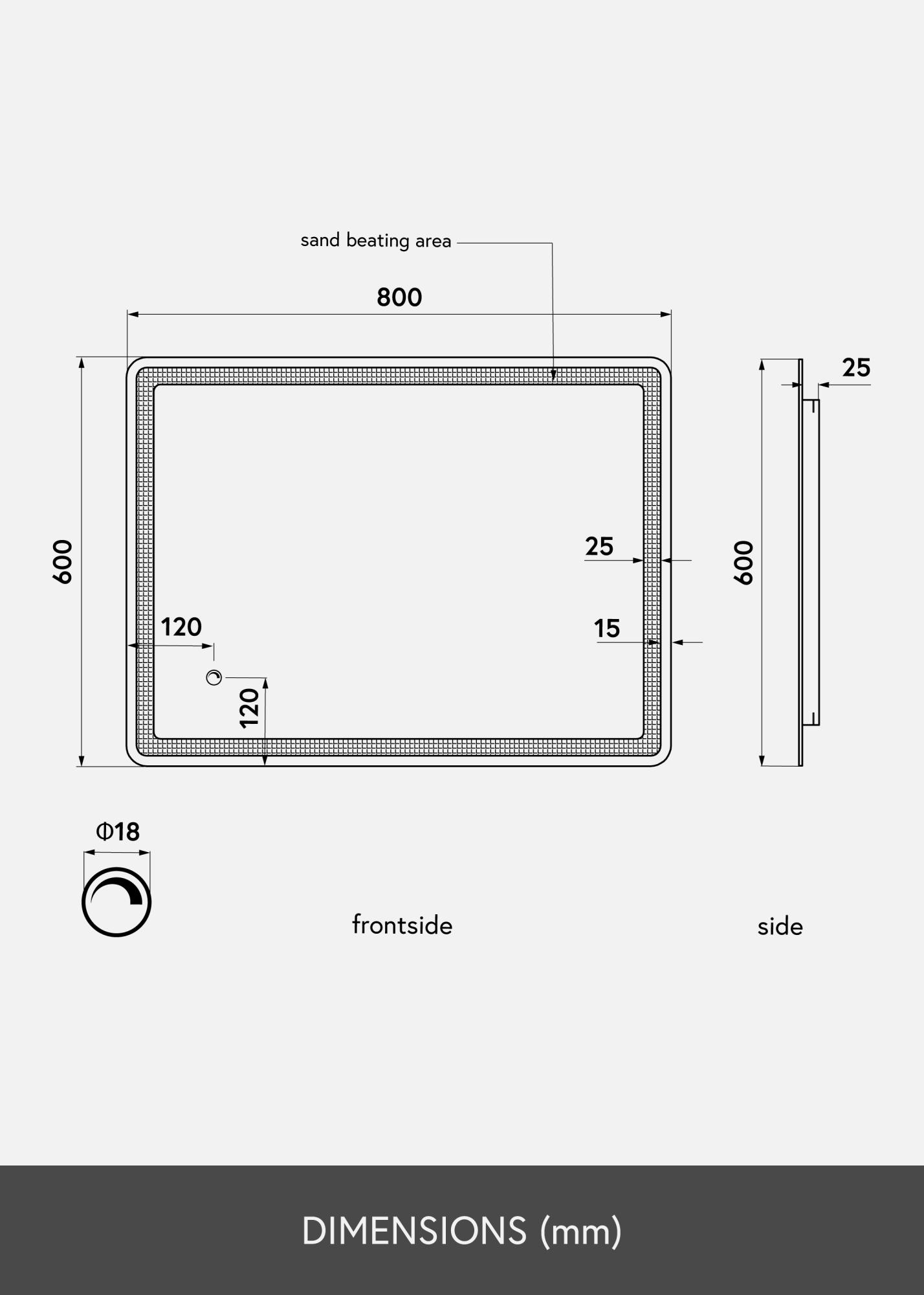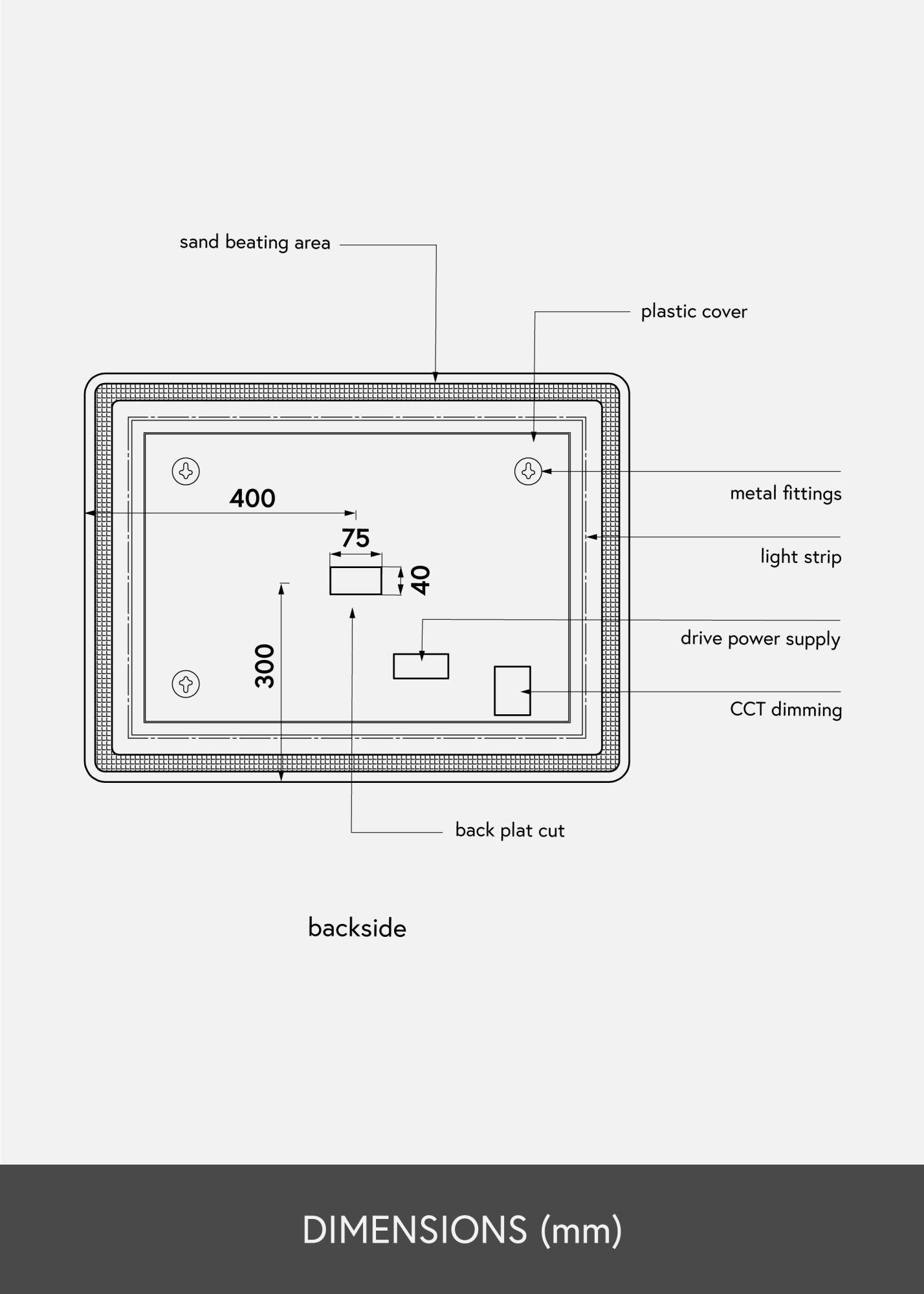 El espejo mide 60x80 cm y con los soportes de pared incluidos, puedes colocarlo tanto horizontal como verticalmente. El espejo está aprobado para baños. El espejo de baño está destinado a una instalación fija y se conecta a un interruptor de luz. Para que el espejo funcione correctamente, debe estar conectado a un interruptor de luz normal, no a un regulador de luz.