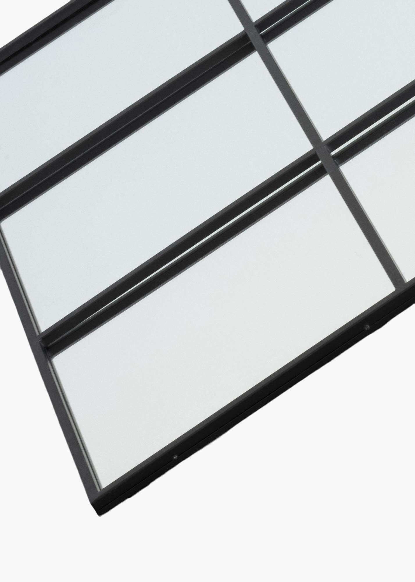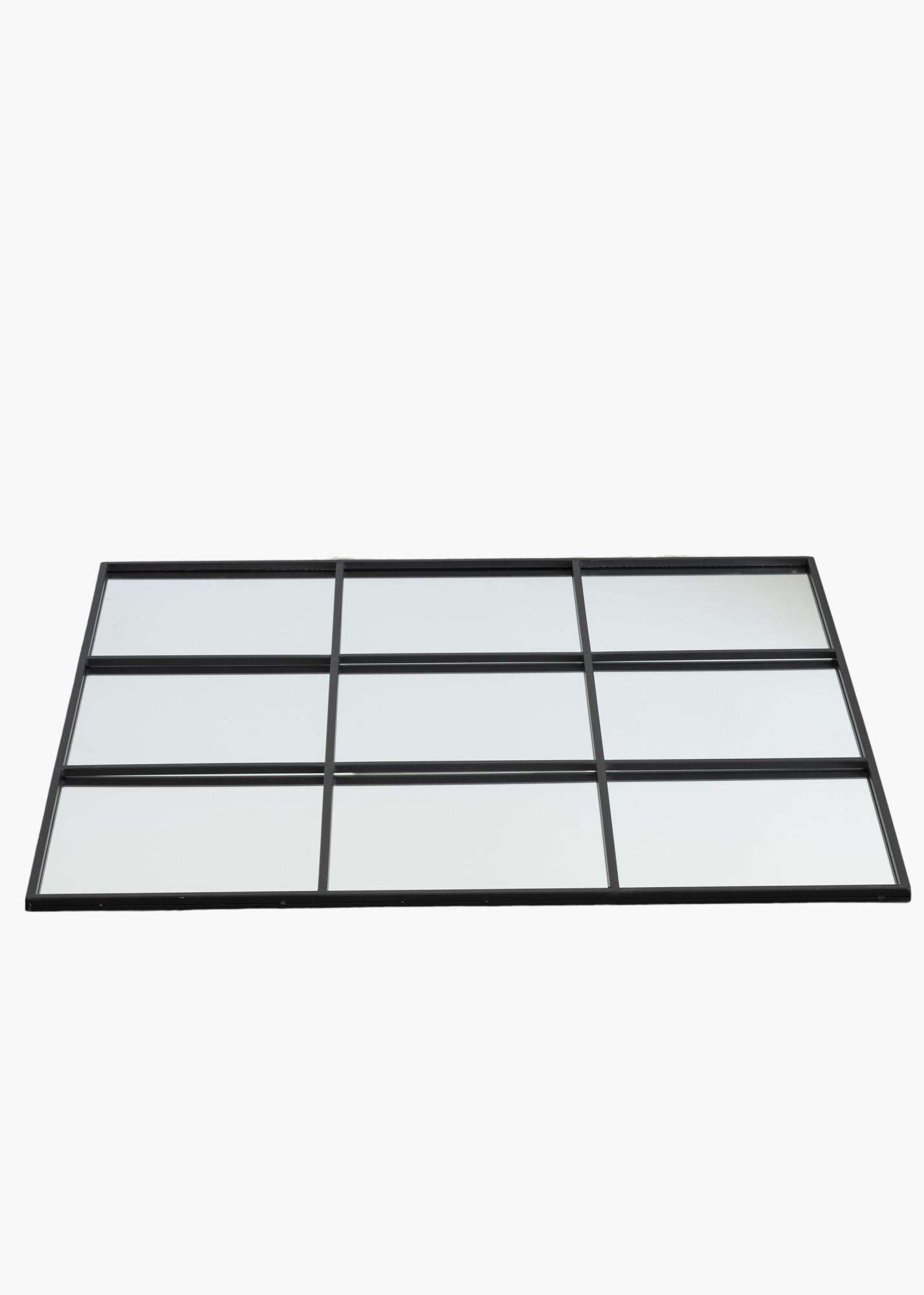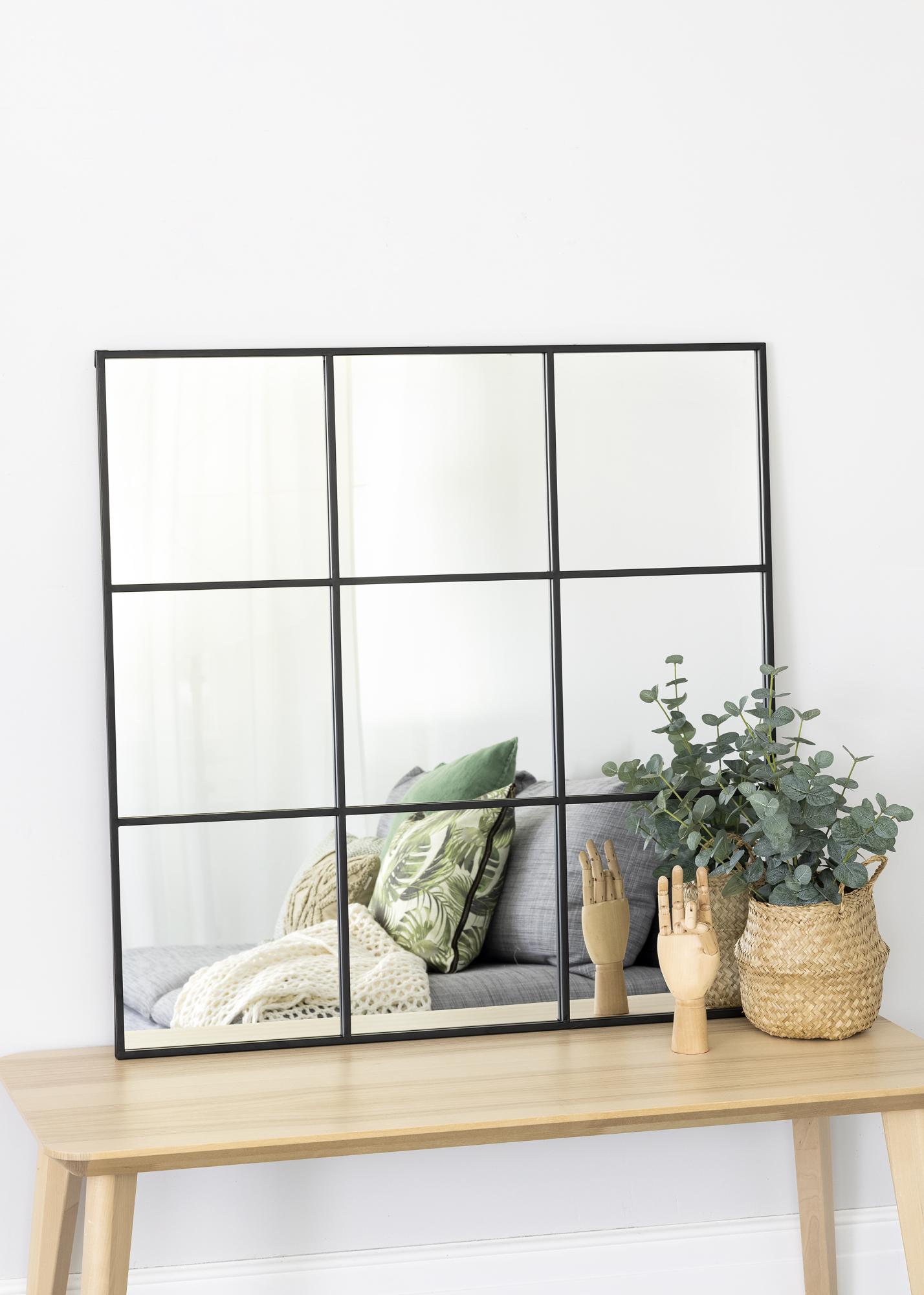 Este es un espejo en forma cuadrada con un elegante diseño de cuadros. Los cuadros están elegantemente enmarcados por líneas finas de metal negro que le dan a este espejo de pared un carácter rústico e industrial. La forma cuadrada le da al espejo un aspecto más elegante. Coloca este espejo en el recibidor, la cocina o el dormitorio, por ejemplo, para crear más espacio en la habitación y al mismo tiempo obtener un detalle decorativo. Viene con soporte de pared. El espejo mide 90x90 cm.